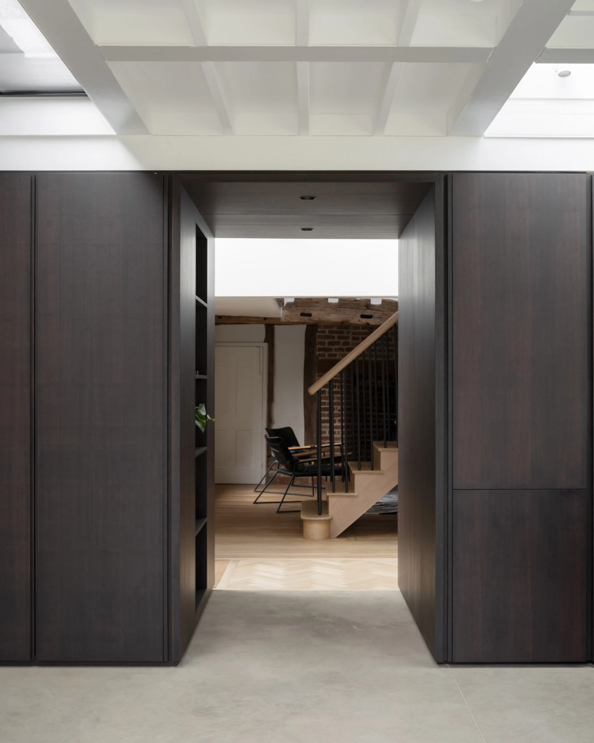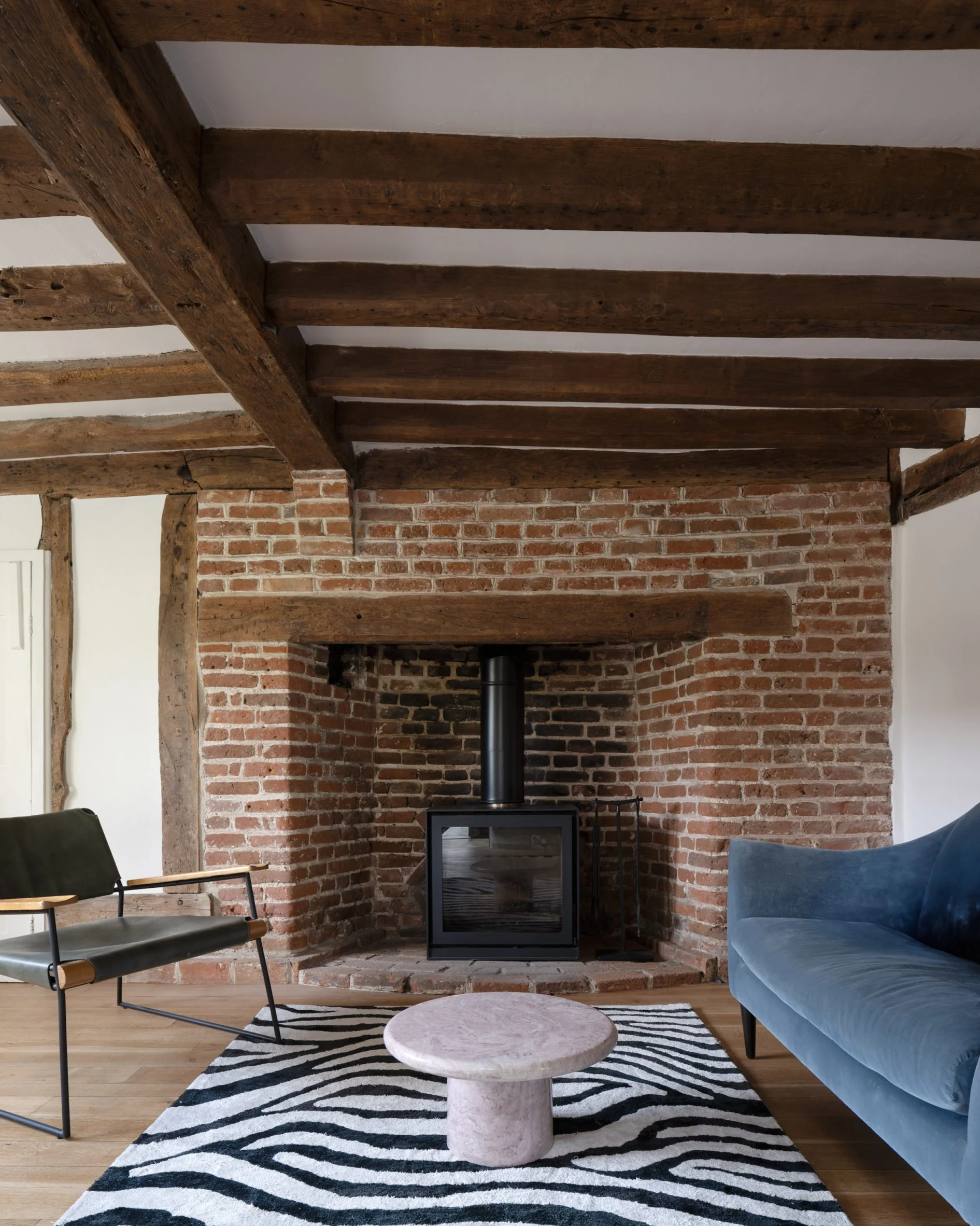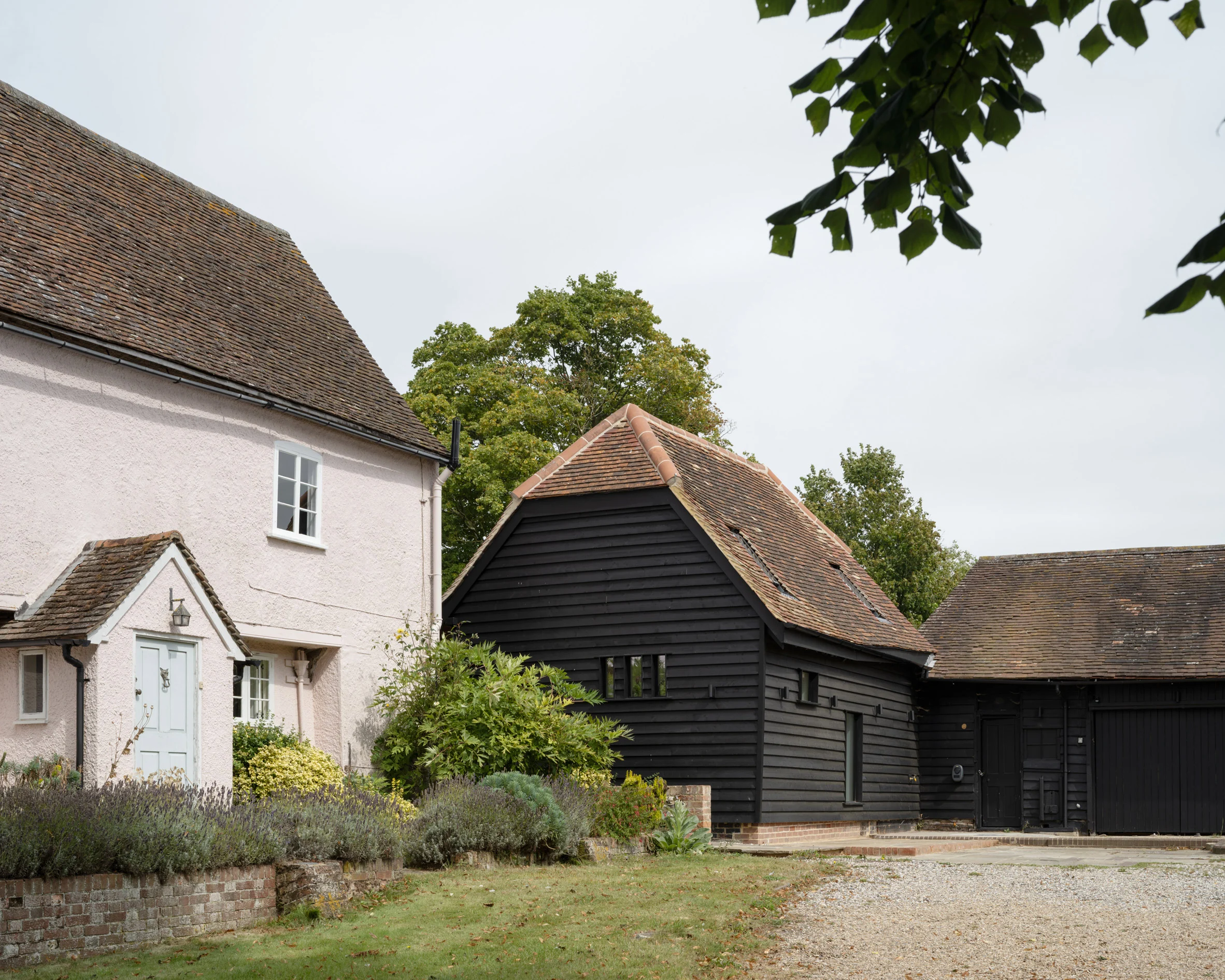 Dodatek o niskim profilu integruje się z otoczeniem za sprawą krzemiennego cokołu i stalowego dachu o geometrycznych kształtach, który odnosi się do gontów na czarnej stodole. Nowa rozbudowa poprawiła również funkcjonalność domu, tworząc płynne przejście między głównym budynkiem a przylegającą stodołą z XVIII wieku. W stodole odsłonięto historyczną konstrukcję drewnianą, dodano nowoczesne przeszklenie z widokiem na ogród i odnowiono elewację z czarnego drewna oraz dach z glinianych płytek.