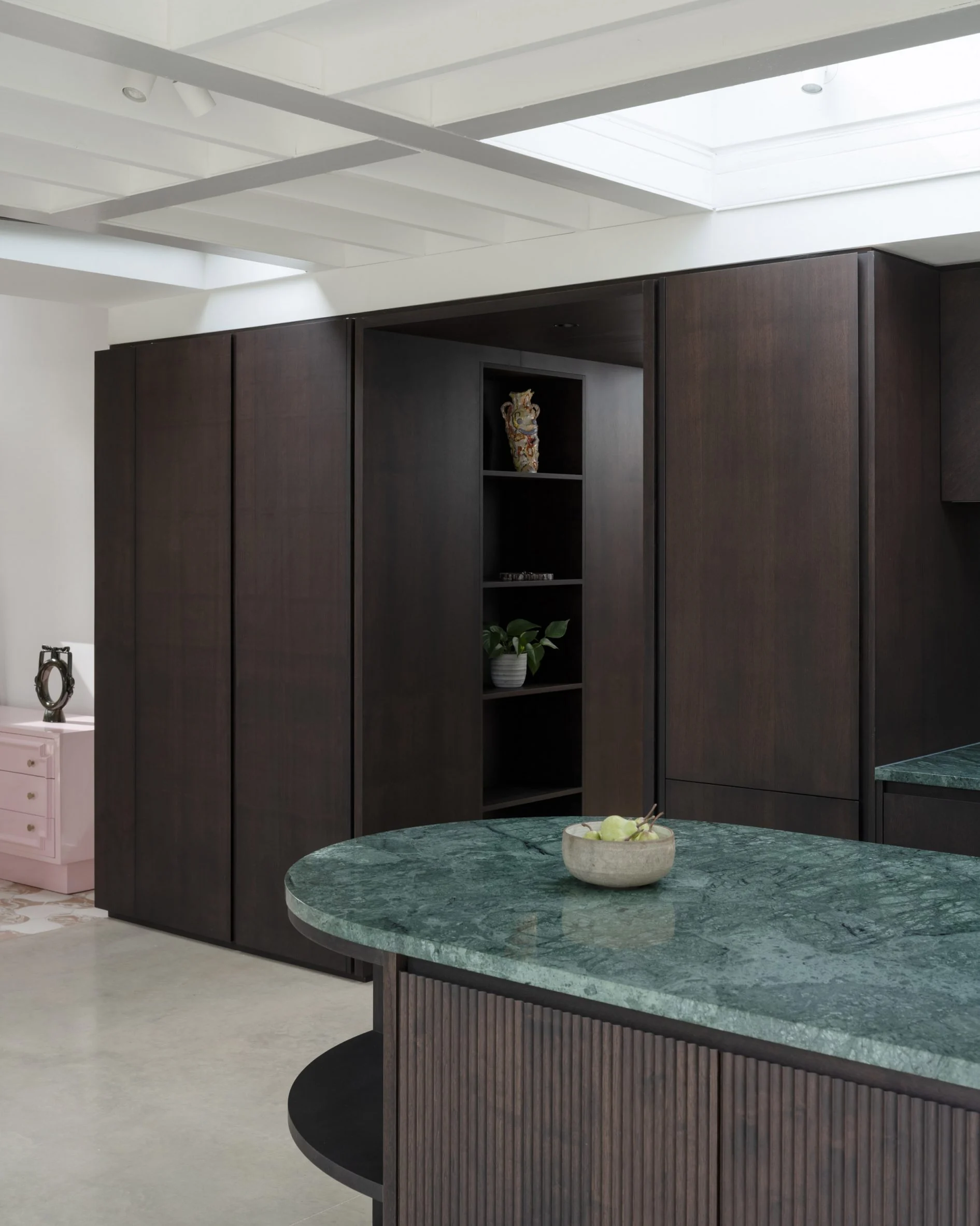 Wnętrza rozbudowy zaprojektowano z myślą o teksturach i naturalnych materiałach, takich jak polerowany beton, czernione drewno, dębowe elementy oraz akcenty z marmuru i terakoty. Ciekawym elementem projektu jest zabytkowa studnia, przekształcona w patio, które dodaje uroku zewnętrznej przestrzeni domu.