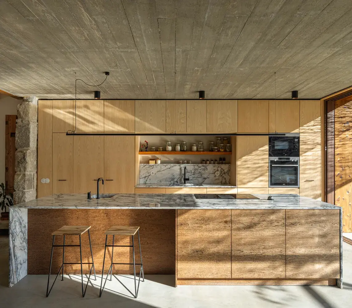 Kuchnia, usytuowana w sercu domu, służy jako centralne miejsce spotkań, bezpośrednio łączące się z otoczeniem. Przestrzeń tą specjalnie zaprojektowano na chwile jedności, co ułatwiają duże okna, które całkowicie się otwierają, zacierając granice pomiędzy wnętrzem i zewnętrzem. Na parterze obszary mieszkalne rozciągają się na zewnątrz, zapewniając idealne środowisko do przyjmowania gości. Rozkład przestrzeni uznano za praktyczny i elastyczny, łatwo dostosowujący się do potrzeb stale zmieniającej się rodziny. Sypialnie, zlokalizowane na wyższych piętrach, zaprojektowano z dbałością o wygodę i prywatność. Układ pozwala na adaptację przestrzeni, szczególnie w przypadku pokoi dziecięcych, które można łączyć, oferując wszechstronność i przestrzeń do zabawy.