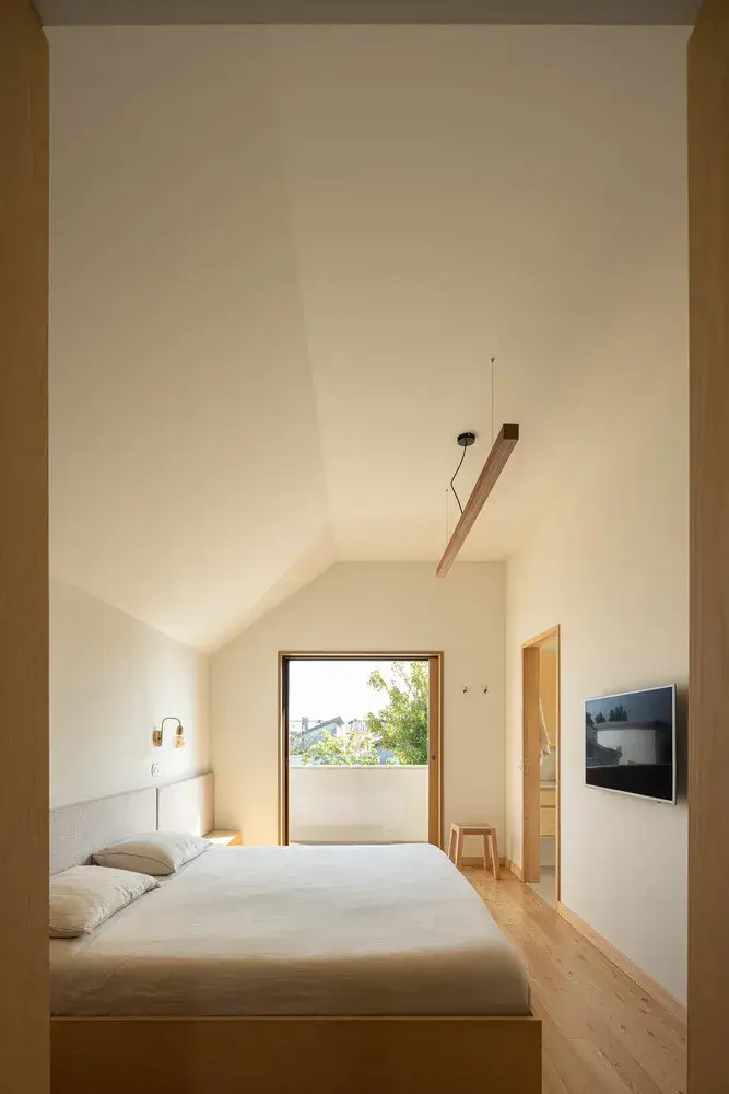 Dom zaprojektowano z poszanowaniem istniejącej konstrukcji, wykorzystując w pełni poprzednie bryły, aby w naturalny sposób zintegrować nowy program mieszkaniowy. Elewacja zachowała swój pierwotny wygląd. Wnętrze natomiast charakteryzuje się prostotą i wykorzystaniem surowców takich jak beton, drewno i białe ściany. Materiały te nie tylko podkreślają współczesną estetykę, ale także zapewniają intymne połączenie z ogrodem.