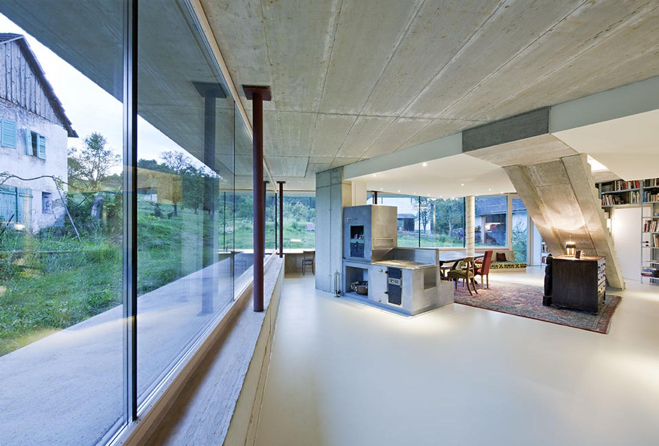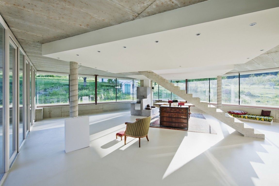 Właściciele mają bezpośredni dostęp do górnych kondygnacji i mogą wejść do odnowionej stodoły, zatrzymując się po drodze, by podziwiać wyjątkową perspektywę wnętrza domu. Choć na dachu dominuje forma, którą można określić jako nowoczesna stodoła, same przestrzenie mieszkalne są minimalistyczne, eleganckie i bardzo funkcjonalne. Główne strefy dzienne otaczają okna od podłogi po sufit, a w niektórych miejscach konstrukcja czerwonej stodoły pozostaje widoczna, tworząc intrygujący kontrast. To projekt dla osób odważnych, kreatywnych i z lekką nutą psotnej natury — zdecydowanie nie dla miłośników przewidywalnych rozwiązań.