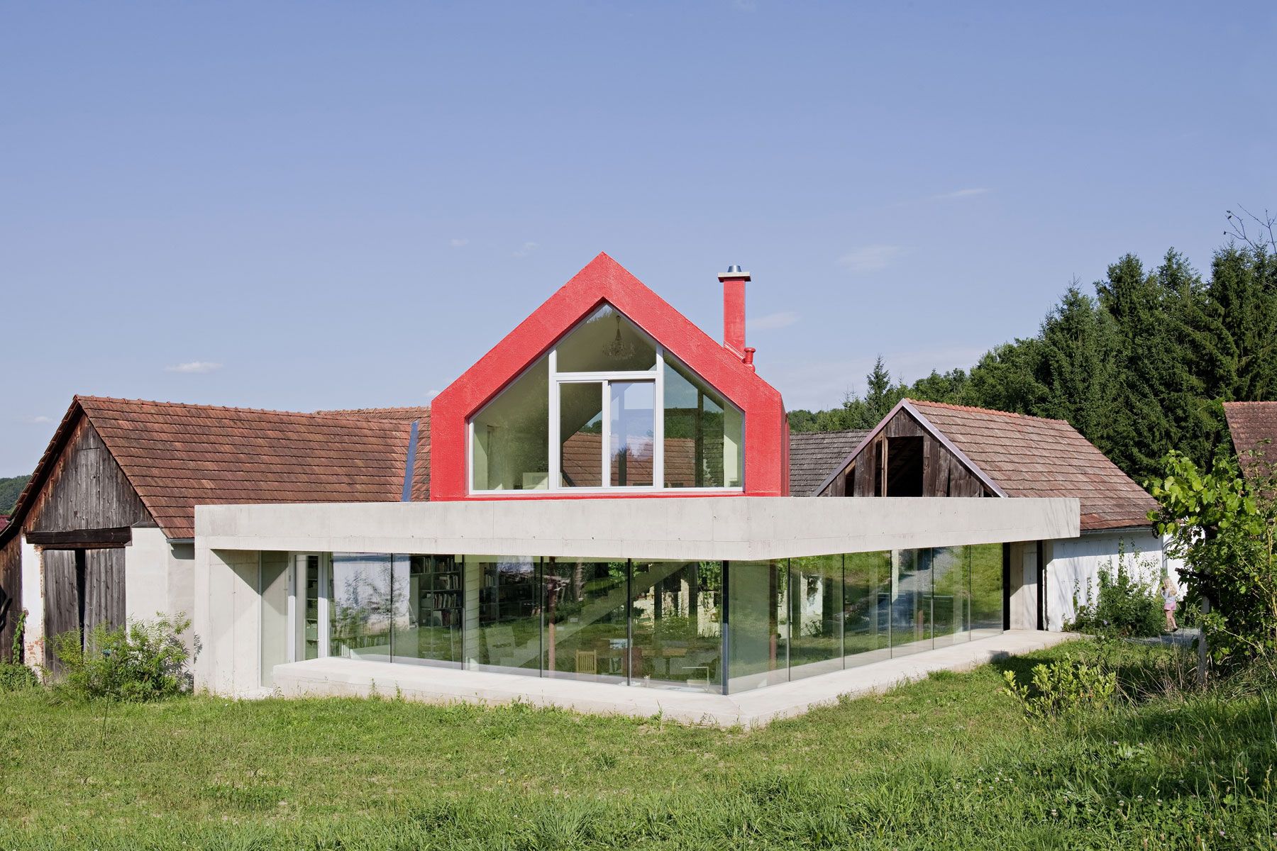Na szczycie niepozornego domu przysiadła ogromna, czerwona stodoła rodem z klasycznej amerykańskiej powieści. To nie przypadek, lecz przemyślany projekt pracowni Looping Architecture, który nadaje budynkowi unikalny charakter i wyróżnia go na tle współczesnej zabudowy. Choć forma przywodzi na myśl tradycyjną architekturę wiejską, pozory mylą – zewnętrzne ściany stodoły zostały usunięte i zastąpione nowoczesnymi szklanymi panelami. Dzięki temu dom zyskuje spektakularne doświetlenie, panoramiczne widoki oraz niezwykłą lekkość wizualną.