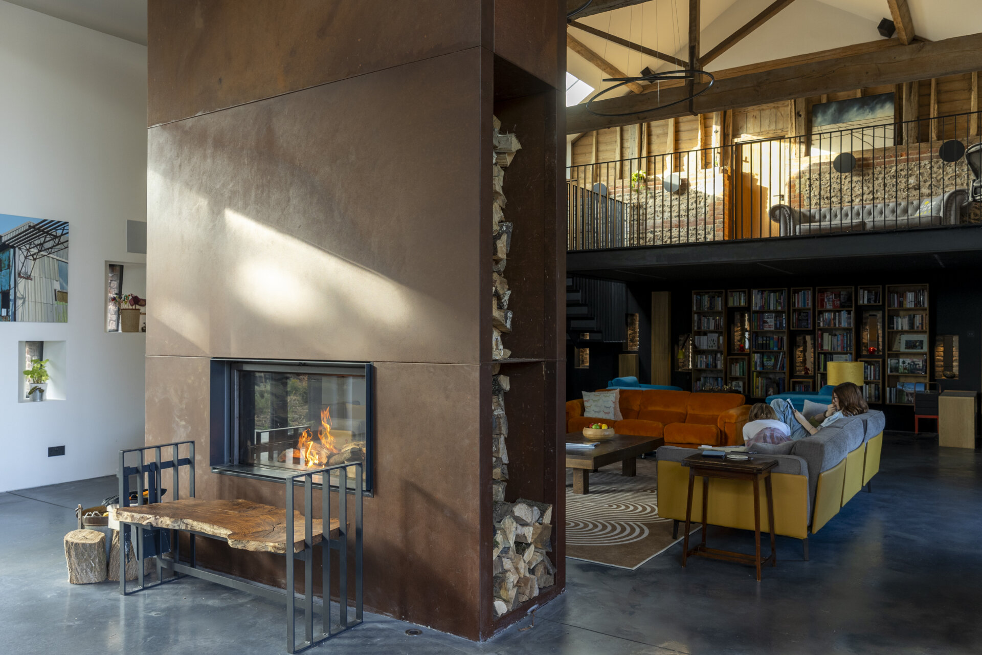 Od początku celem architektów było zachowanie duszy dawnej zabudowy gospodarczej. Wnętrza wciąż zdobią oryginalne ceglane mury i drewniane belki, które nadają przestrzeni teksturę i autentyczność. Przełamują je zdecydowane akcenty przemysłowe – stalowa klatka schodowa oraz rzeźbiarski kominek z kortenu, który nadaje ton całemu salonowi. Dzięki temu dom zachowuje równowagę między rustykalnym urokiem a nowoczesnym językiem formy.