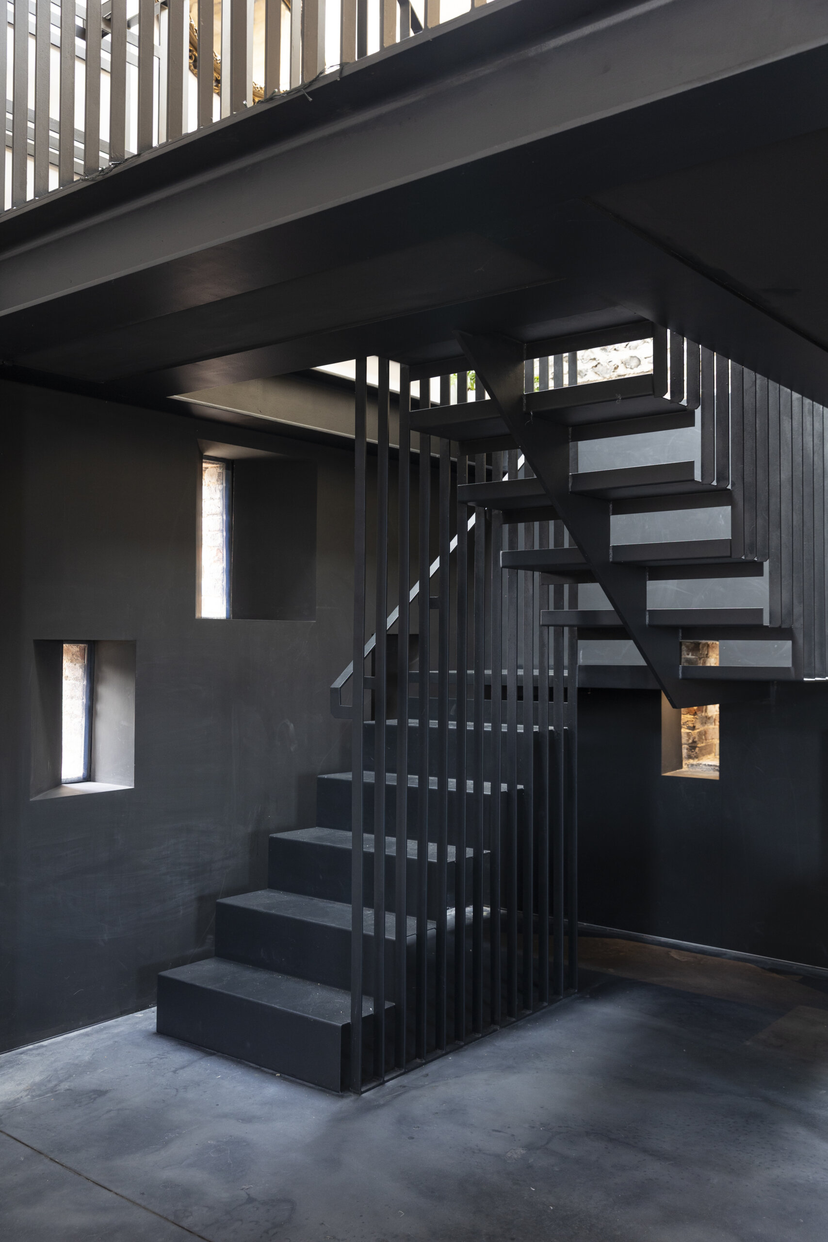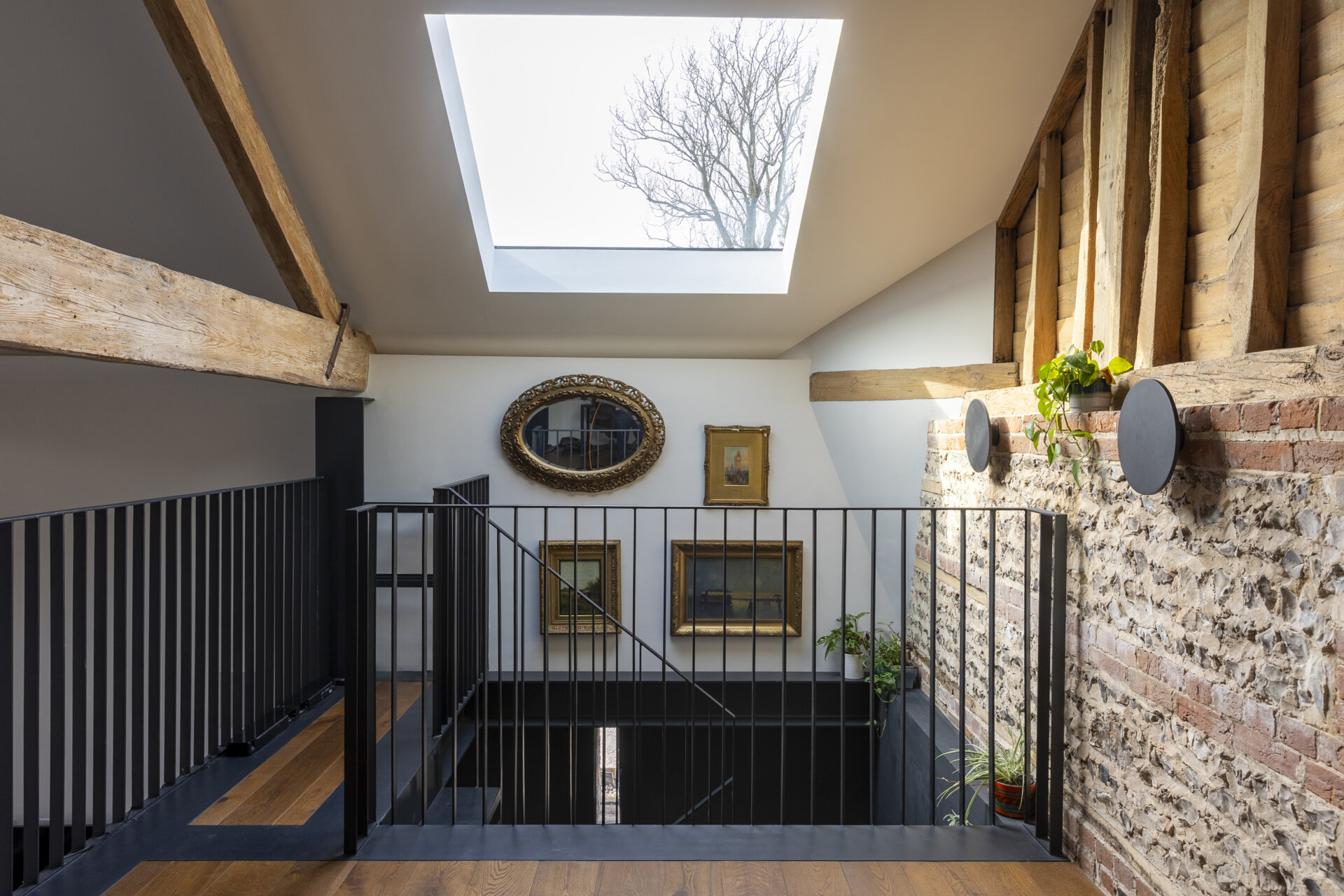Na zewnątrz dom łączy stare i nowe: cegłę, drewno i stal. Wewnątrz natomiast odbywa się nieustanny dialog materiałów – polerowany beton, czarna stal, ciepłe drewno i surowe mury tworzą warstwową kompozycję, w której światło odgrywa kluczową rolę. Przeszklenia kadrują widoki na okoliczne łąki, a świetliki podkreślają geometrię przestrzeni. Dwupoziomowy salon z zawieszoną antresolą pozwala odczuć skalę dawnego budynku i wprowadza światło do jego najgłębszych partii.
