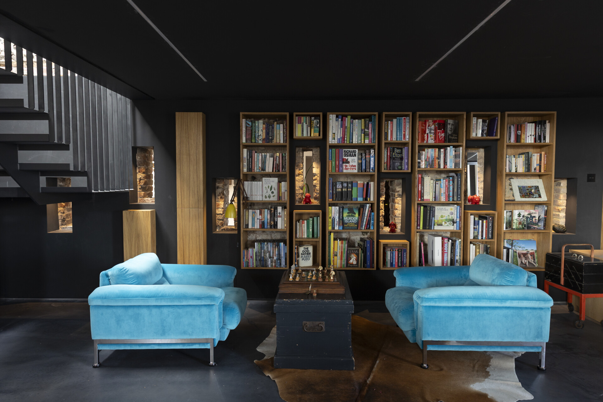 Salon z kominkiem płynnie przechodzi w jadalnię i kuchnię, które zaprojektowano z myślą o codziennej funkcjonalności. Minimalistyczne wykończenia w połączeniu z indywidualnie zaprojektowanymi meblami i ciepłymi akcentami drewnianymi tworzą harmonijną, ale zdecydowaną całość. Obok znajduje się biblioteka – zaciszna przestrzeń z matowymi czarnymi ścianami i subtelnym światłem dziennym, która zaprasza do wyciszenia.