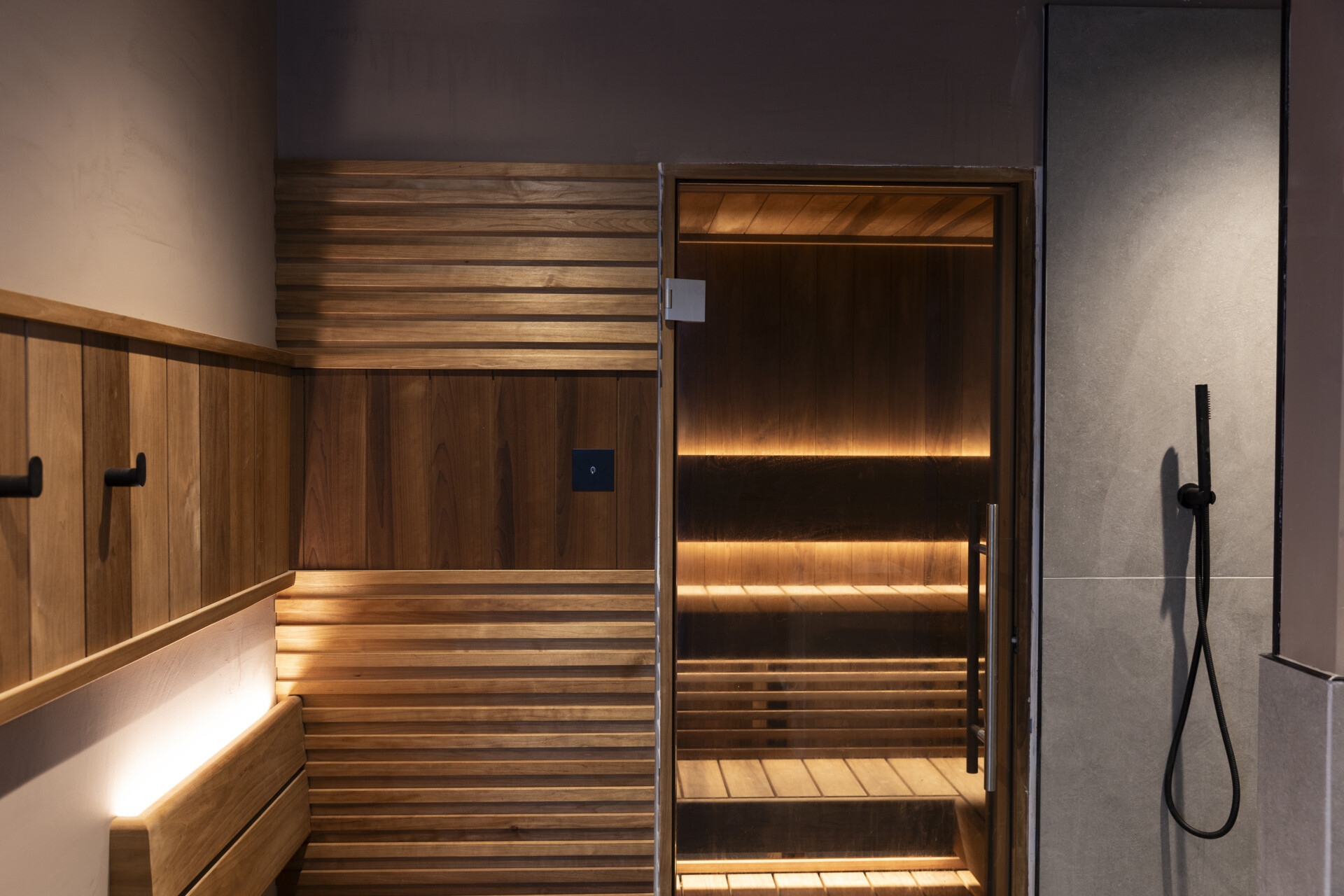 Na piętrze znajduje się rodzinny pokój dzienny i strefa multimedialna – przestrzeń mniej formalna, zaprojektowana z myślą o relaksie. Wypełniają ją nowoczesne meble, miękkie tkaniny i przyjazna atmosfera. W osobnej części domu ukryto również saunę – miejsce odprężenia i oddechu, które uzupełnia domową przestrzeń o wymiar wellness. W tym projekcie styl życia inwestorów został wpisany w strukturę architektoniczną – od przestrzeni wspólnych po kameralne strefy prywatne.