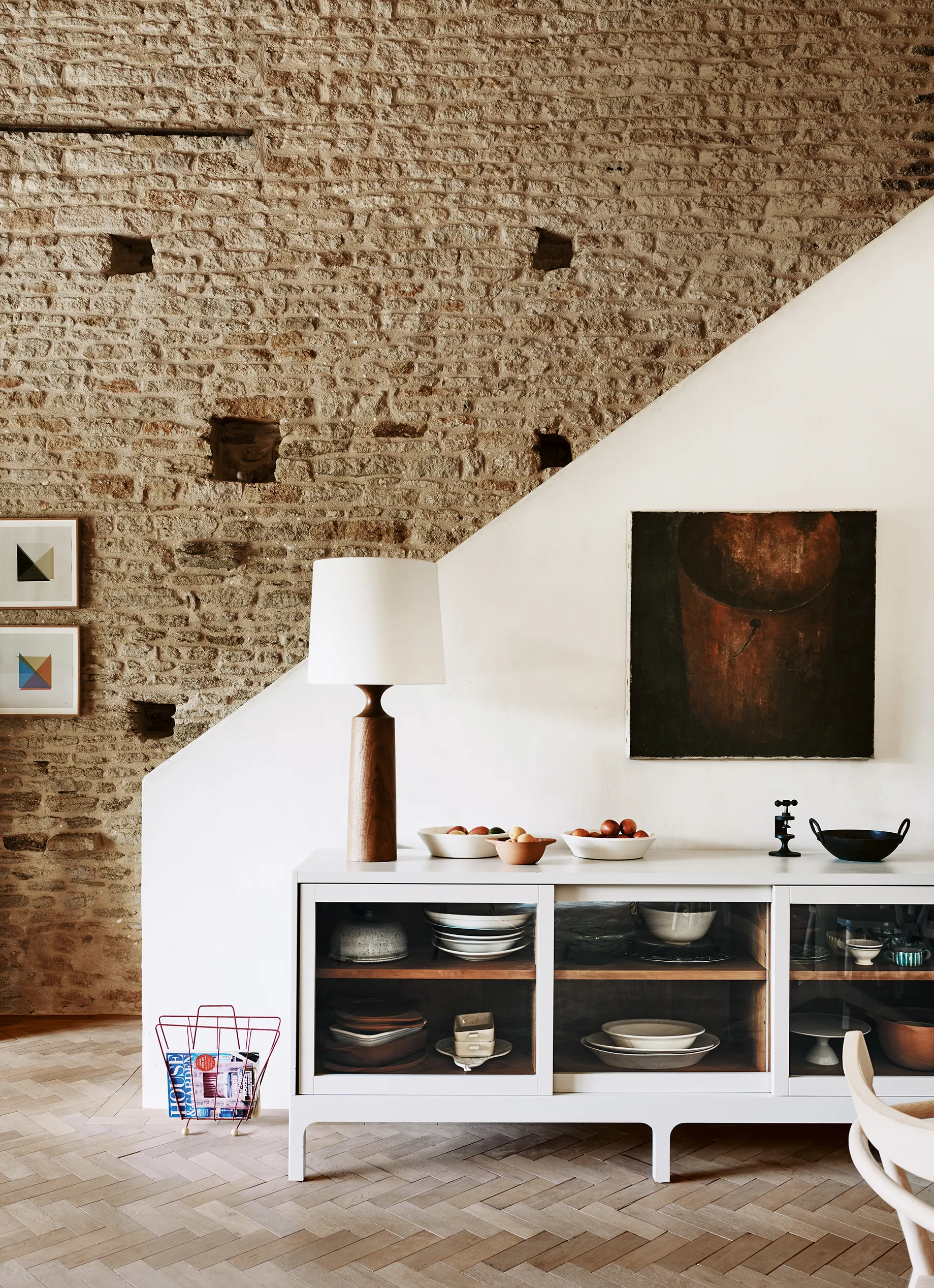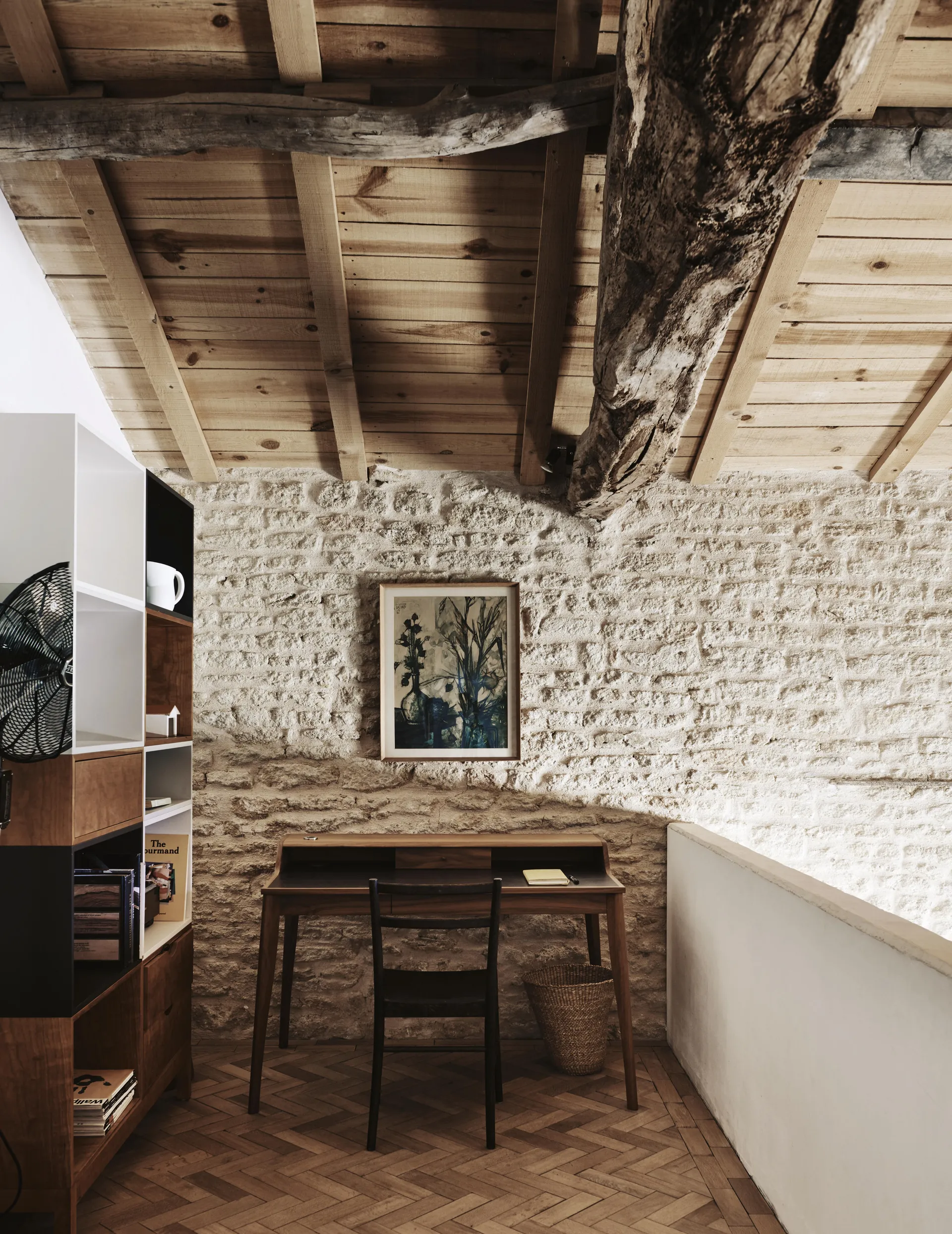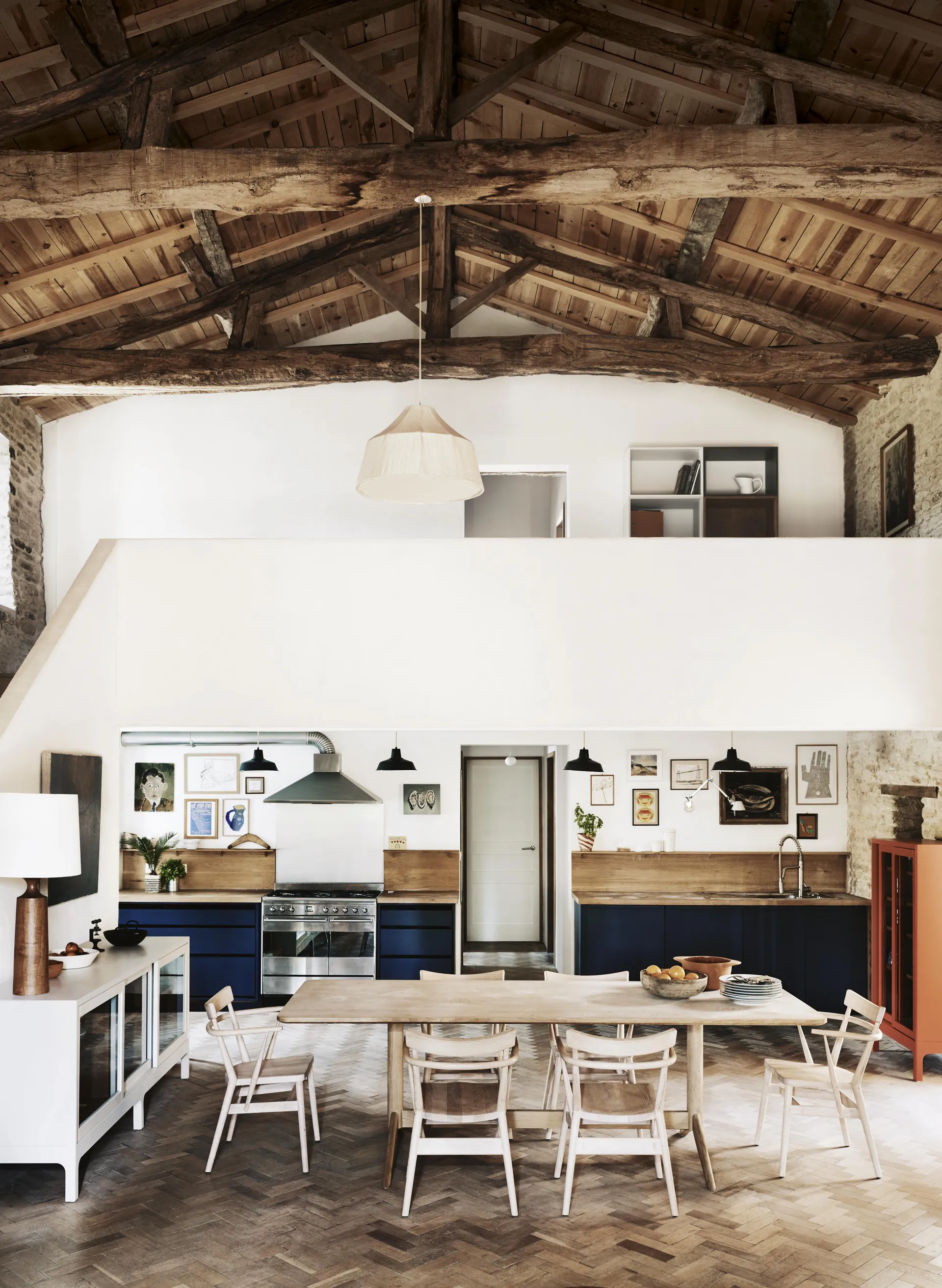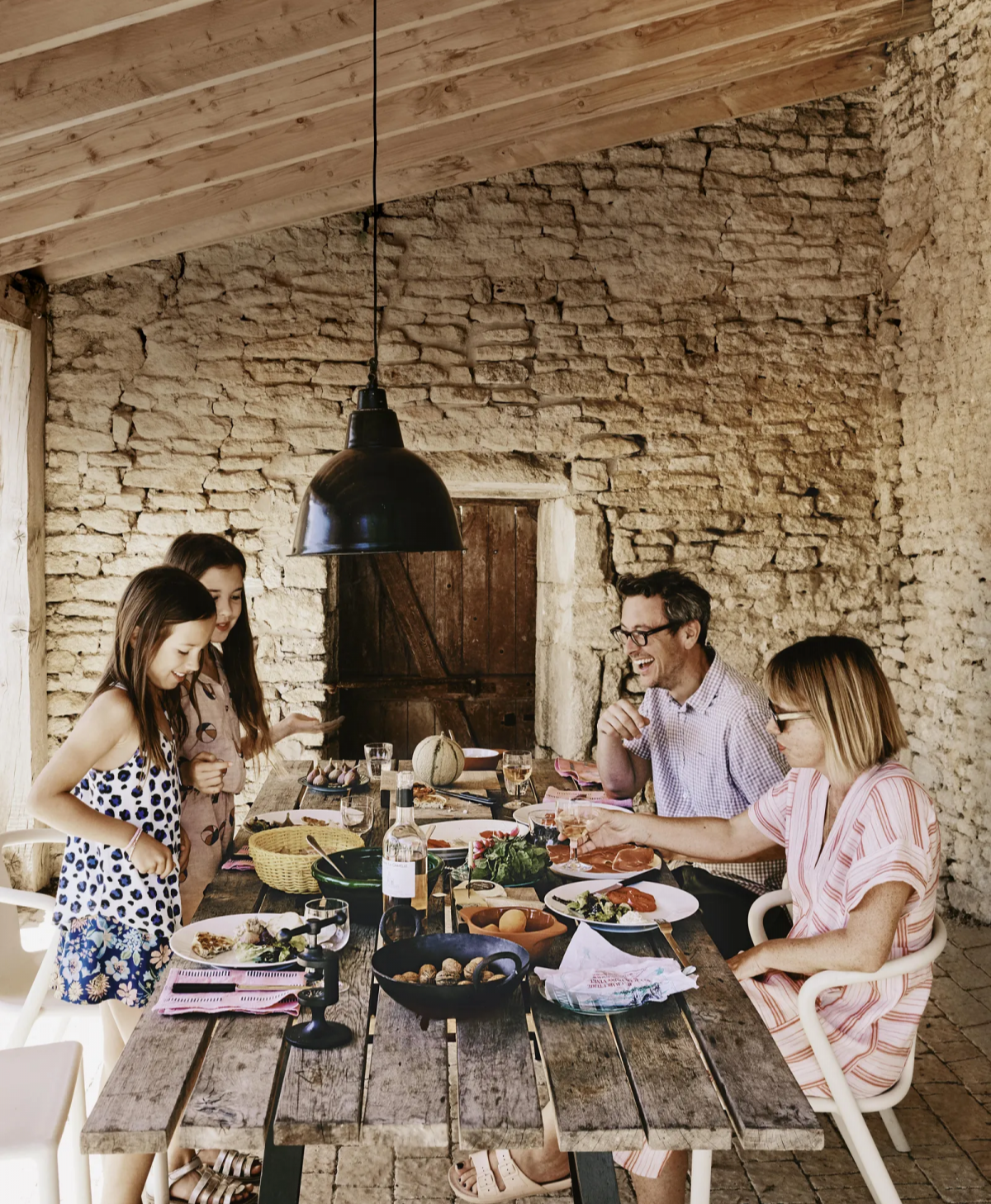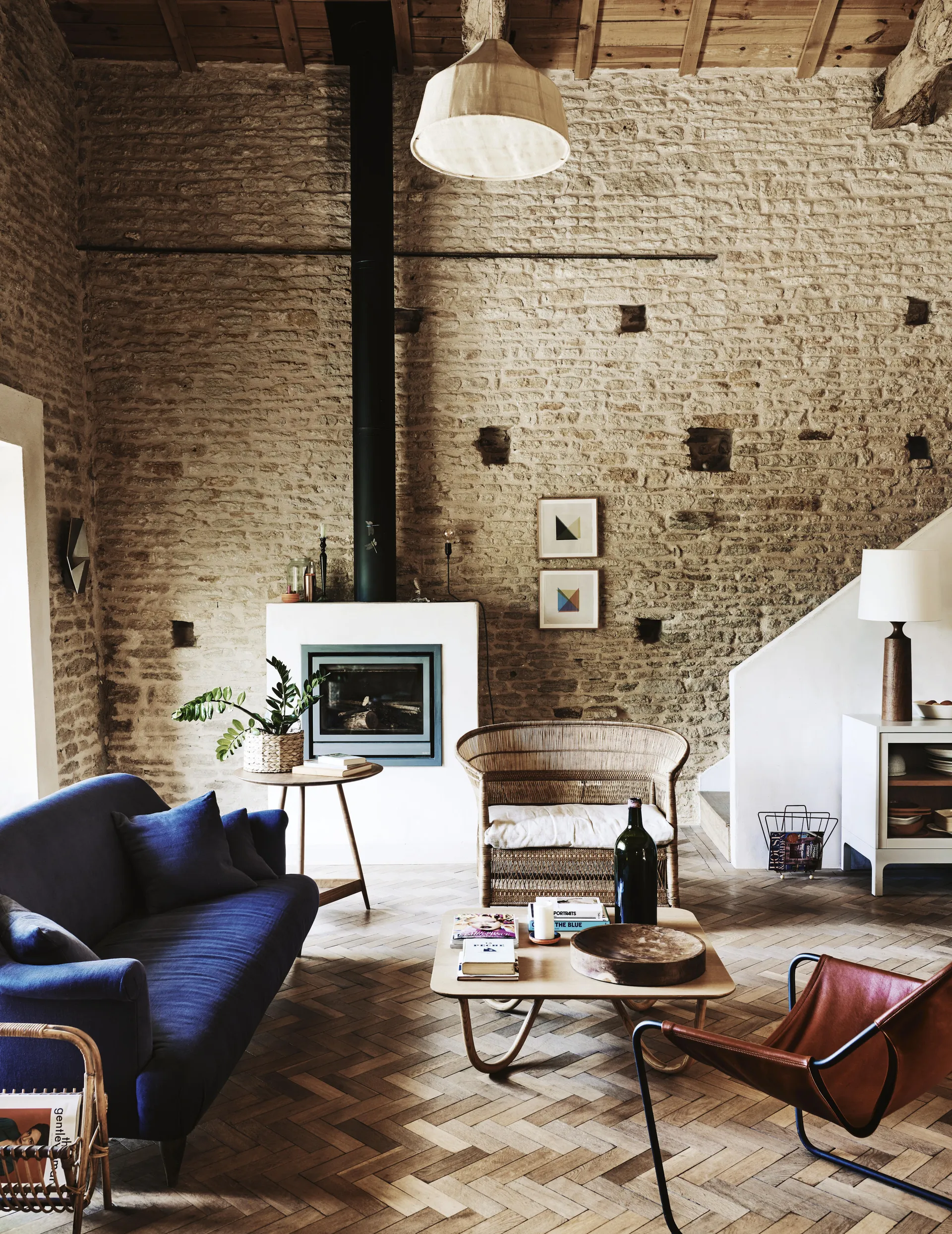Ostatecznie zniszczona stodoła trafiła w ręce Russella i Oony. Ich wizją było stworzenie francuskiego domu wakacyjnego z duszą, ale i nowoczesnym podejściem do projektowania. Wnętrza wypełniono eleganckimi meblami z ich autorskiej kolekcji PINCH – łączącymi ponadczasowy styl, naturalne materiały i prostotę formy.