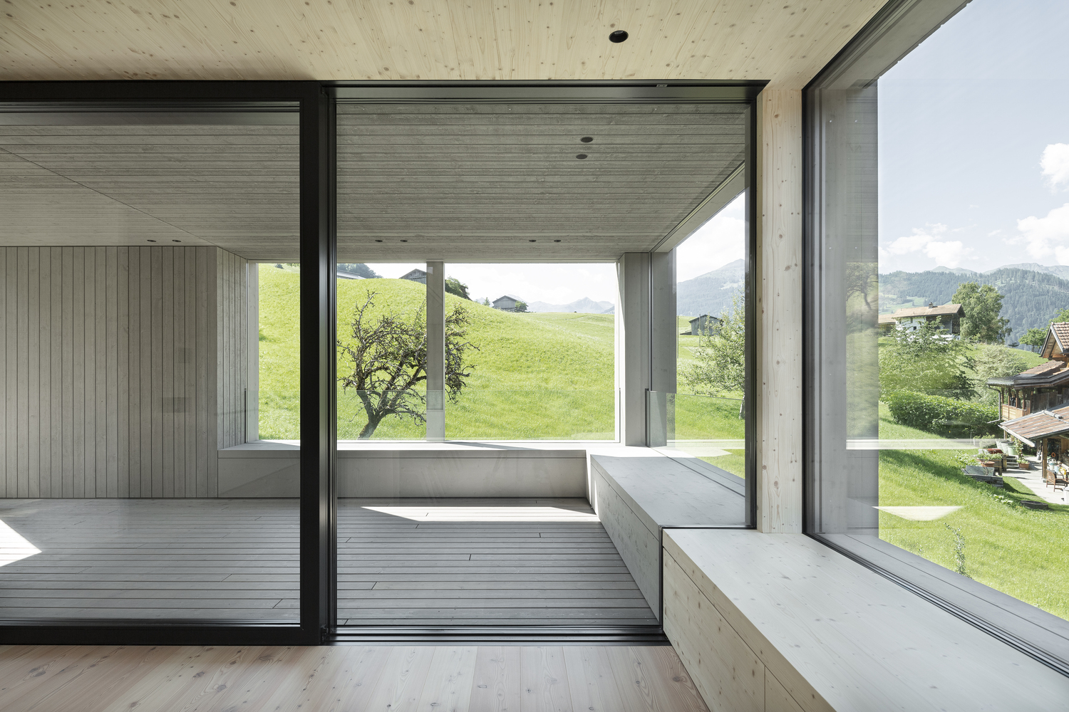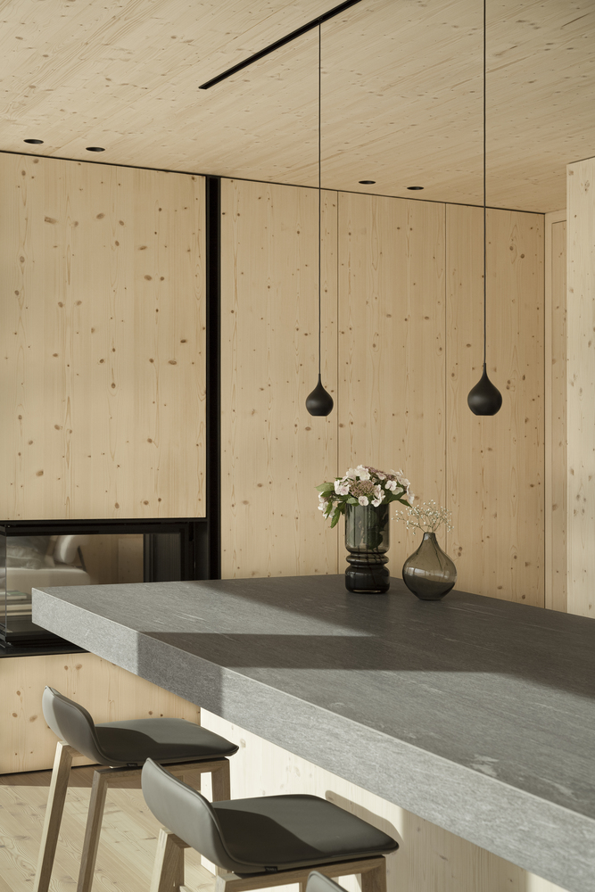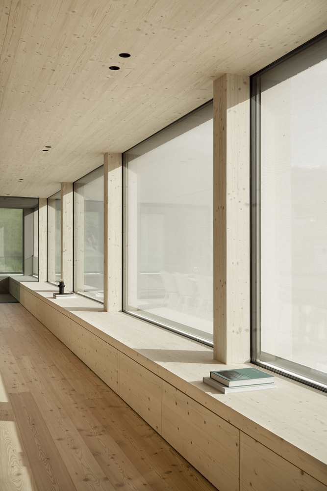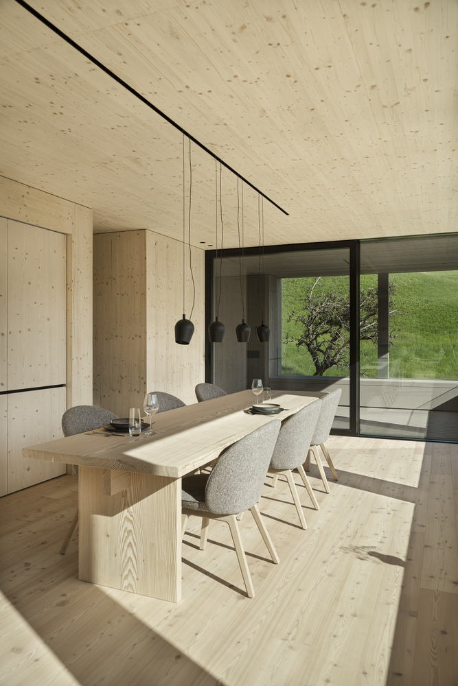 Ta minimalistyczna, a jednocześnie funkcjonalna bryła nawiązuje do lokalnego dziedzictwa, zachowując przy tym wszystkie zalety współczesnego budynku mieszkalnego. Wszystkie pomieszczenia zostały dokładnie zaplanowane i dostosowane do ich funkcji – z maksymalnym wykorzystaniem światła dziennego oraz panoramicznych widoków na alpejski krajobraz. Nowoczesny strych mieści główną część mieszkalną – otwartą, jasną i przestronną. To właśnie stąd można podziwiać rozległe widoki szwajcarskiego krajobrazu. Zadaszony taras zintegrowany z bryłą budynku umożliwia płynne przejście do ogrodu, stanowiąc jednocześnie naturalne przedłużenie przestrzeni dziennej.