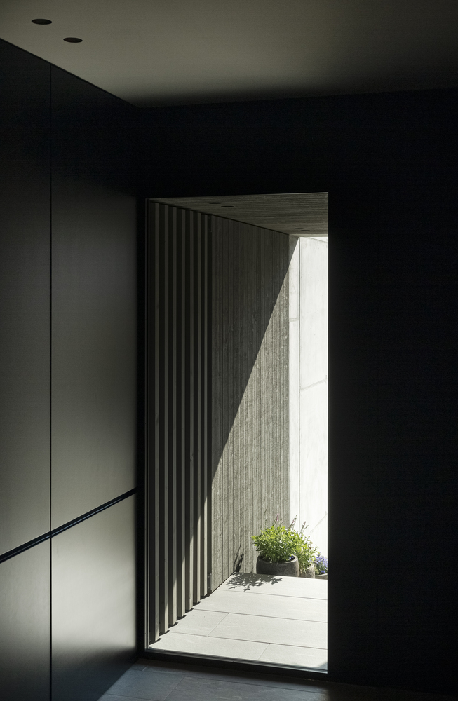 Na parterze zlokalizowano prywatne pomieszczenia, tworzące intymną strefę domowników. Filtry elewacyjne oraz przeszklenia od podłogi do sufitu pełnią funkcję ochrony przeciwsłonecznej i zapewniają dodatkową głębię wizualną wnętrz. Elewację budynku pokrywają surowe, masywne drewniane szalunki, które zostały wstępnie poszarzałe, co wpisuje się w założenia naturalnej, ekologicznej i minimalistycznej architektury.