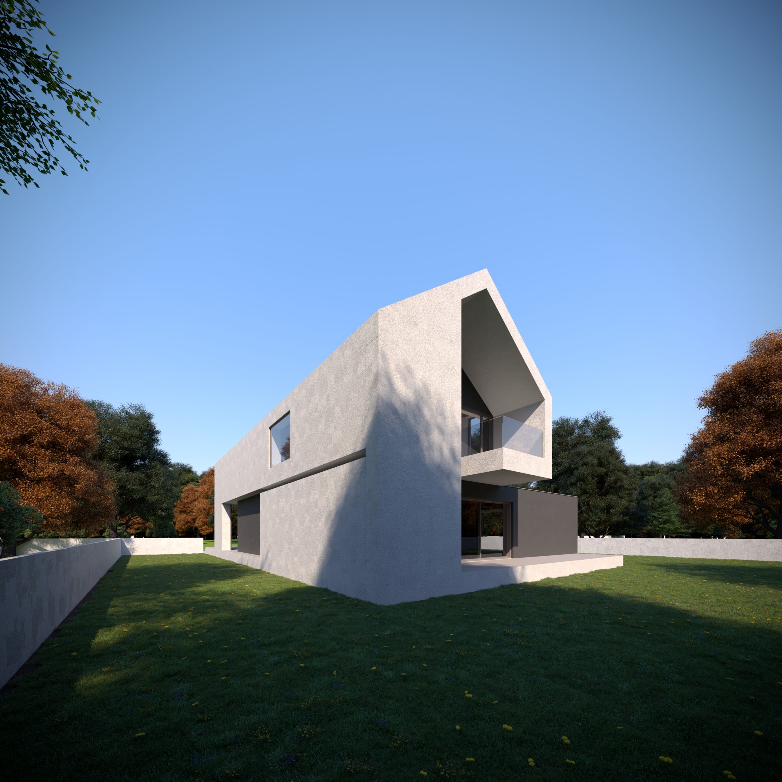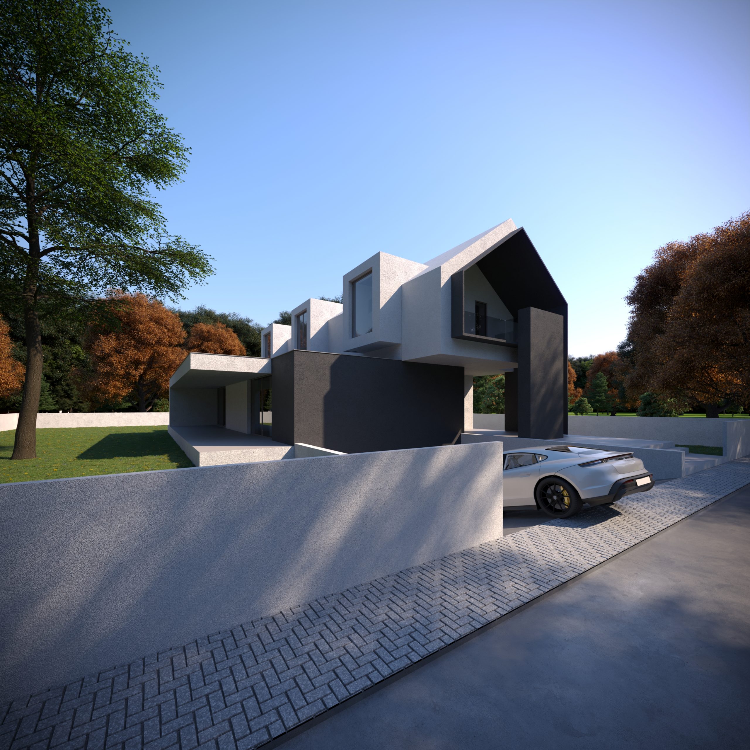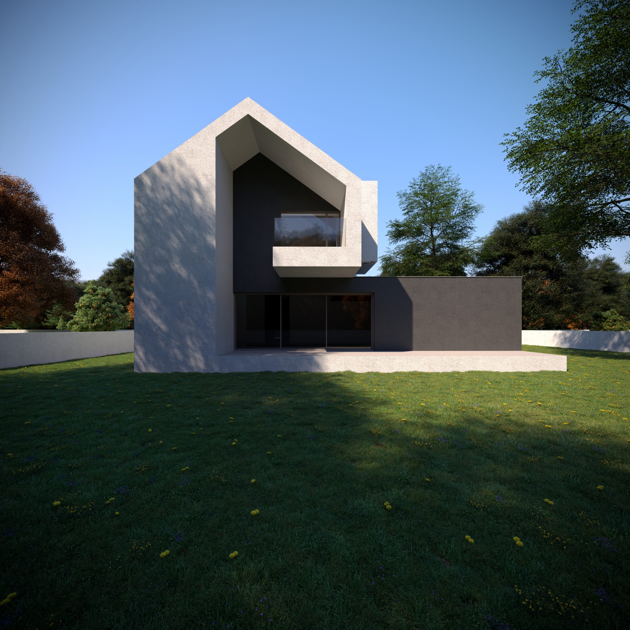 Bryła domu została zaprojektowana jako kompozycja wzajemnie przenikających się, prostych form, ujętych w jednorodną, minimalistyczną elewację. Brak nadmiaru detalu, oszczędne otwory okienne oraz konsekwentne operowanie masą i proporcją pozwoliły stworzyć budynek, który mimo dużej kubatury pozostaje wizualnie spokojny i uporządkowany. Dach dwuspadowy, charakterystyczny dla archetypu stodoły, został tu przetworzony w nowoczesny, miejski znak rozpoznawczy.