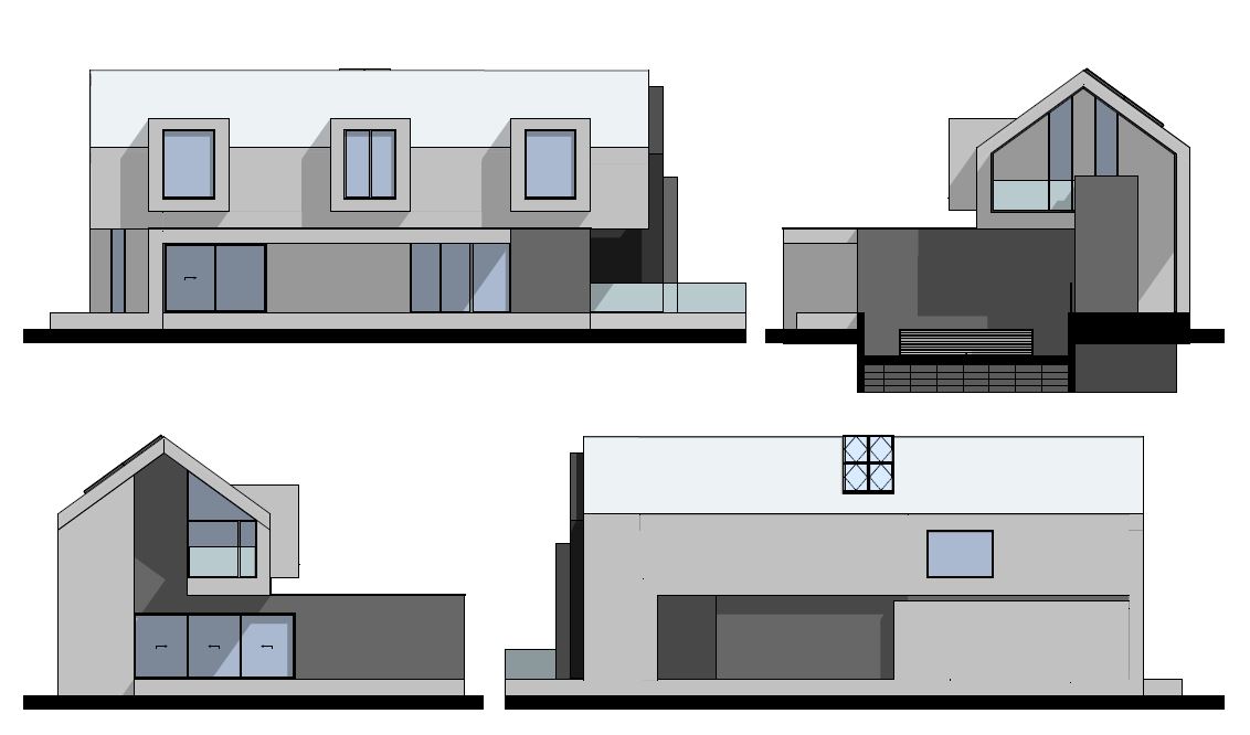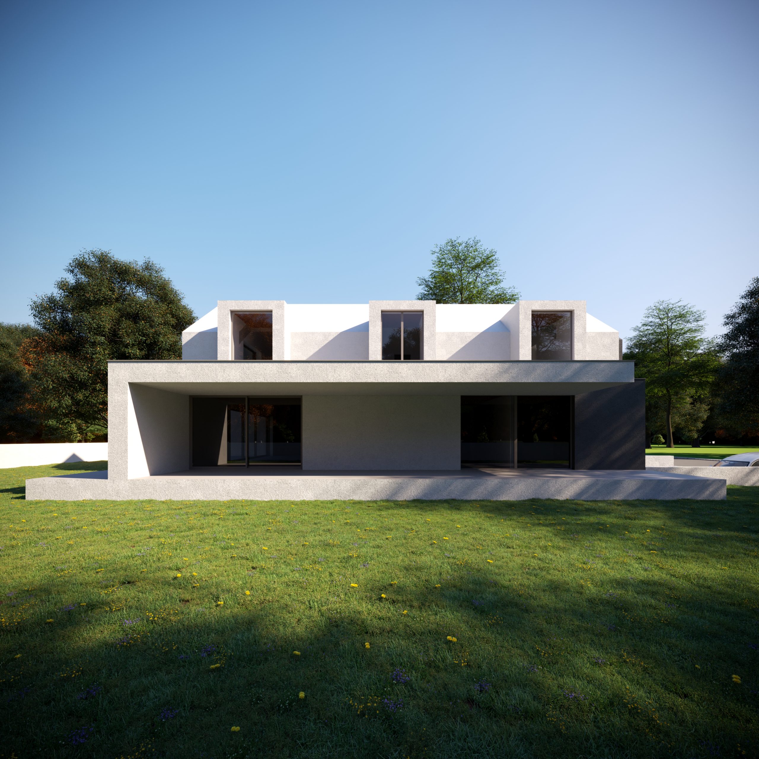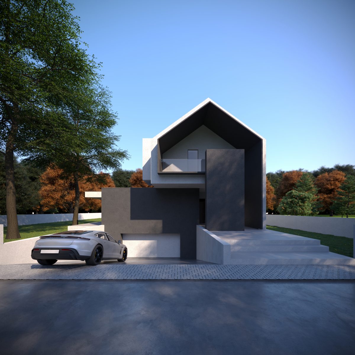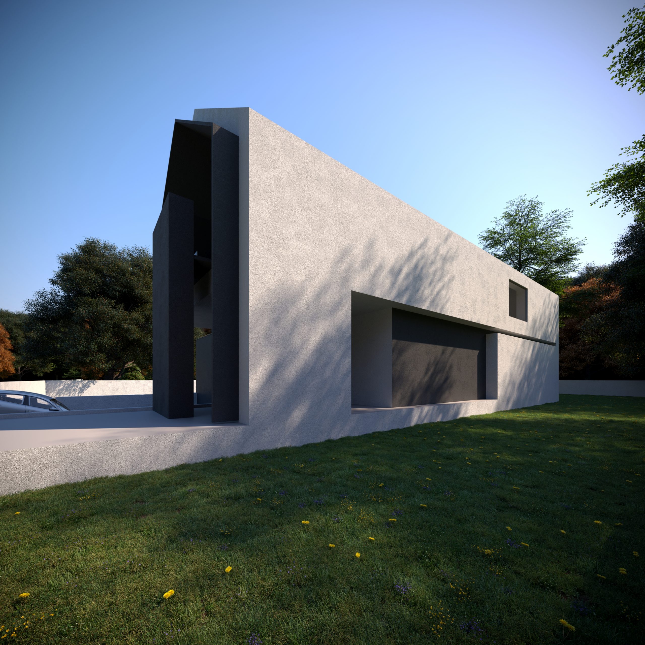 Bryła domu została zaprojektowana jako kompozycja wzajemnie przenikających się, prostych form, ujętych w jednorodną, minimalistyczną elewację. Brak nadmiaru detalu, oszczędne otwory okienne oraz konsekwentne operowanie masą i proporcją pozwoliły stworzyć budynek, który mimo dużej kubatury pozostaje wizualnie spokojny i uporządkowany. Dach dwuspadowy, charakterystyczny dla archetypu stodoły, został tu przetworzony w nowoczesny, miejski znak rozpoznawczy.