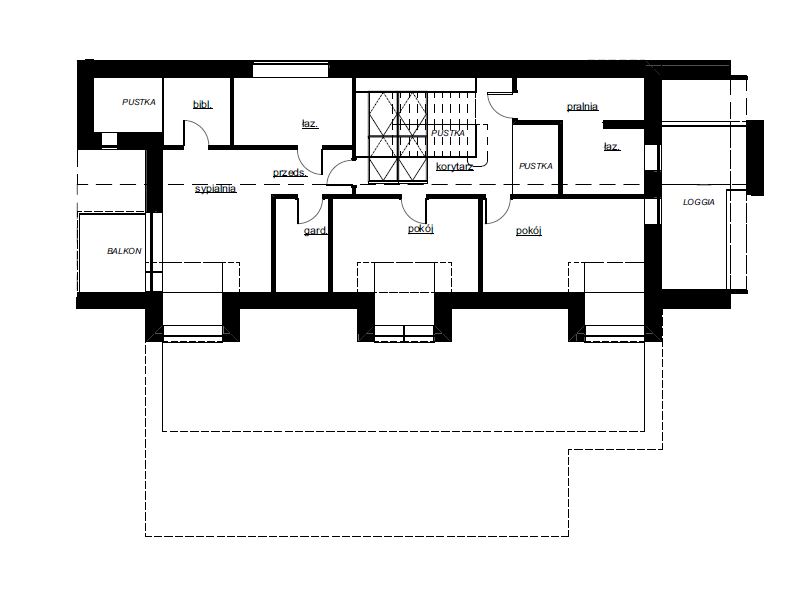 Na poddaszu zaprojektowano trzy sypialnie: główną oraz dwa mniejsze pokoje dziecięce. Sypialnia główna posiada własną łazienkę, garderobę oraz niewielką antresolę, ulokowaną nad biblioteczną częścią salonu poniżej. Z komunikacji dostępna jest dodatkowa łazienka oraz pralnia, obie z wyjściem na balkon. Nad strefą wejściową udało się również wprowadzić niewielką pustkę, która dodatkowo porządkuje przestrzeń i doświetla wnętrze.
