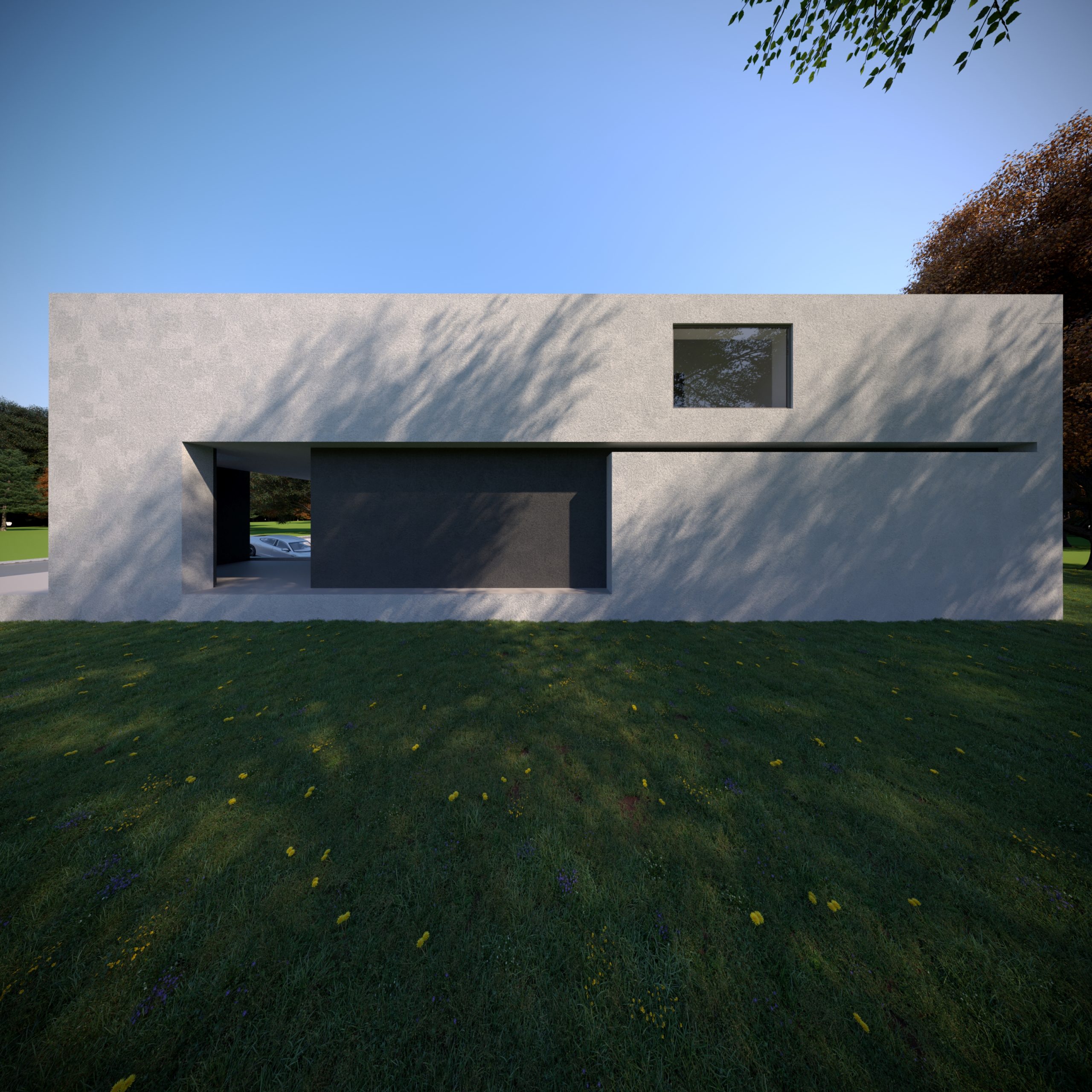 Świadomie zlokalizowano pomieszczenia techniczne, sanitarne oraz klatki schodowe od strony północnej, pozostawiając elewację południową dla pokoi i przestrzeni mieszkalnych. Dzięki temu północna ściana domu niemal pozbawiona jest otworów, co ułatwiło stworzenie spójnej, minimalistycznej elewacji i wzmocniło monolityczny charakter bryły.