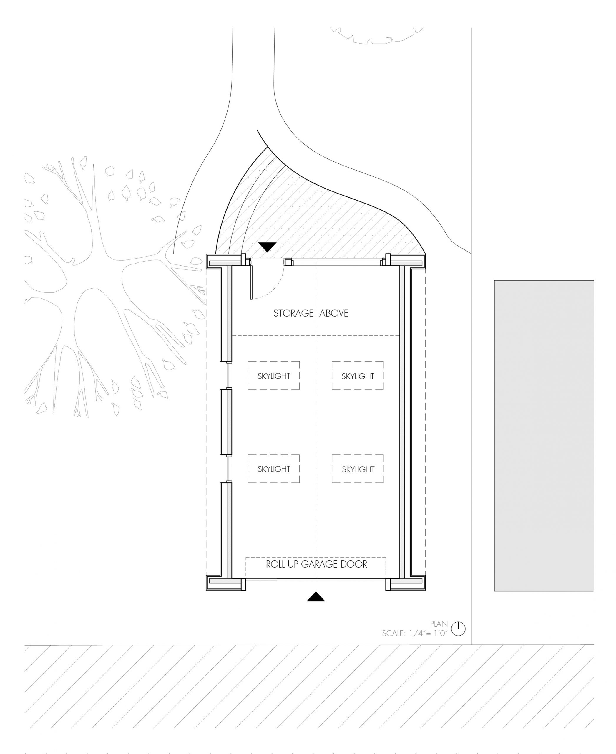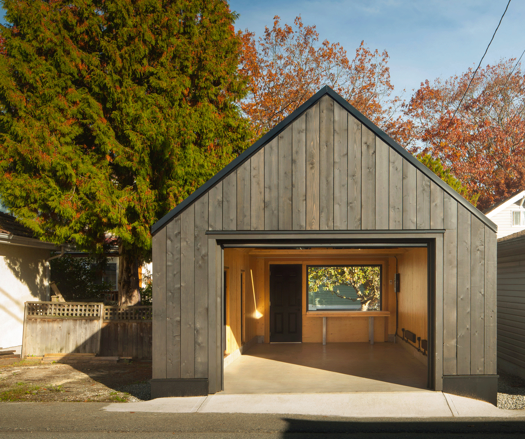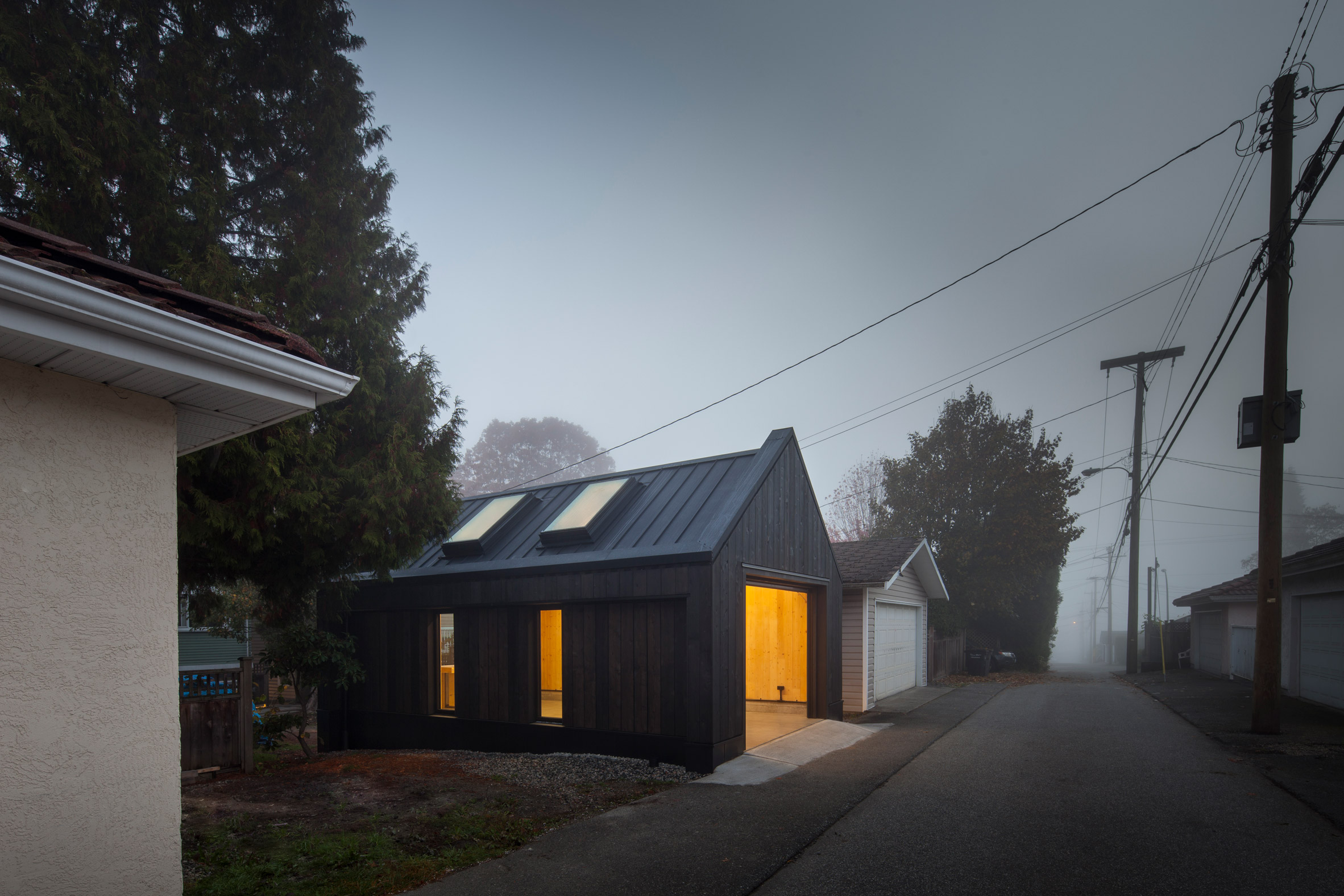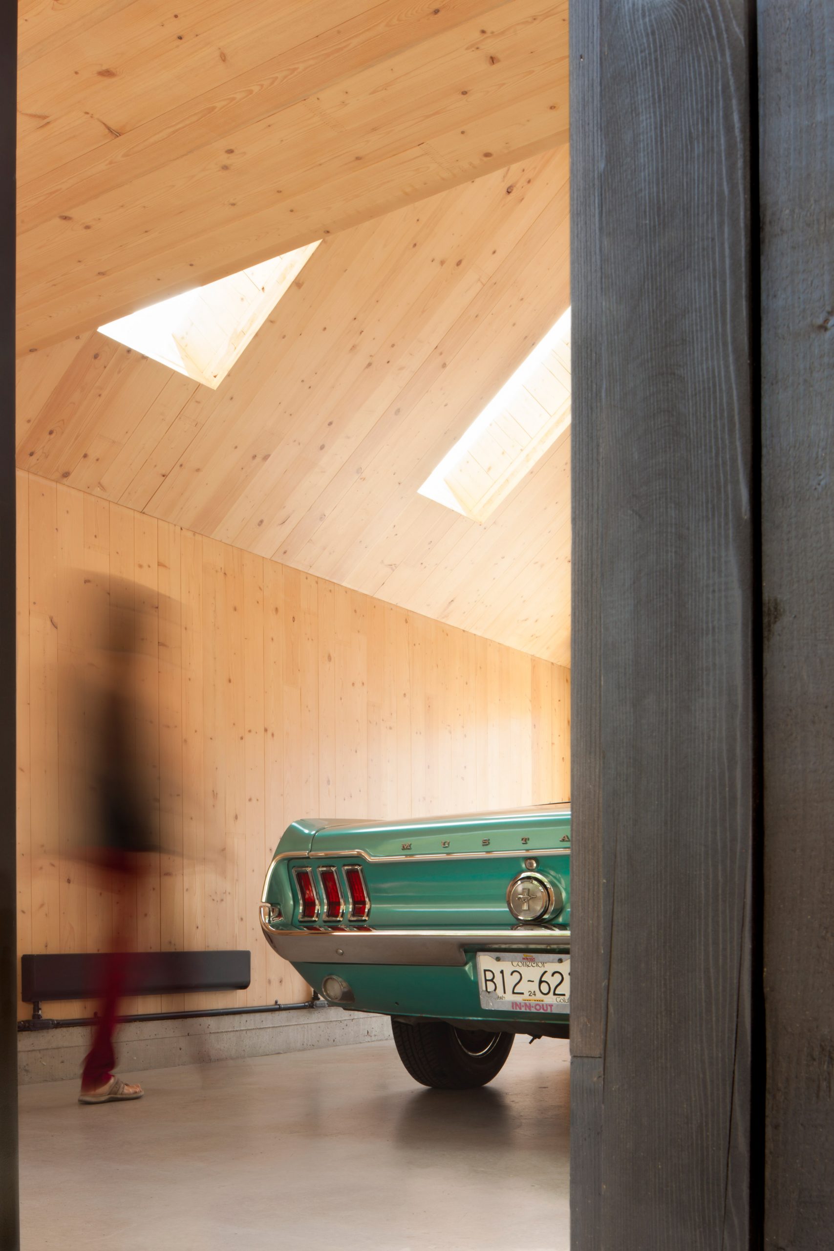 Firma Motiv Architects z Vancouver zrealizowała eksperymentalny projekt garażu wykonanego w całości z drewna laminowanego krzyżowo CLT, który pełni zarówno funkcję miejsca postojowego dla odrestaurowanego Mustanga, jak i warsztatu do produkcji industrialnych toreb. Ten 30-metrowy obiekt, usytuowany w ogrodzie i połączony z główną rezydencją, stanowi przykład tego, jak konstrukcja typu nowoczesna stodoła może powstać w trudno dostępnym, gęsto zabudowanym obszarze Vancouver. Architekci podkreślają, że projekt był dla nich okazją do przetestowania prefabrykowanych płyt CLT na bardzo małą skalę, aby lepiej poznać ich właściwości oraz zalety montażowe.