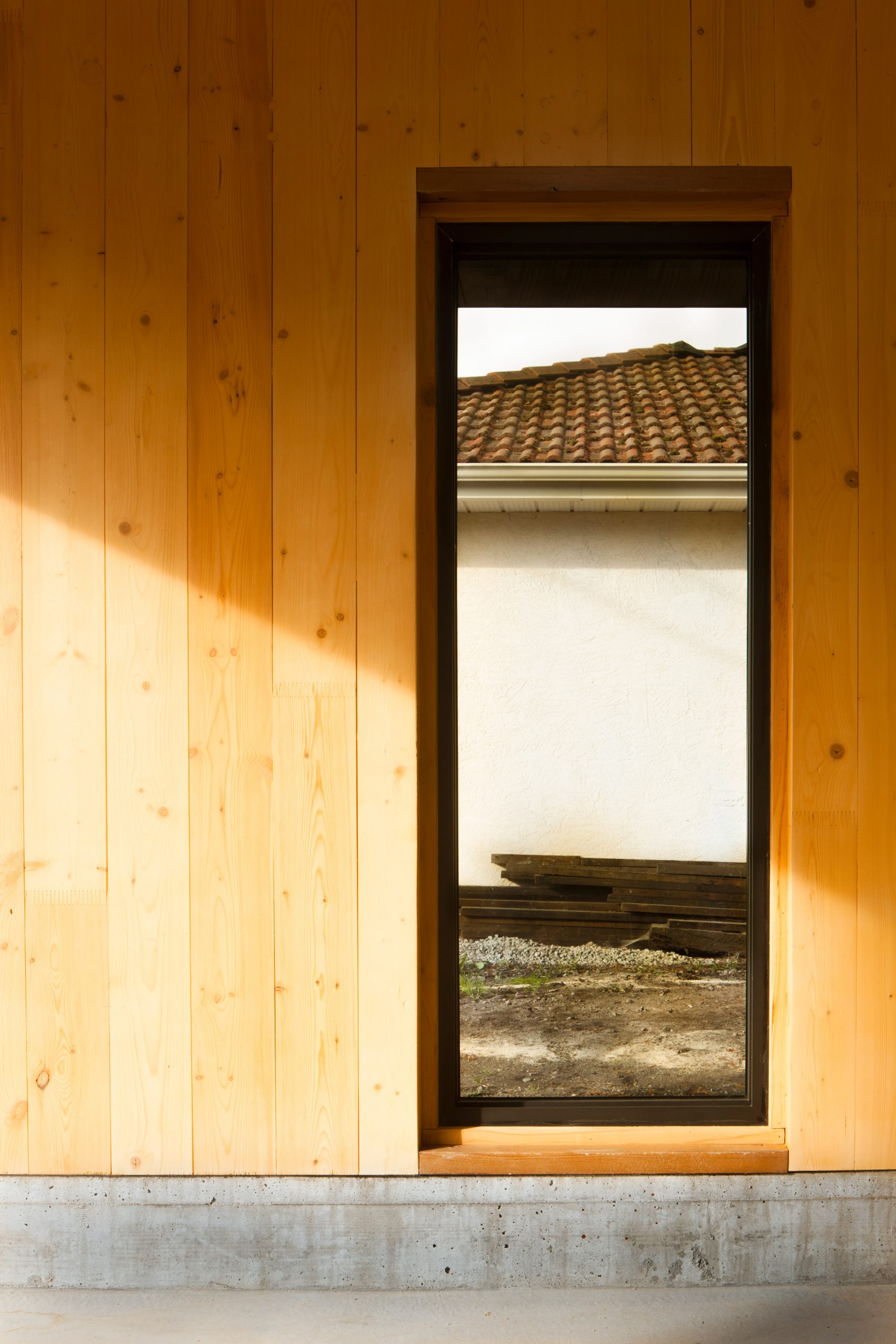 Cały budynek powstał z trzywarstwowych płyt CLT przyciętych na czternaście elementów, które złożono na miejscu niczym układankę w zaledwie półtora dnia, a cała budowa trwała dwa dni. Wyzwaniem była wąska uliczka, linia energetyczna oraz sąsiednie zabudowania, jednak prefabrykacja pozwoliła szybko i sprawnie przeprowadzić montaż z użyciem specjalnego dźwigu. Od zewnątrz garaż wykończono czarnymi, pionowymi deskami i listwami z cedru, pod którymi ukryto odpowiednią izolację, natomiast konstrukcję dodatkowo wzmocniono poprzez wbudowane rynny i wewnętrzną antresolę.