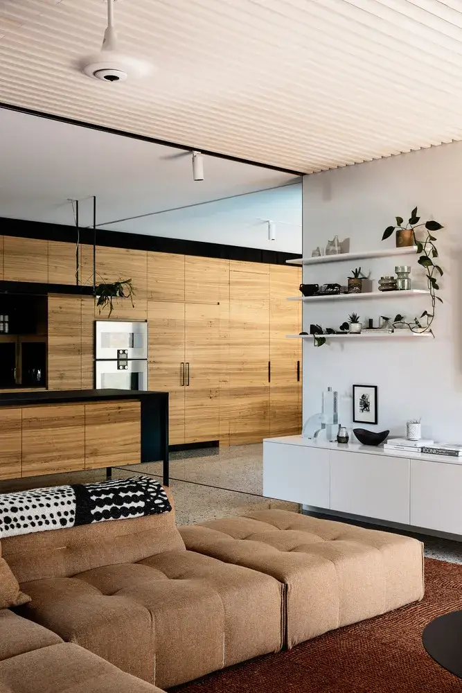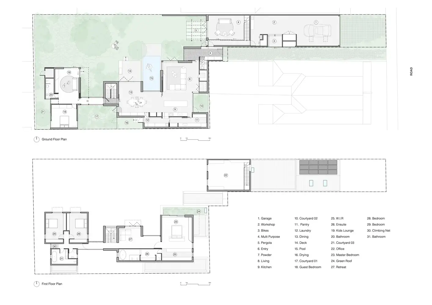 Garaż i warsztat wychodzą na ulicę, z tyłu znajduje się wielofunkcyjny pokój do rozmów, a na górze biuro. Salon/jadalnia/kuchnia (z ukrytą spiżarnią i pralnią) wychodzą na ogród. Główna sypialnia ma część wypoczynkową z „otwartym balkonem” i łazienkę. Dla dzieci natomiast przygotowano wydzieloną część z trzema sypialniami, dwiema łazienkami i salą telewizyjną. Wewnątrz znajdują się ukryte drzwi umożliwiające otwieranie lub zamykanie przestrzeni. Duże otwory łączą wnętrze z ogrodem.