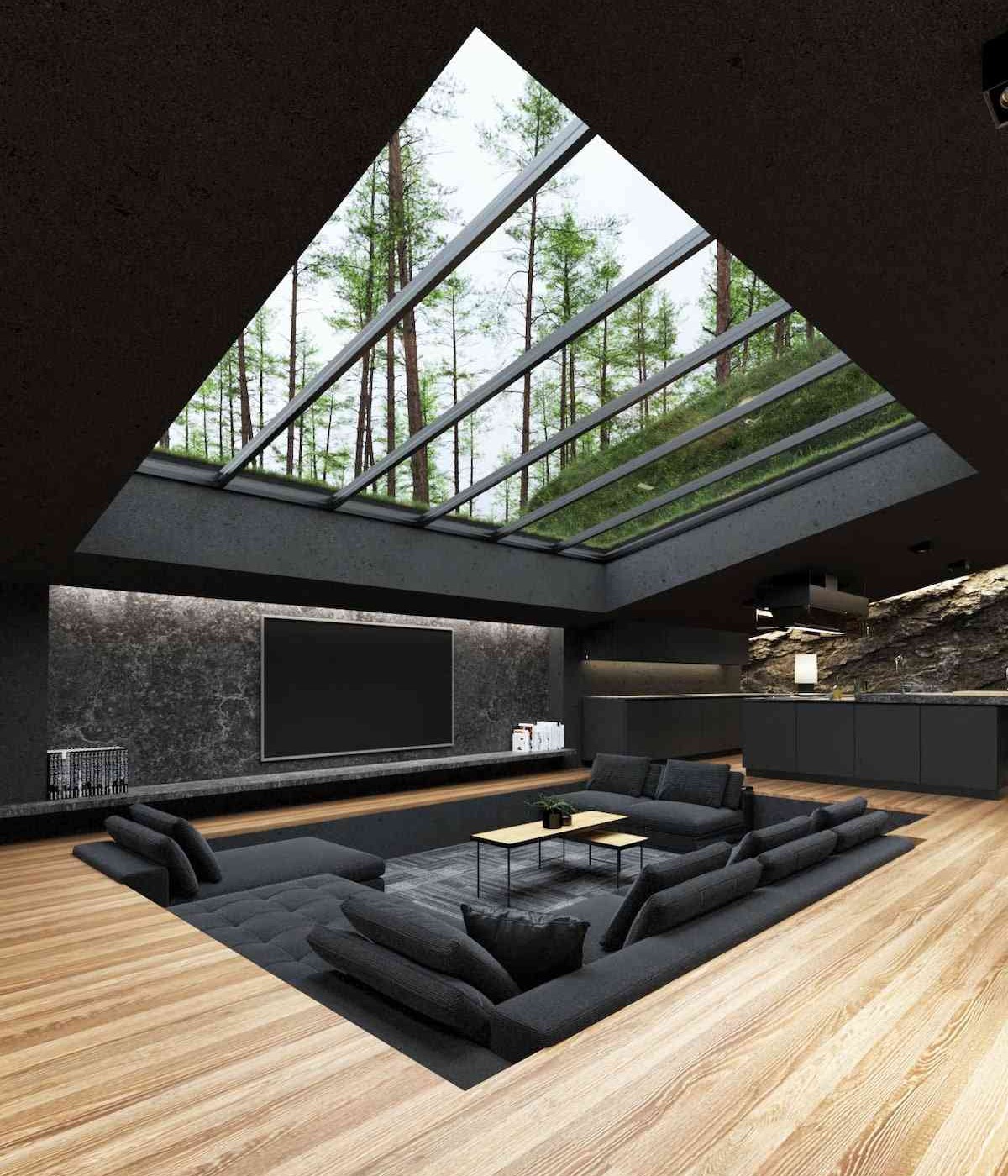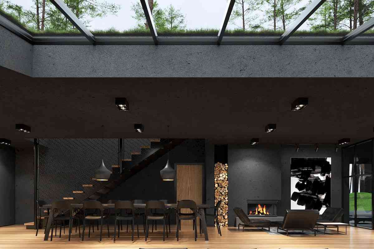 Z lotu ptaka uwagę przyciąga zielony dach, który stapia willę z krajobrazem i podkreśla jej ekologiczny charakter. Betonowy taras, minimalistyczne schody i gigantyczny świetlik otwierają wnętrze na naturę, pozwalając, by zieleń przenikała do środka. Salon oświetlony naturalnym światłem staje się centralnym punktem domu – miejscem, gdzie nowoczesna architektura, surowe materiały i otaczający las tworzą harmonijną całość.