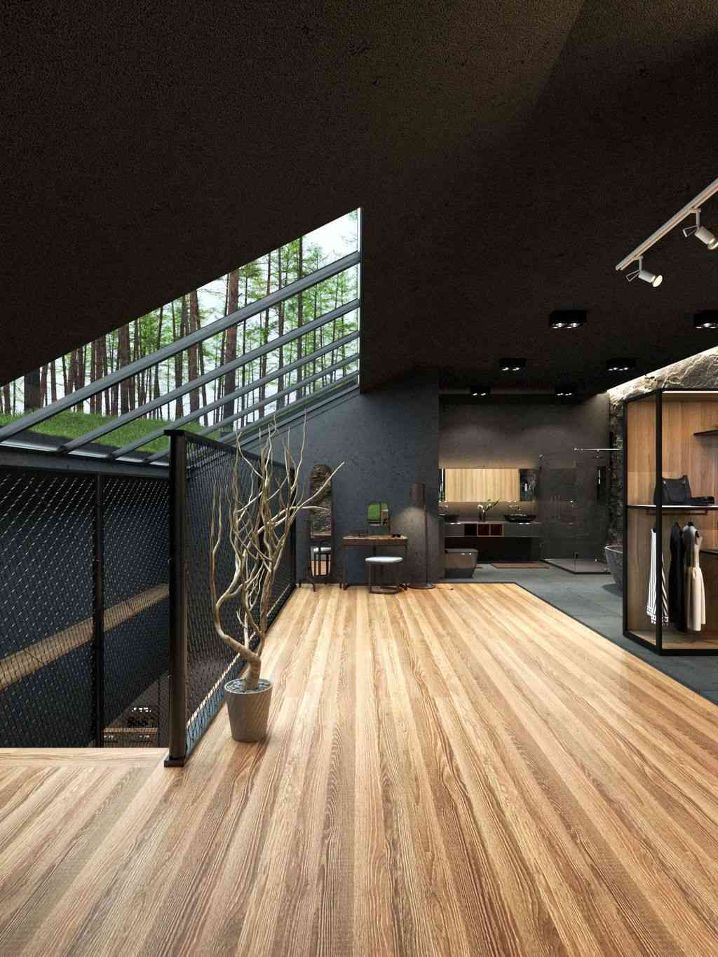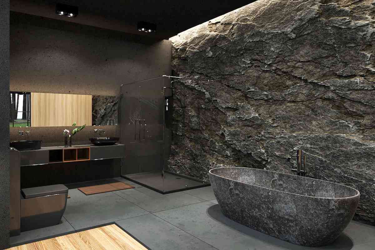 We wnętrzach willi dominują beton, ciemne drewno i kamień, które tworzą spójną, wyrafinowaną kompozycję. Duże przeszklenia wprowadzają naturalne światło i łączą przestrzeń mieszkalną z otoczeniem. Ciemna kolorystyka, marmur oraz metalowa siatka kontrastują z surowymi ścianami i dachem, zachowując jednocześnie spójność stylistyczną. Takie rozwiązania przywodzą na myśl nowoczesną stodołę, w której prostota formy spotyka się z luksusową, nastrojową atmosferą.