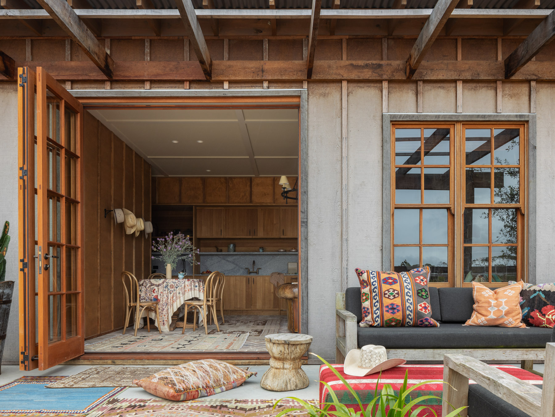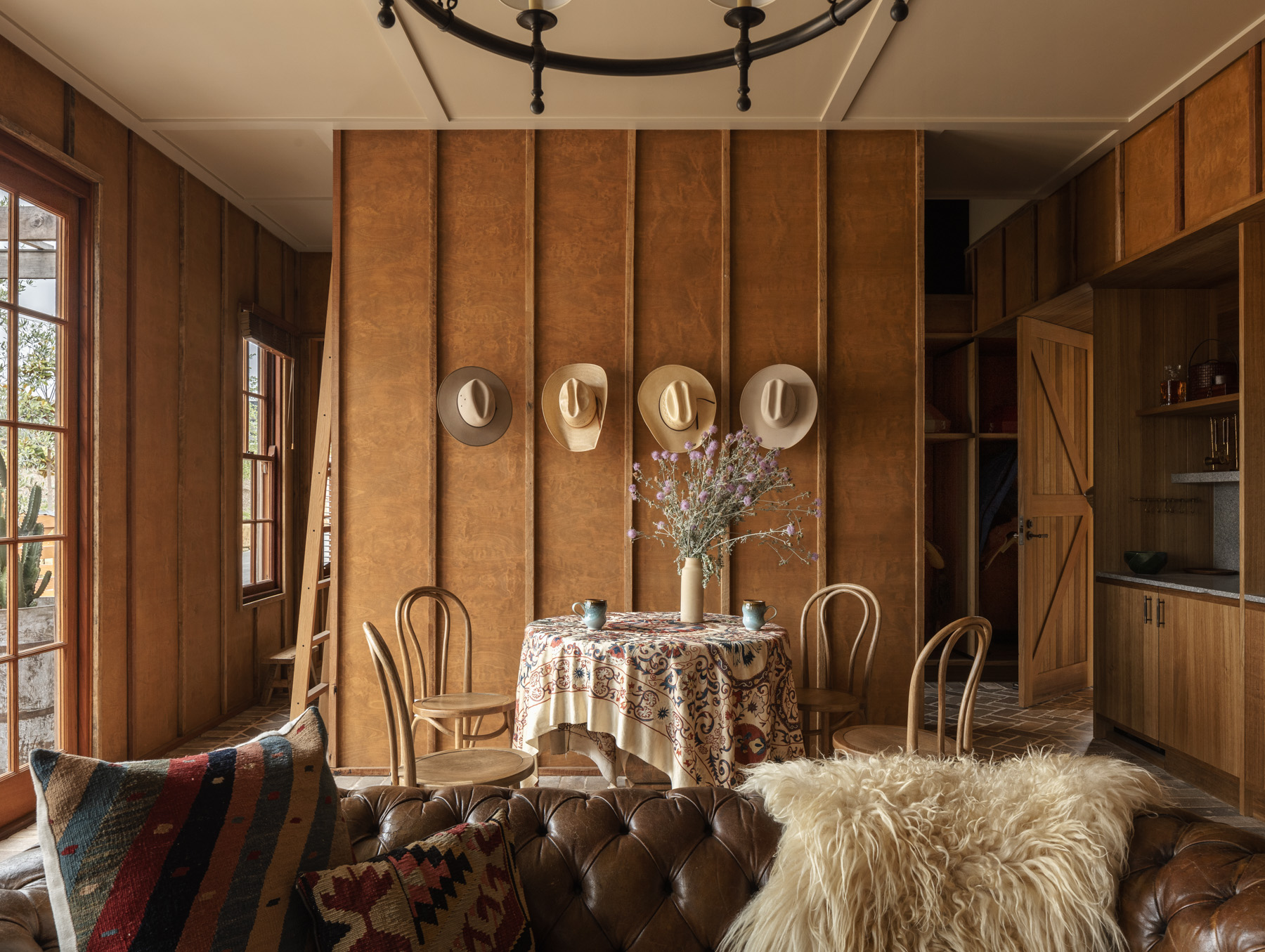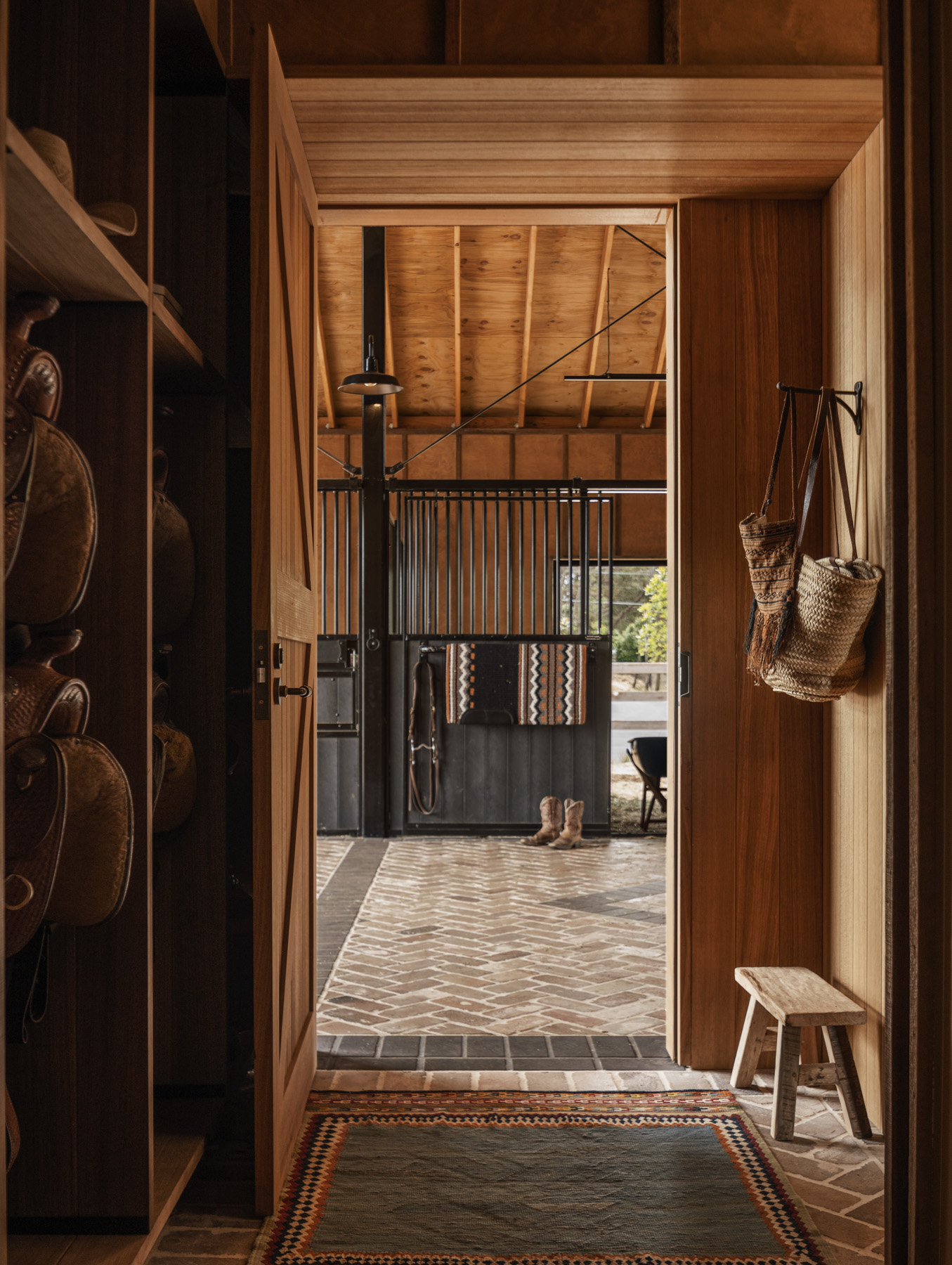 Bryła stajni została wykonana z surowego drewna, blachy falistej i cegły, jednak materiały te dalekie są od chłodnej surowości – ociepla je bogata, teksturalna paleta, nadając całości rustykalny charakter i elegancję. W detalach architektonicznych odnaleźć można subtelne motywy azteckie, wplecione w murach, drzwiach stodoły i aranżacji wnętrz.