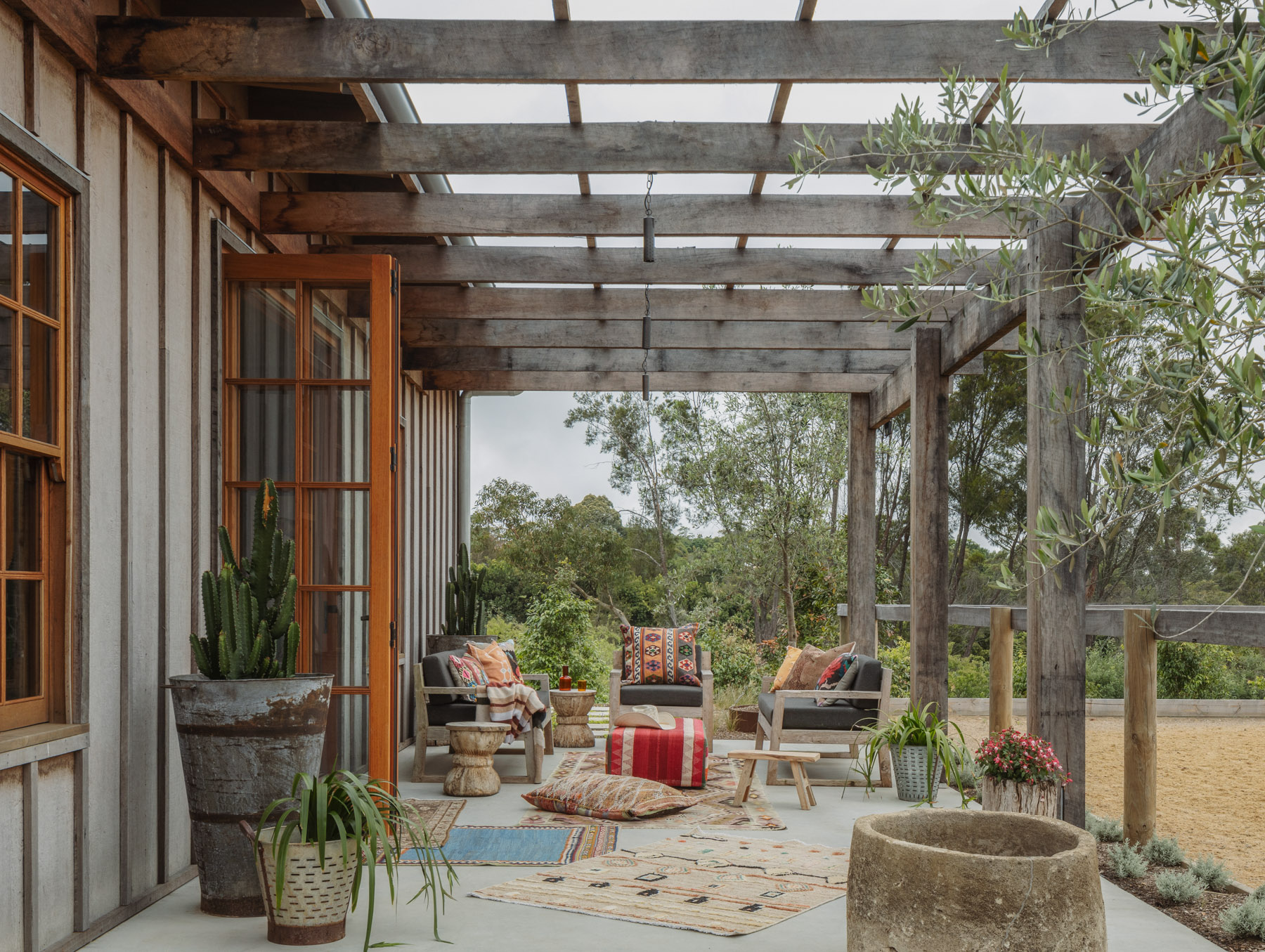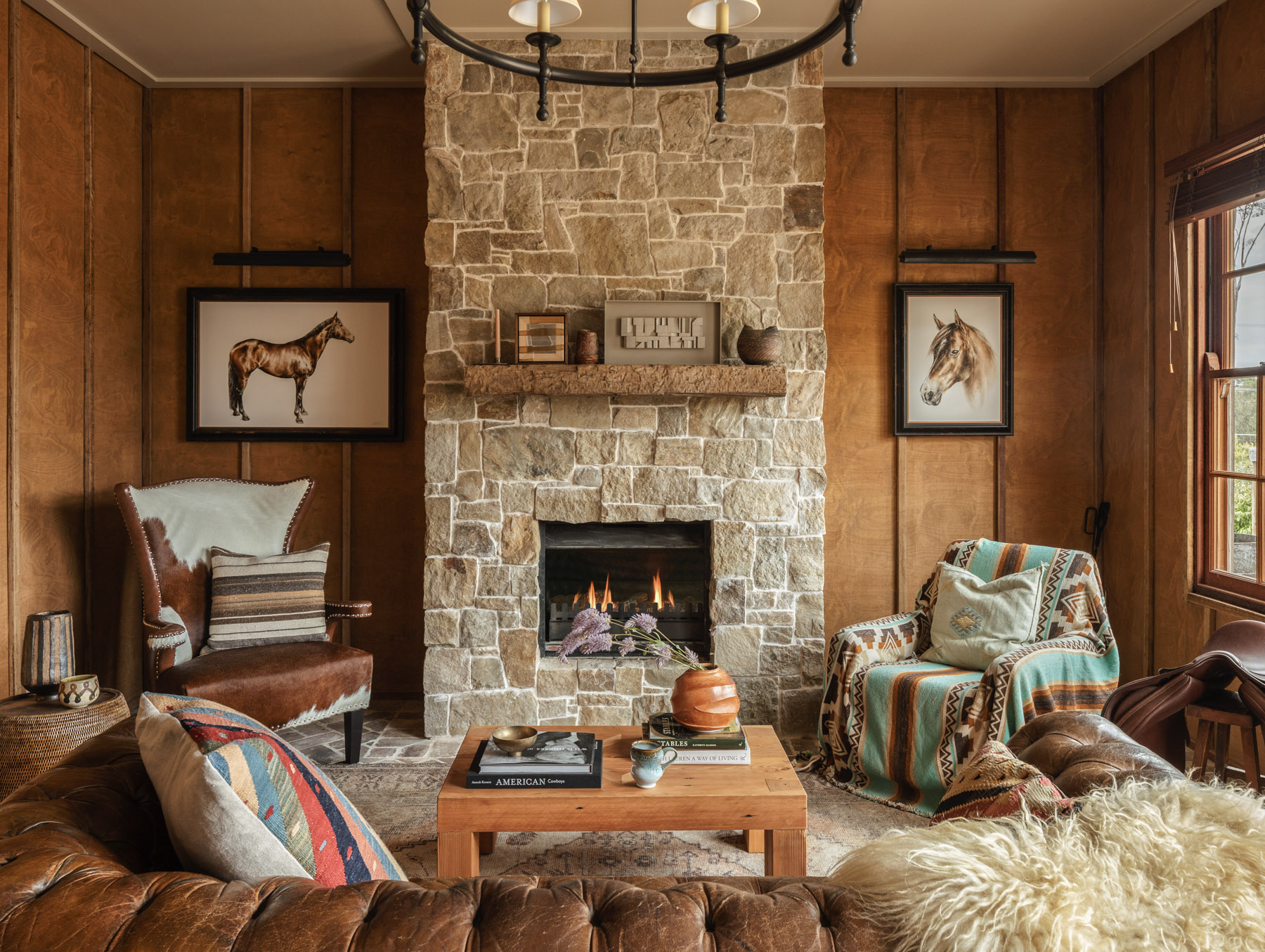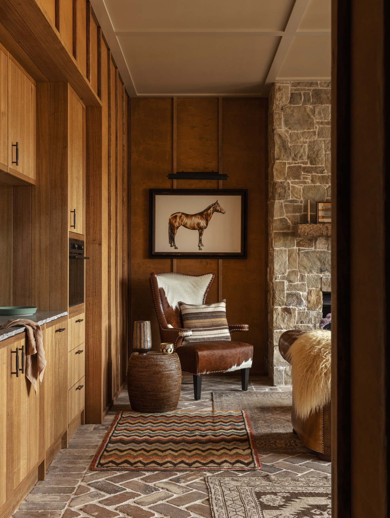 Projekt obejmuje również lounge i tack room, które emanują prostym luksusem. Wnętrza wzbogacono o rustykalne detale, meble vintage oraz indywidualnie projektowaną stolarkę autorstwa Nu Space. Centralnym punktem przestrzeni jest salon z kamiennym kominkiem, w którym spotykają się jeźdźcy, rodzina i goście. Na zewnątrz pergola wzmacnia poczucie wspólnoty, stając się miejscem naturalnych interakcji z końmi.
