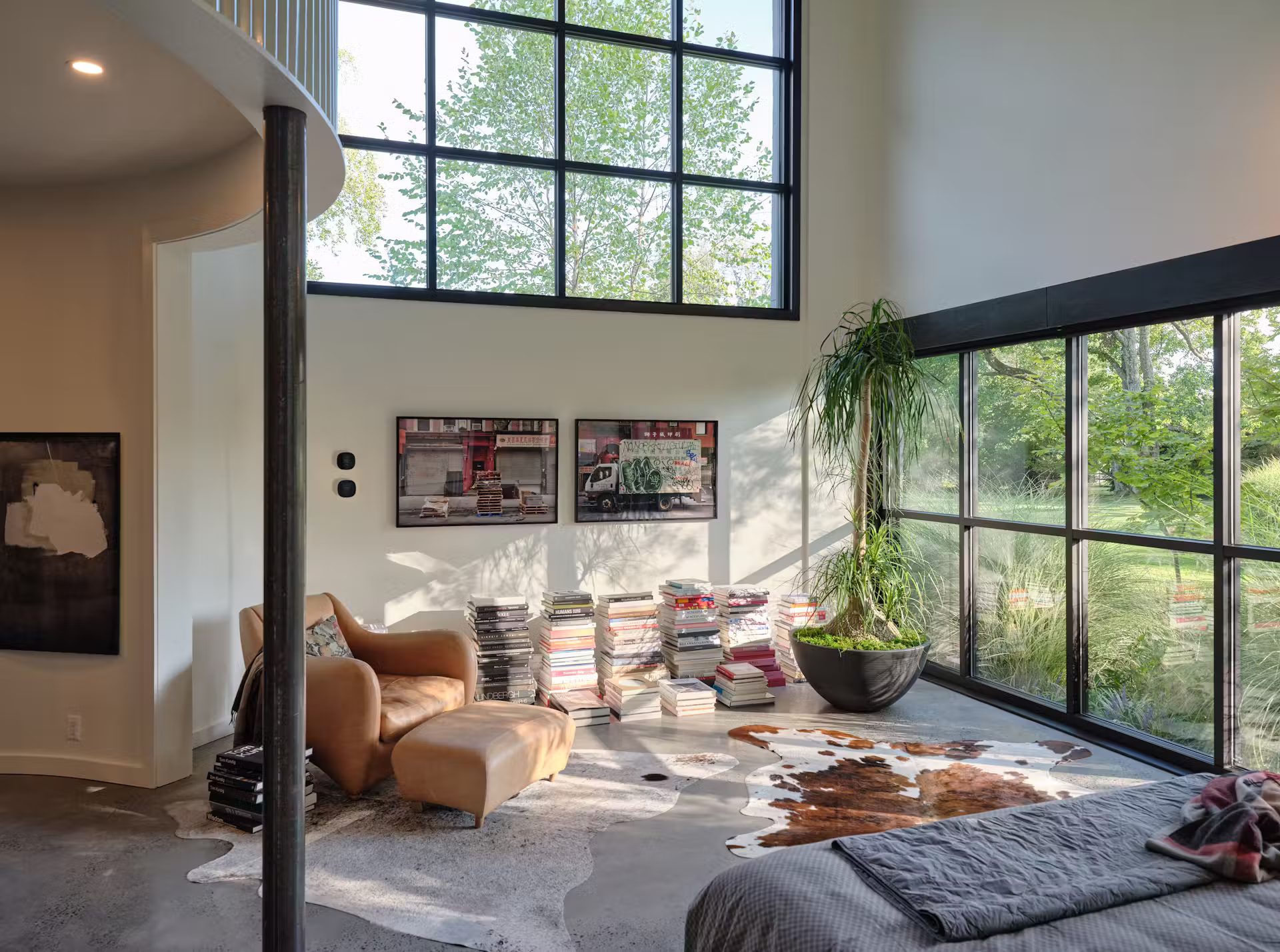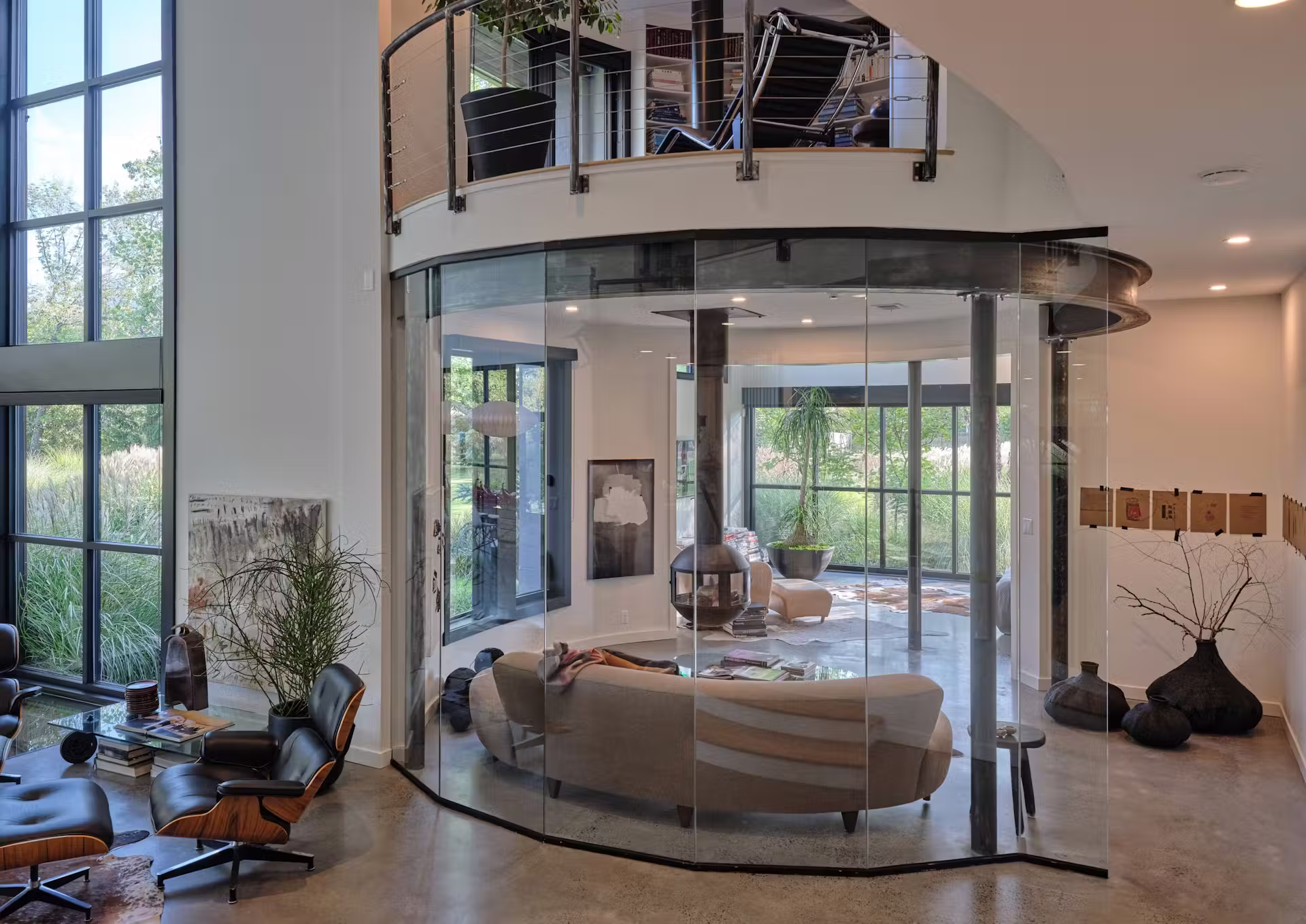 Wnętrza Glass Barn są skąpane w świetle i tworzą atmosferę równowagi między industrialną surowością a spokojem wiejskiego krajobrazu. Okrągła biblioteka, przeszklone przestrzenie wypoczynkowe i niski, horyzontalny układ domu sprzyjają kontemplacji – to przestrzeń, w której każdy widok wygląda jak starannie skomponowana fotografia.