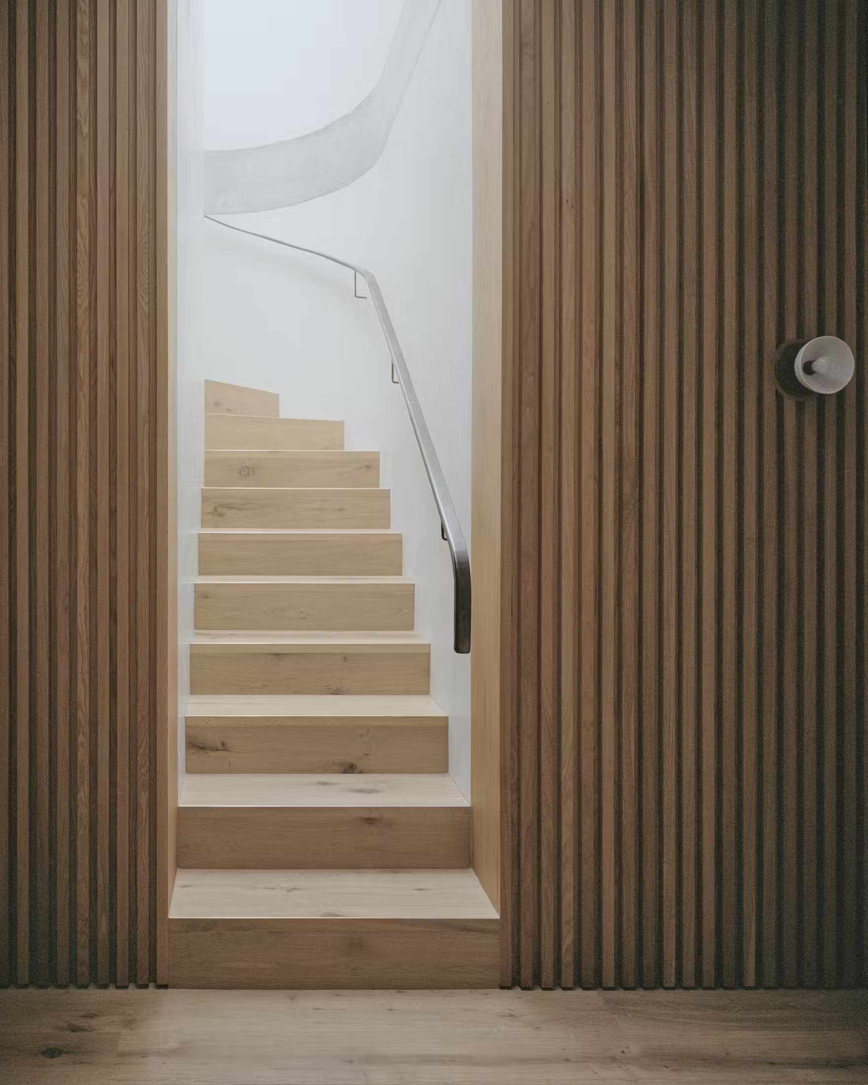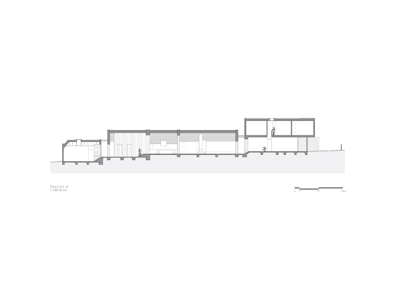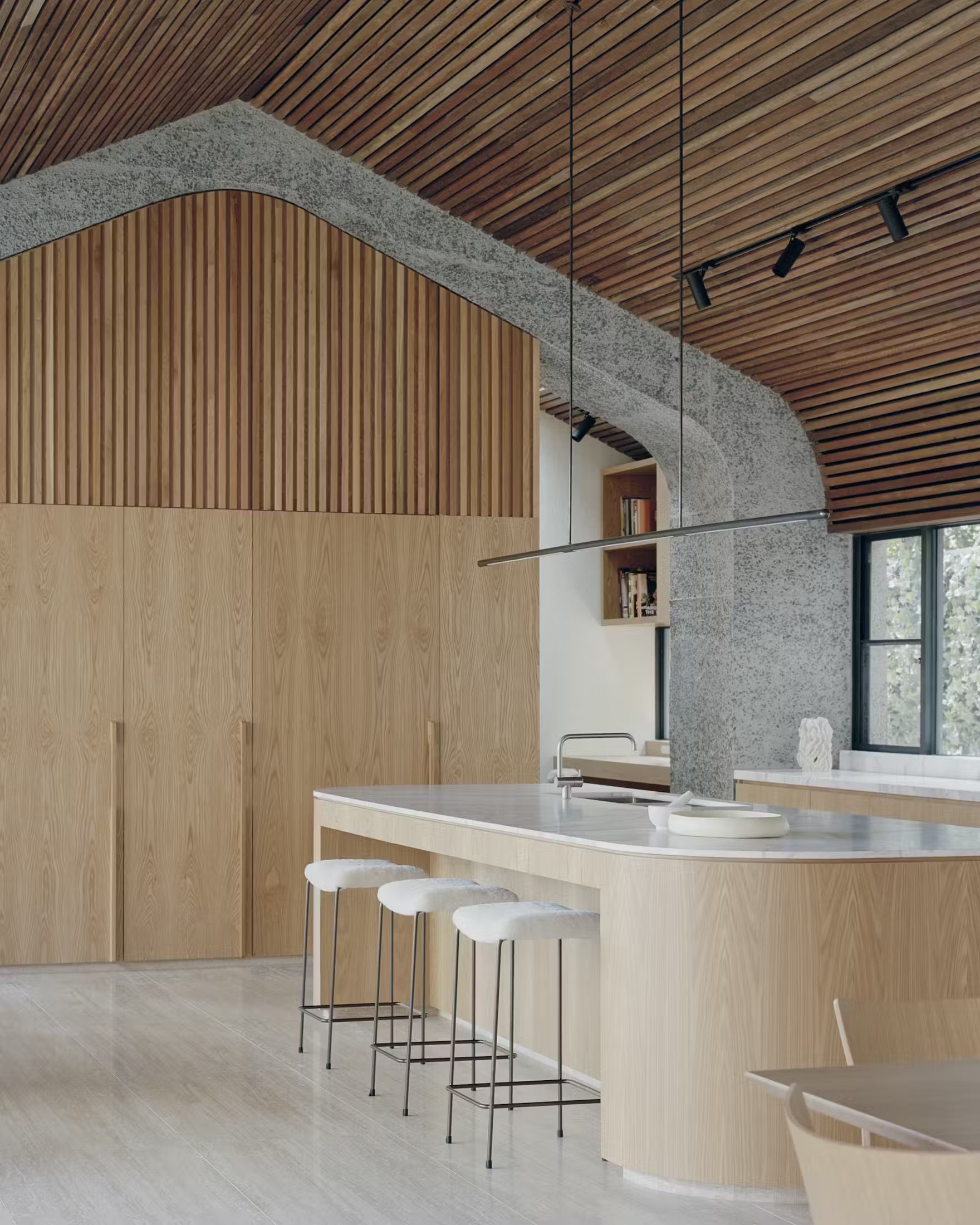 W kontrast do ceglanej elewacji pawilonu sypialnego, główna przestrzeń życiowa przypomina odsłonięty szkielet, gdzie betonowe żebra tworzą solidną strukturę. Te betony wznoszą główne ściany i tworzą wyraźny zewnętrzny zarys domu. Trwałe materiały w przestrzeniach wnętrz, takie jak trawertyn, amerykański dąb i polerowane ściany gipsowe, wprowadzają równocześnie ulgę i kontrast do surowego betonu. Pawilon mieszkalny, zorientowany na północ, posiada przeszklone ściany, które pozwalają na naturalne oświetlenie oraz widok na ogród i basen. Okna otwierane z obu stron pawilonu umożliwiają doskonałą wentylację krzyżową, zapewniając komfort użytkowania.