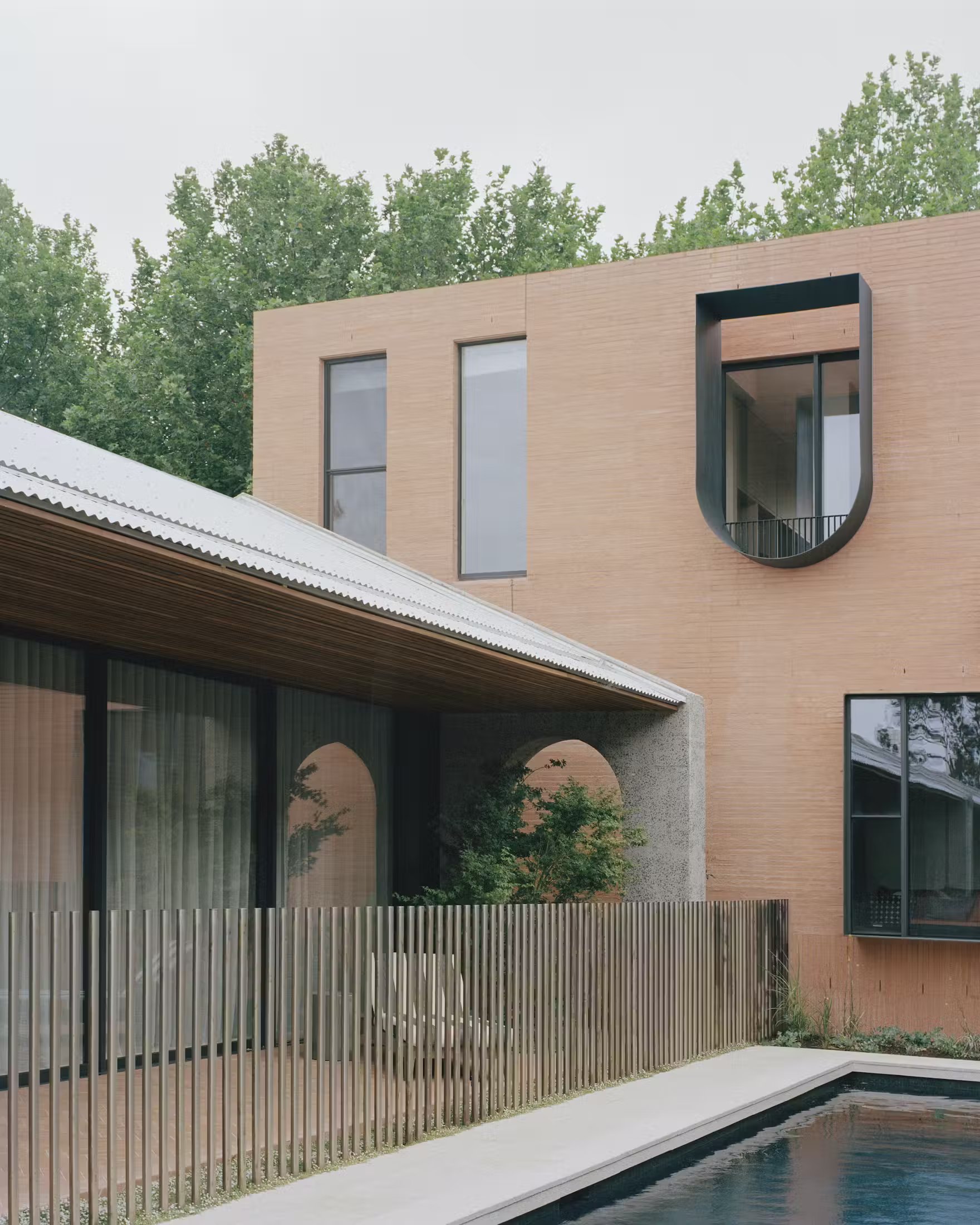 Glen Iris House zbudowany w Melbourne, to nowoczesny dom, który łączy surową materialność i formy architektoniczne, tworząc przestronną, zróżnicowaną kompozycję. Złożony z trzech pawilonów, dom wznosi się na długim, prostokątnym terenie, z których każdy z nich ma swoją unikalną funkcję. Stodołowa konstrukcja stanowi główną przestrzeń życiową, która została wypełniona ceglanymi formami, obejmującymi sypialnie z przodu budynku i warsztat samochodowy z tyłu. Przeszklone łączniki łączą pawilony, podkreślając różnice materiałowe i formalne, a także tworząc wrażenie podróży w trakcie przemieszczania się po posesji.