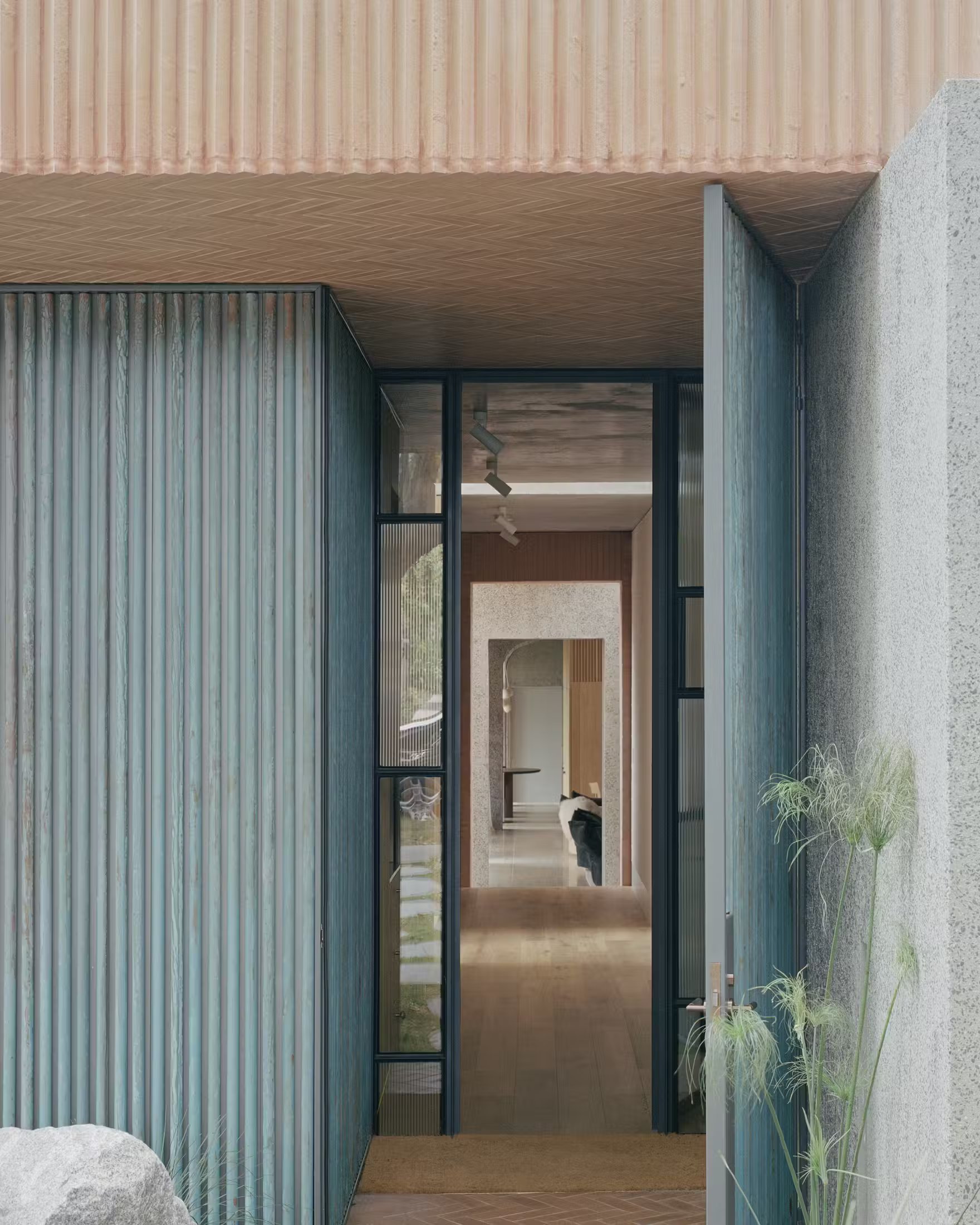 Fasada Glen Iris House jest ozdobiona patynowanym miedzianym ekranem, który reinterpretując ogrodzenia, przyciąga wzrok i wprowadza dom w interakcję z przestrzenią uliczną. Miedziany ekran odsunięty od granicy posesji, tworzy przestronną, zieloną granicę z ulicą. Powyżej ekranu, ceglany bryłowy wspornik pierwszego piętra wystaje ponad ogrodzenie, ukazując główne wejście i wskazując na materiały użyte wewnątrz. Terakotowe cegły ułożone pionowo i pod kątem 45 stopni nawiązują do dachów sąsiednich domów, tworząc dynamiczne tło, na którym światło tańczy w rytm otaczających drzew.
