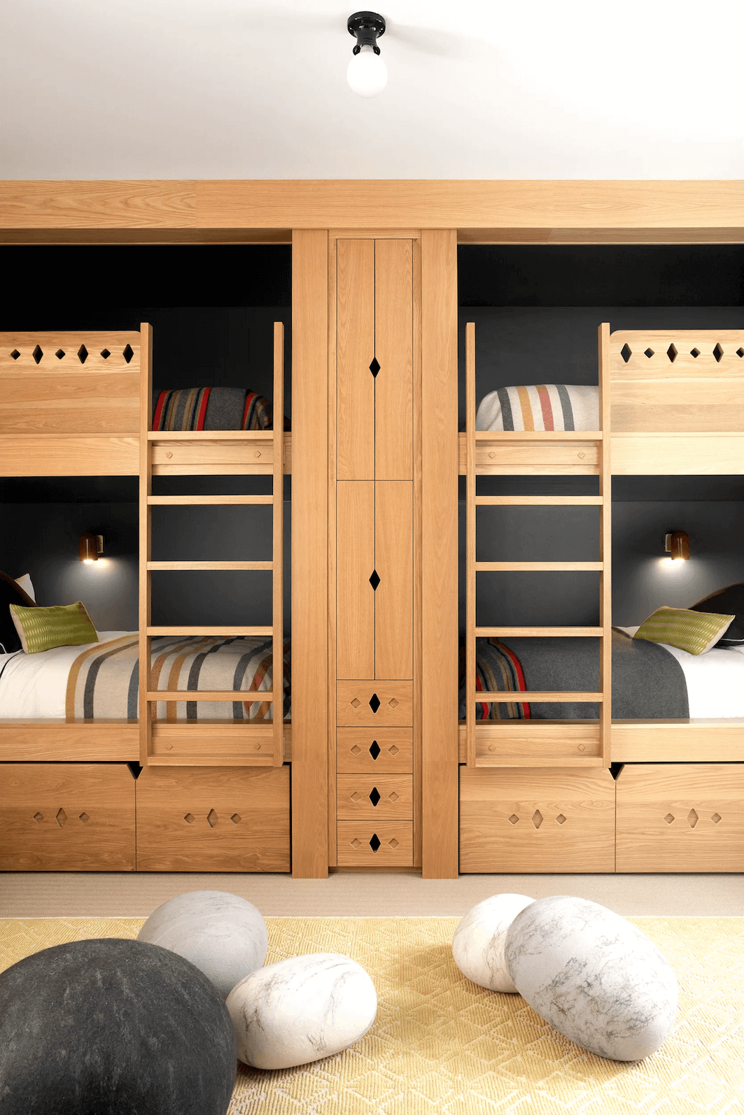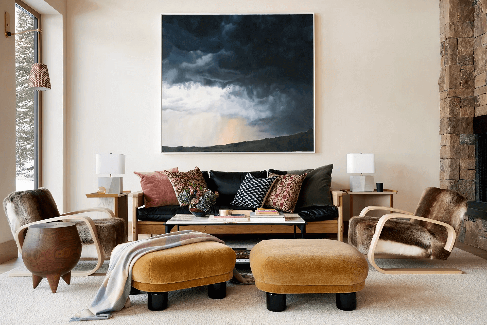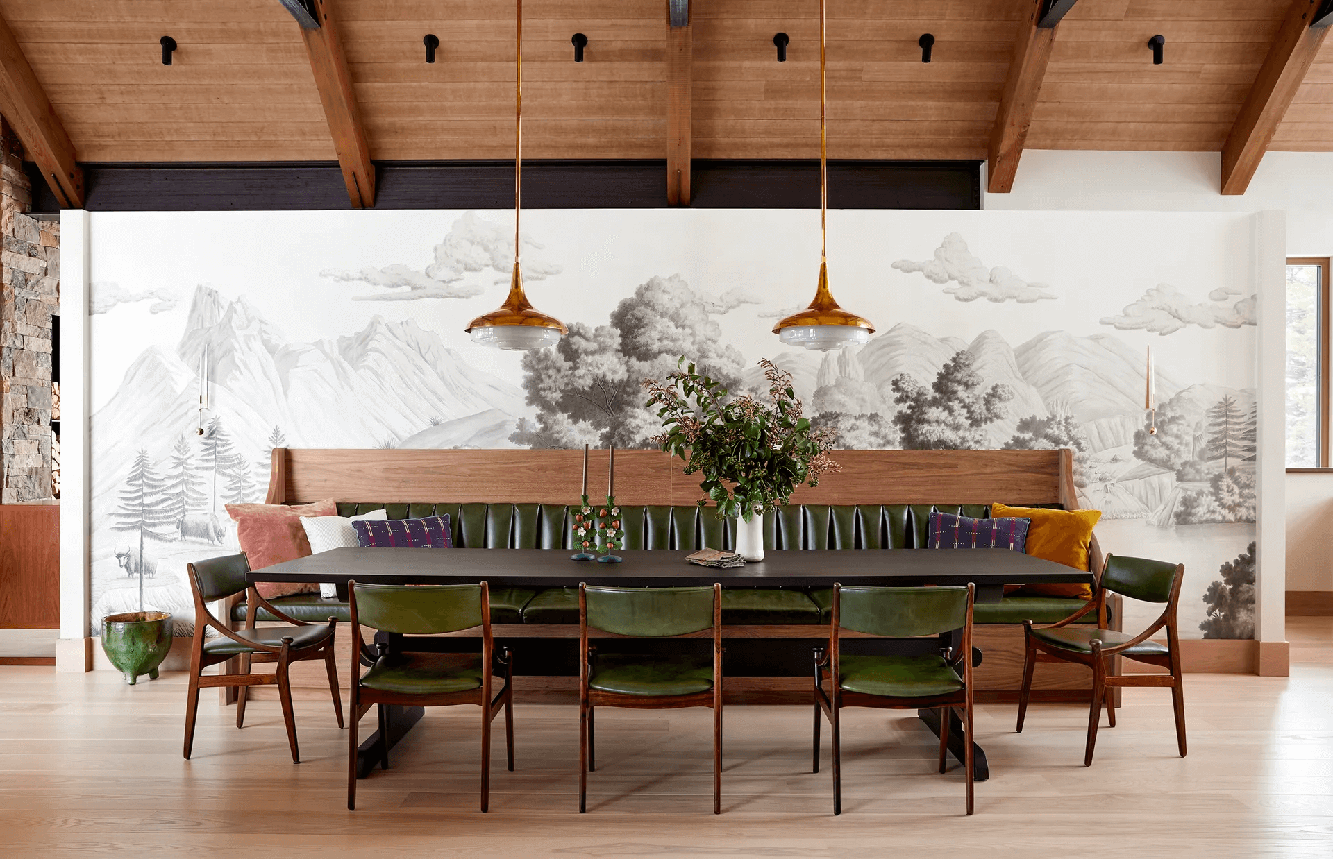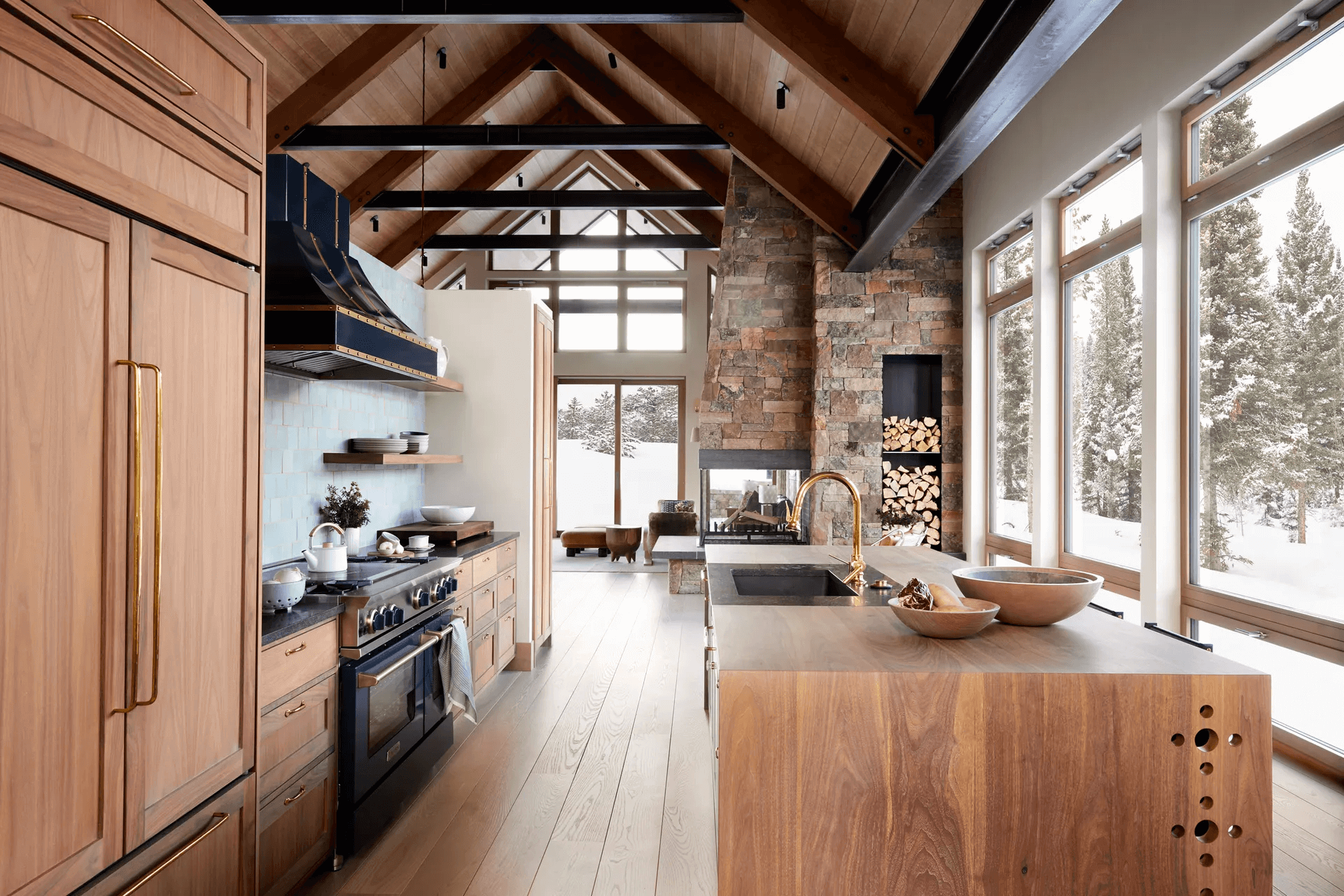 Jednym z kluczowych elementów projektu jest formalna jadalnia, pierwsze pomieszczenie, które wita gości po wejściu do domu. Balans pomiędzy skalą a kameralnymi strefami spotkań jest widoczny także w innych częściach domu. Salon, połączony z wyłożoną drewnem kuchnią, urzeka stołem z puzzlami otoczonym krzesłami z owczej skóry, które idealnie współgrają z szklanymi ścianami. W pobliżu znajduje się wysoki kamienny kominek, otwarty z trzech stron, który dopełnia atmosferę ciepła. Sztuka odgrywa ważną rolę w tym projekcie, a większość dzieł pochodzi z San Francisco, z pomocą doradczyni Caroline Brinckerhoff. W sypialniach zaś, dzięki panoramicznym oknom, widok na otaczającą przyrodę staje się nieodłącznym elementem wnętrza, bez zakłóceń tradycyjnymi akcentami.