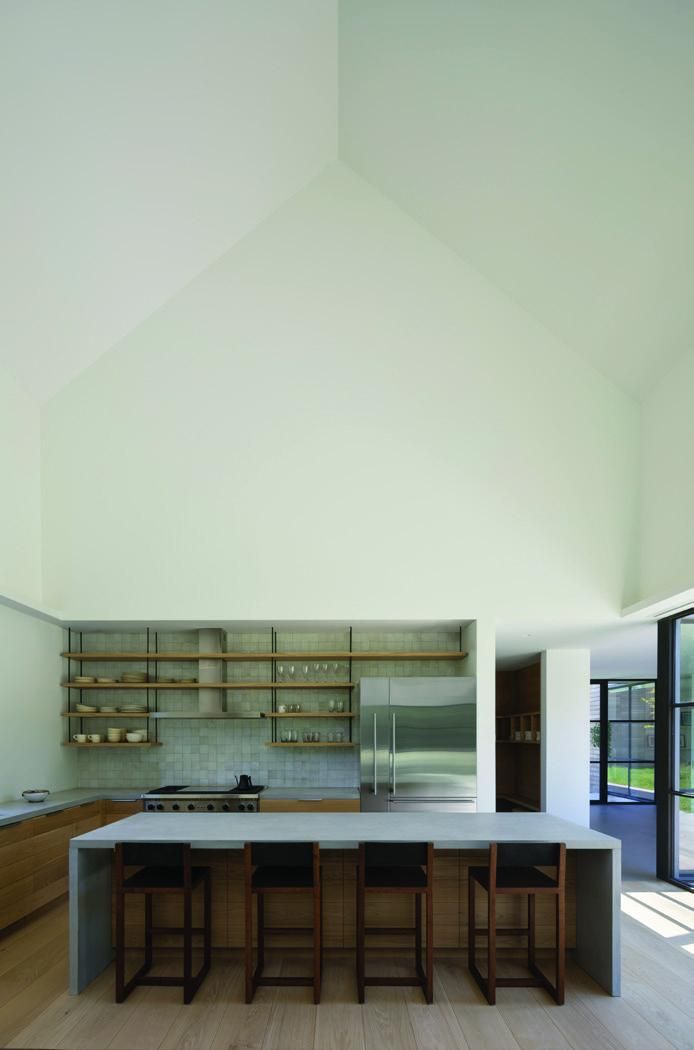 Cały projekt jest współczesną interpretacją znanej w tym rejonie architektury Nowej Anglii. Każdy element domu wykończono ułożonymi poziomo drewnianymi listwami, które płynnie przechodzą z powierzchni ścian na dach. Duże przeszklenia zapewniają kontakt fizyczny i wizualny z naturalnym otoczeniem domu, wpuszczając do wnętrza także sporo dziennego światła. Duży salon umieszczony został w centrum projektu i działa on jako węzeł komunikacyjny rodziny i ewentualnych gości. W tym miejscu uwagę przyciąga duży, betonowy kominek, blaty oraz czarne wykończenia okien.