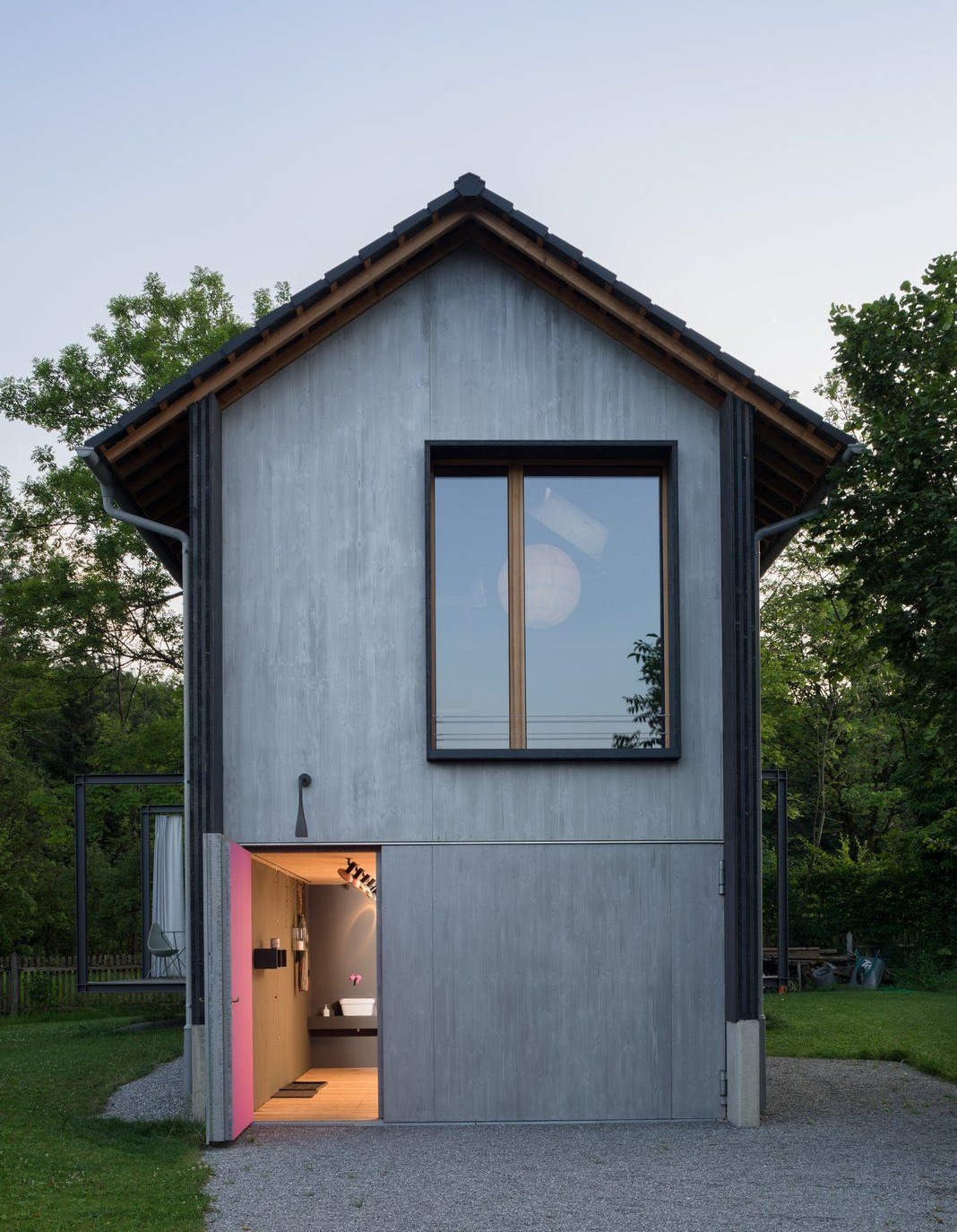 Wąska, trzypoziomowa konstrukcja z drewna została zaprojektowana jako nowoczesny domek wakacyjny, który maksymalnie wykorzystuje swoją kompaktową bryłę. Na pierwszym poziomie znajduje się otwarta strefa dzienna obejmująca kuchnię, jadalnię i salon, tworząca funkcjonalne i jasne centrum domu. Drugie piętro mieści sypialnię oraz łazienkę, zapewniając prywatność i komfort użytkowania, natomiast trzecim poziomem jest antresola przeznaczona do relaksu, z wolnostojącą wanną i miejscem do wypoczynku. Układ przestrzenny oraz pionowa organizacja wnętrza wpisują się w estetykę, jaką reprezentuje nowoczesna stodoła, łącząc prostotę formy z wysoką jakością doświadczenia przestrzeni.