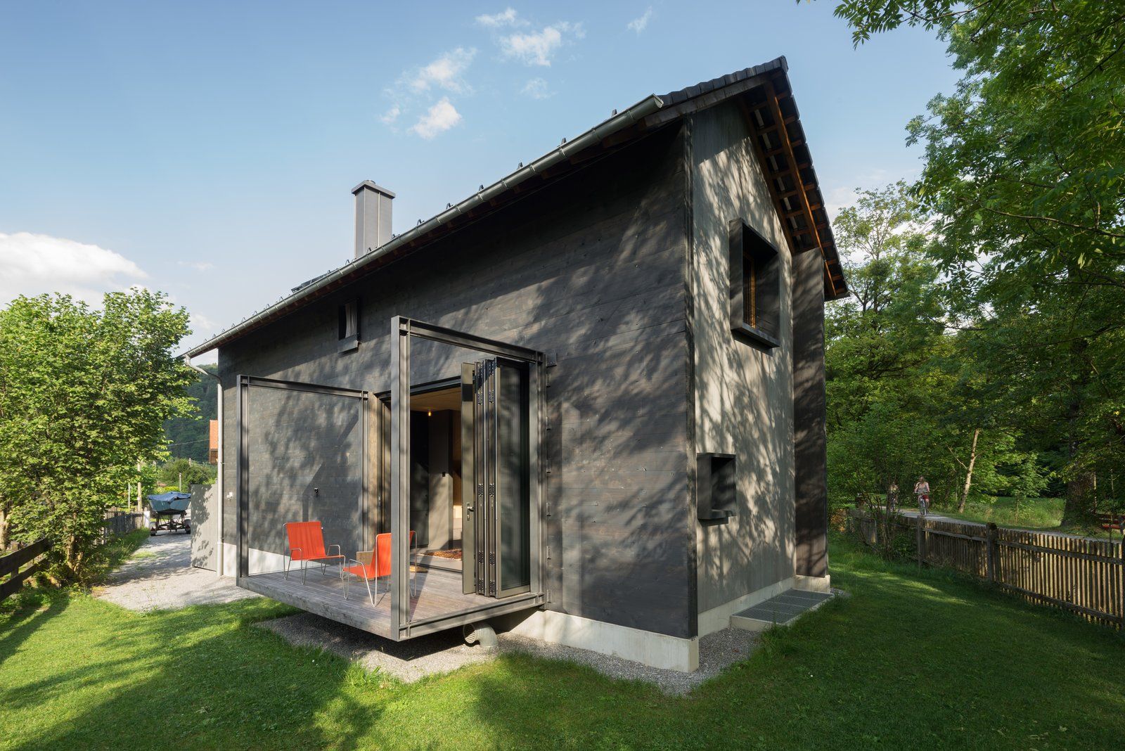 Projekt świadomie operuje kontrastem pomiędzy przestrzeniami otwartymi i prywatnymi, wzmacniając wrażenie dynamiki wnętrza. Składane drzwi prowadzące na duże tarasy płynnie łączą domek z otaczającą naturą, oferując spektakularne widoki i naturalne doświetlenie. W aranżacji wnętrz zestawiono ciemne barwy z jasnym drewnem, tworząc ciepłą, przyjazną atmosferę sprzyjającą wypoczynkowi. Dodatkowymi atutami są kominek, przytulna wnęka do czytania oraz panoramiczne widoki. Domek Gut Feeling przeznaczony jest dla maksymalnie czterech osób, a cena wynajmu rozpoczyna się od 340 dolarów za noc, co plasuje go w segmencie premium domków na wynajem.