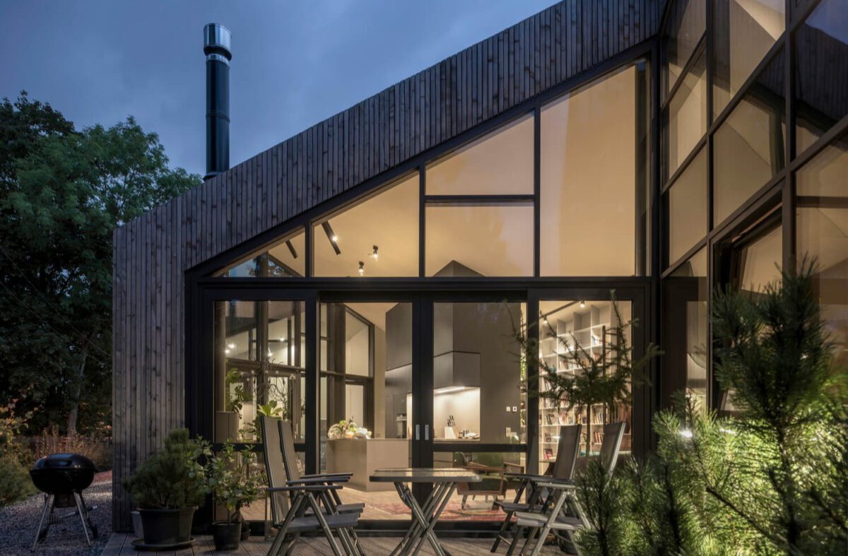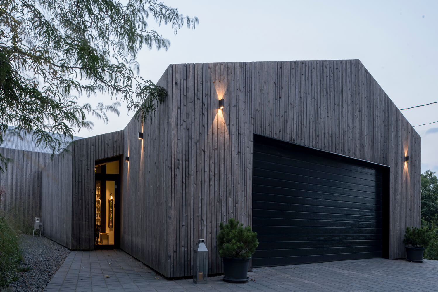 Bryła domu została zaprojektowana w formie przypominającej wielki kawałek drewna, jakby wycięty toporem. Wycięcia w strukturze lśnią szkłem, tworząc duże, nowoczesne okna, które wpuszczają do wnętrza mnóstwo naturalnego światła i otaczającą zieleń. Dzięki tym przemyślanym rozwiązaniom dom łączy nowoczesny design z harmonią natury.