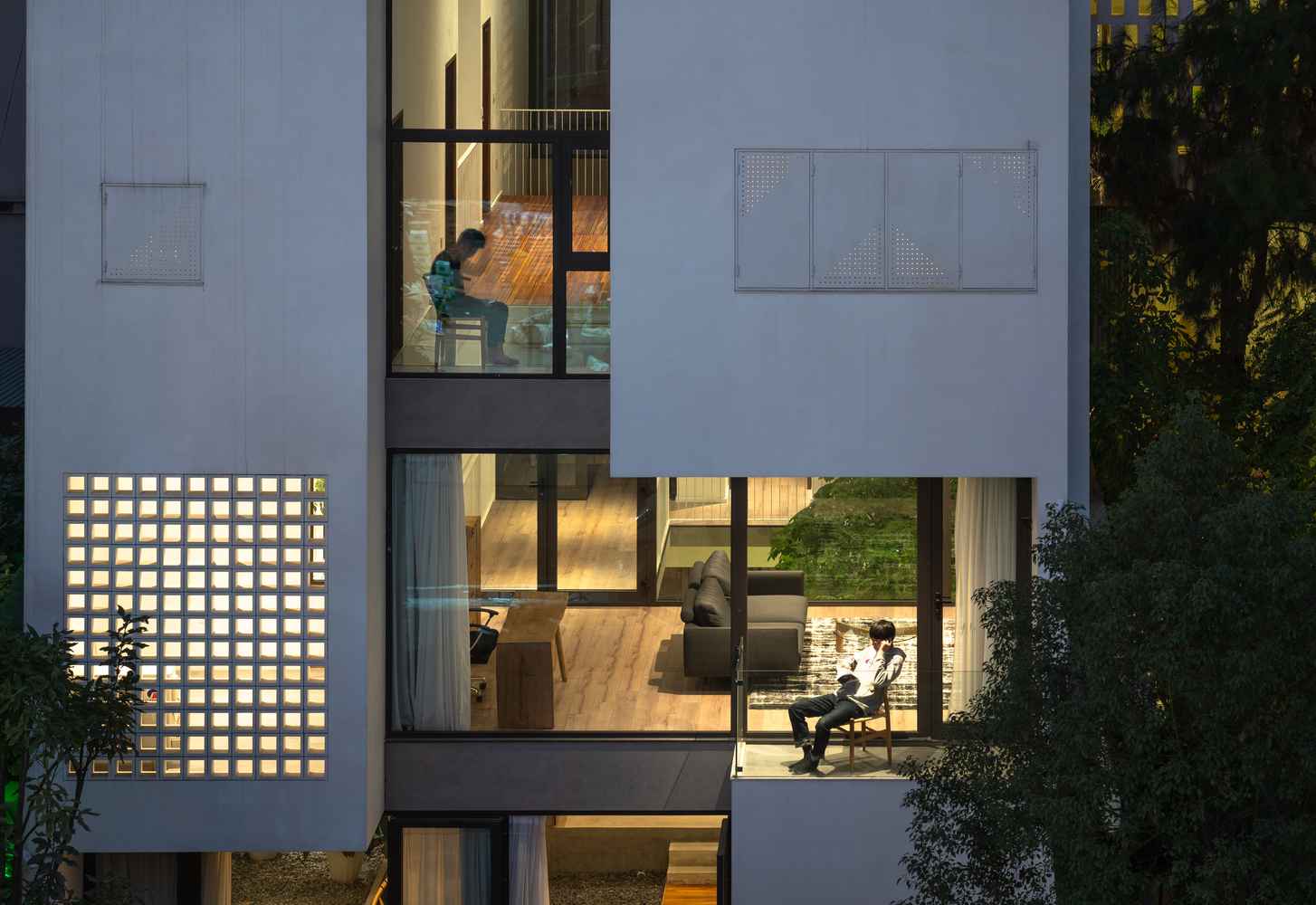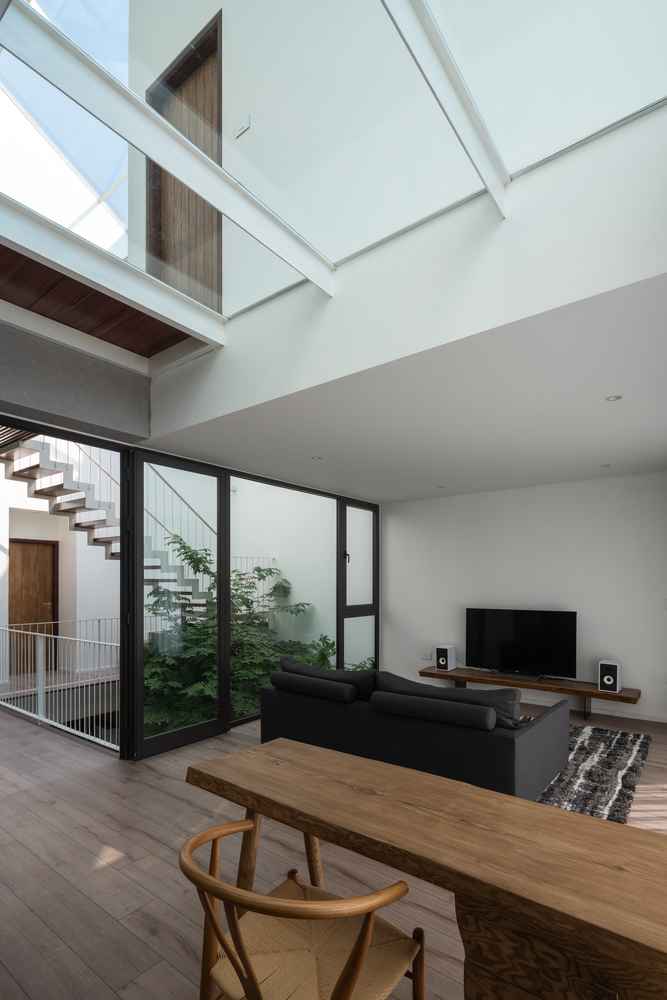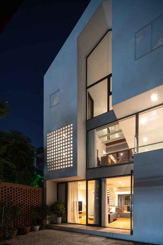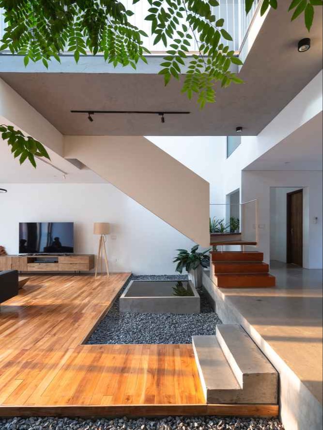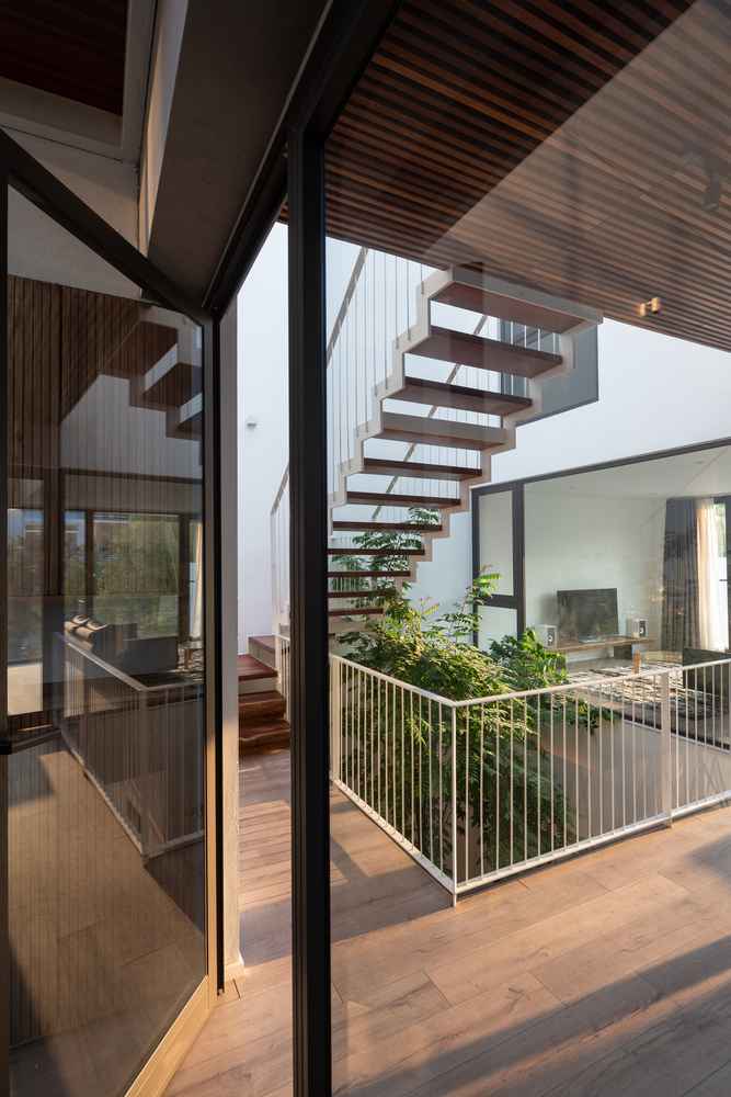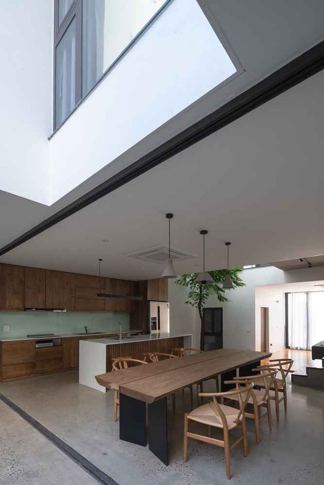 W takim duchu powstał dom Ha Long o powierzchni 300 m², położony około kilometra od nabrzeża. Zaprojektowano go tak, by mieszkańcy mogli w naturalny sposób czuć powiew morskiego powietrza, a otwarte przestrzenie swobodnie łączyły się ze sobą bez wyraźnych granic. Strefy prywatne pozostawiono tylko tam, gdzie były niezbędne, natomiast pozostałe części domu łączą się w jeden duży, żywy organizm. Żona sprzątająca podwórze z przodu może rozmawiać z mężem pracującym w ogrodzie z tyłu, a dzieci bawiące się na piętrze mają stały kontakt wzrokowy z rodzicami. To architektura, która oddycha i integruje mieszkańców.