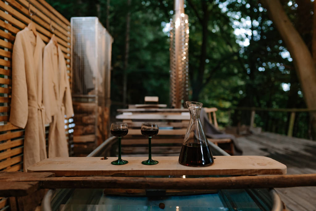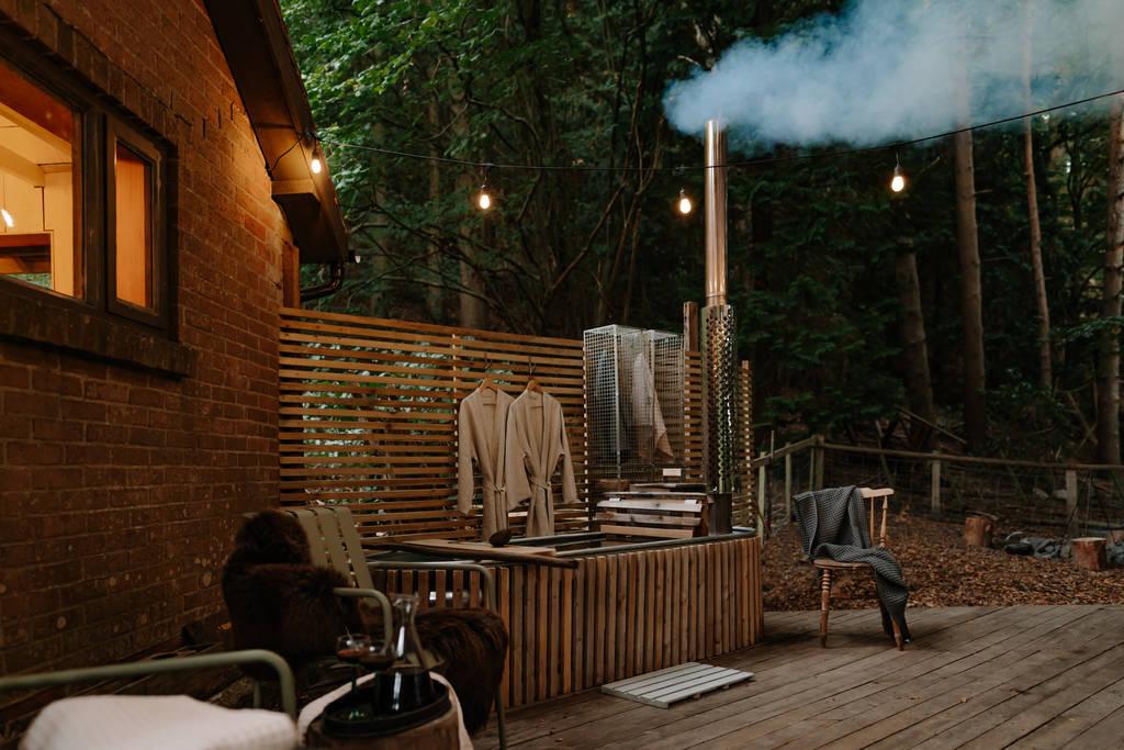 Istotną rolę odgrywa także przestrzeń zewnętrzna. Taras, palenisko i zewnętrzna balia tworzą naturalne przedłużenie wnętrza, pozwalając korzystać z otoczenia o każdej porze roku. Projekt wykorzystuje walory miejsca – od dzikiej przyrody i leśnych ścieżek po wyjątkowo ciemne niebo sprzyjające obserwacji gwiazd.