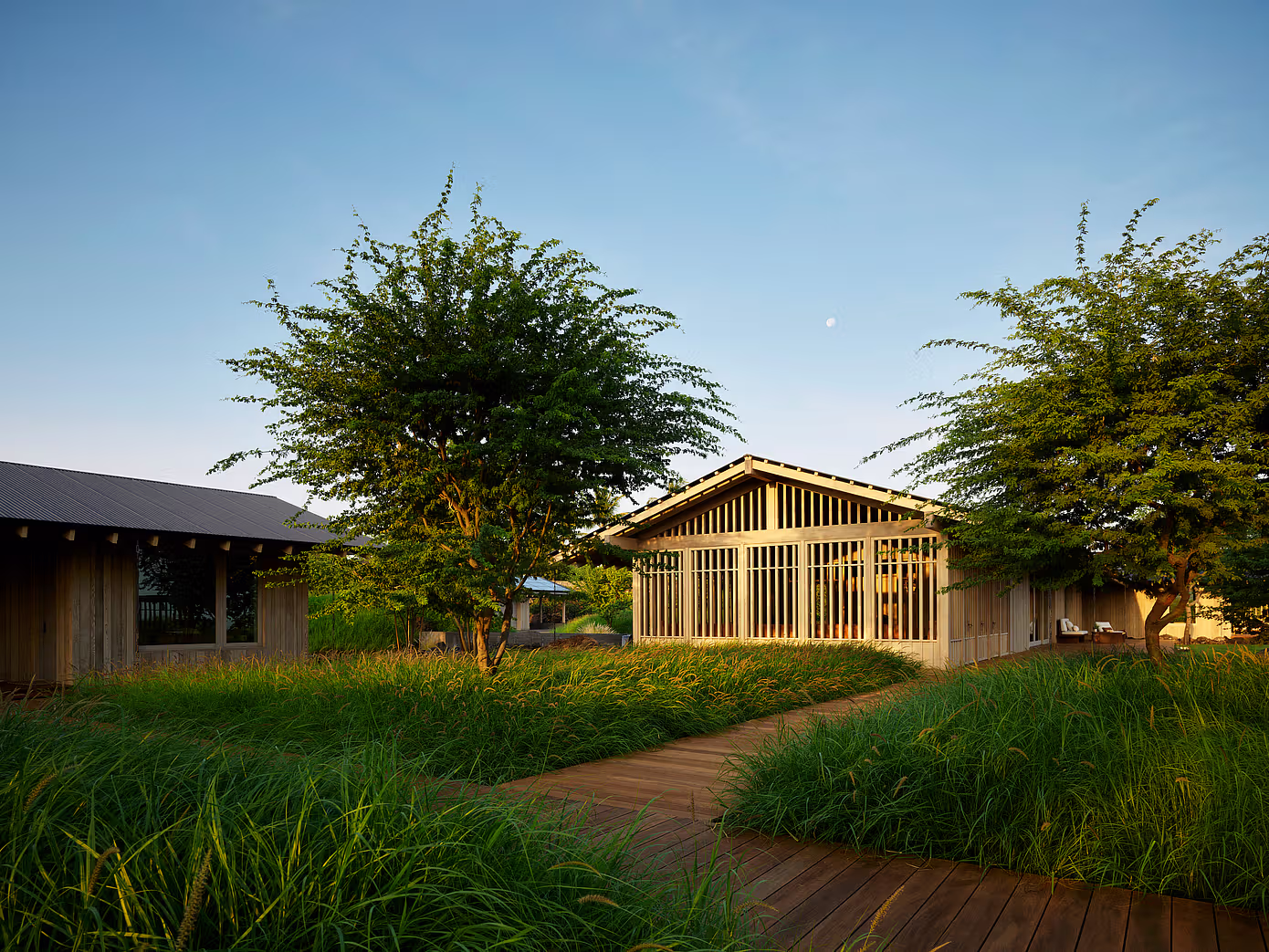 Forma architektoniczna nawiązuje do dawnej zabudowy rolniczej regionu – proste linie, geometryczne bryły i stonowana paleta barw wpisują się w kontekst krajobrazu, nie dominując nad nim. Drewno, kamień, szkło i stal tworzą spójną, spokojną całość, która pozwala skupić uwagę na otaczającej naturze.