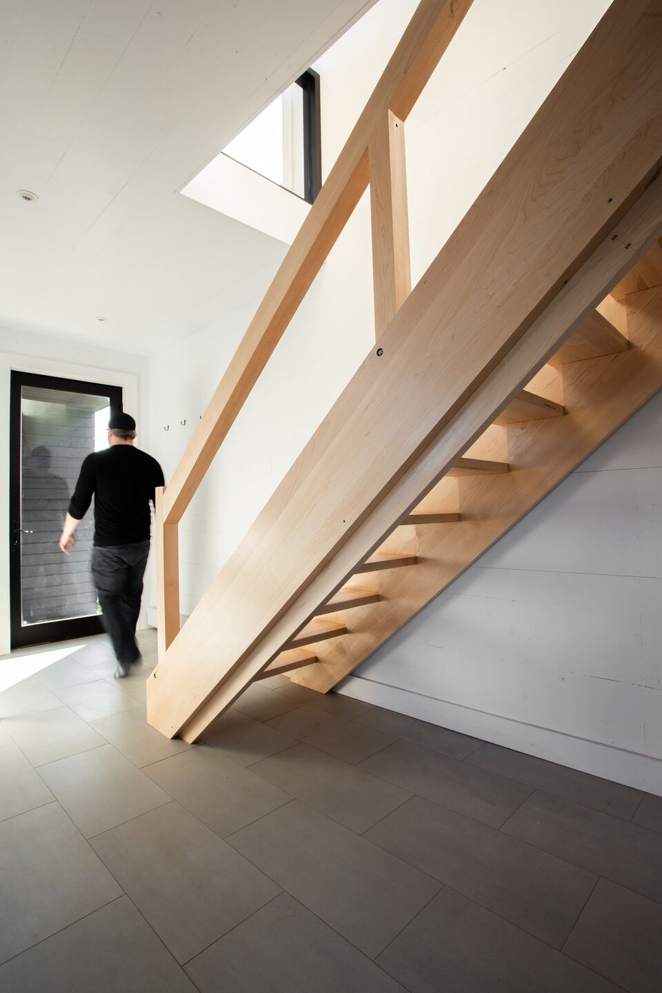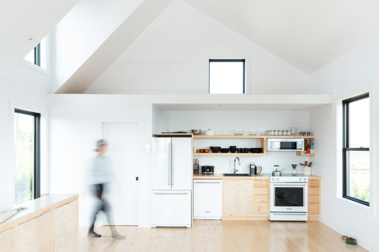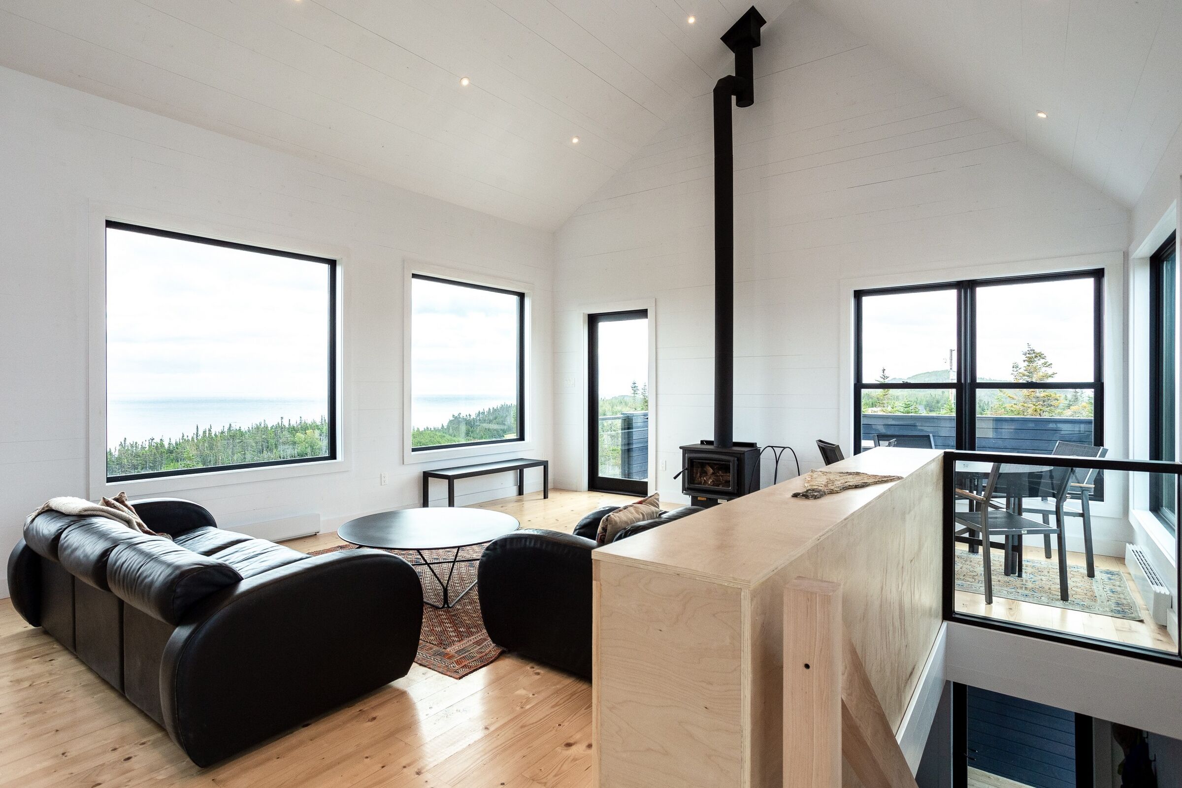 Całe górne piętro stanowi otwarta strefa dzienna – salon, kuchnia i jadalnia – zaprojektowana z myślą o naturalnym świetle i krajobrazie. Z okien oraz tarasu roztaczają się zapierające dech w piersiach widoki na zatokę Trinity Bay, Fox Island oraz latarnię morską, widoczną z jadalni umieszczonej nad wejściem.