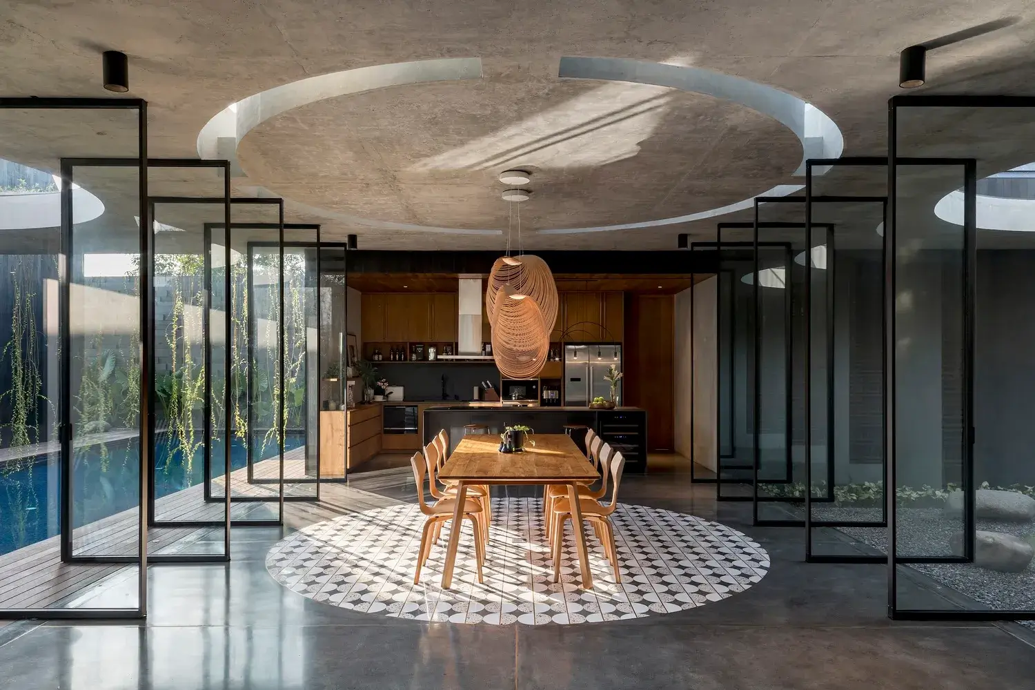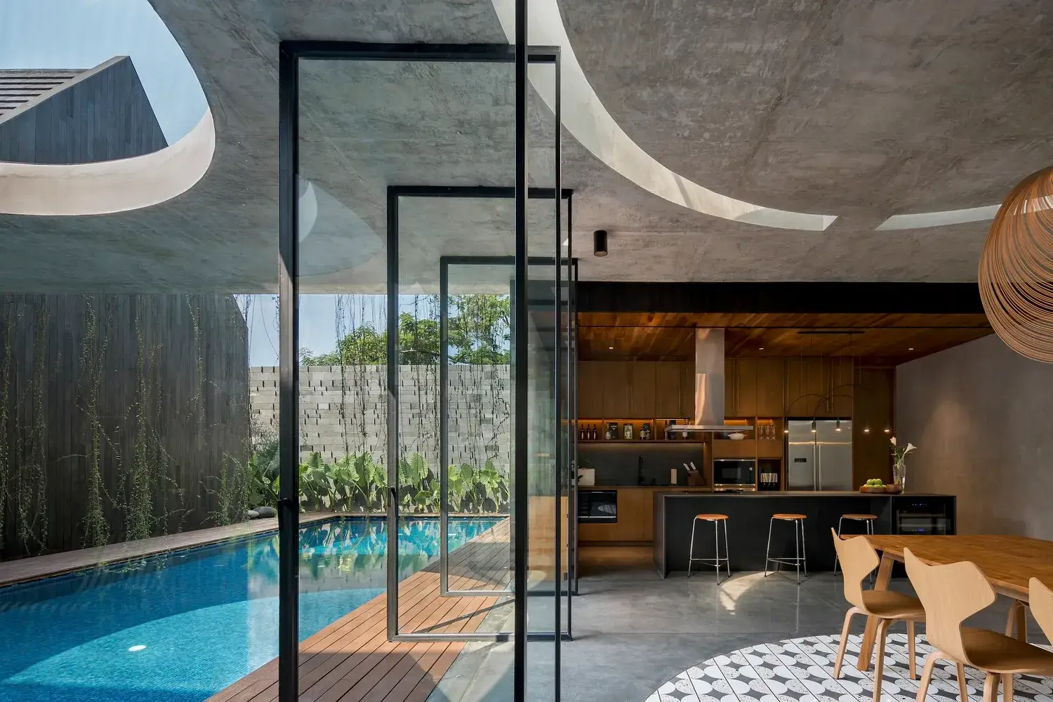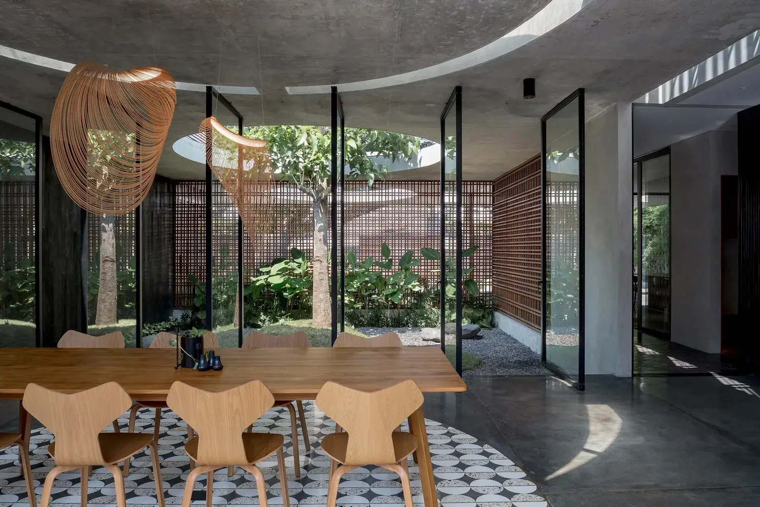 Dom tworzy wiele warstw wewnątrz i na zewnątrz. Dzięki temu każde pomieszczenie ma dostęp do powietrza i światła z dwóch stron pomieszczenia. W domu zastosowano również strategię projektowania pasywnego poprzez wydłużone umieszczenie bryły drugiego piętra po zachodniej stronie domu, tak aby po południu zapewniała cień reszcie domu. Strona zachodnia ma dość solidną elewację, wpuszczającą światło i powietrze do domu jedynie poprzez drewnianą osłonę umieszczoną na zachodnim dziedzińcu i schody. Od strony wschodniej elewację w całości pokryto drewnianym parawanem, który pełni funkcję podwójnej powłoki. Delikatnie filtruje poranne słońce, tworząc w korytarzu szereg promieni słonecznych i cieni.