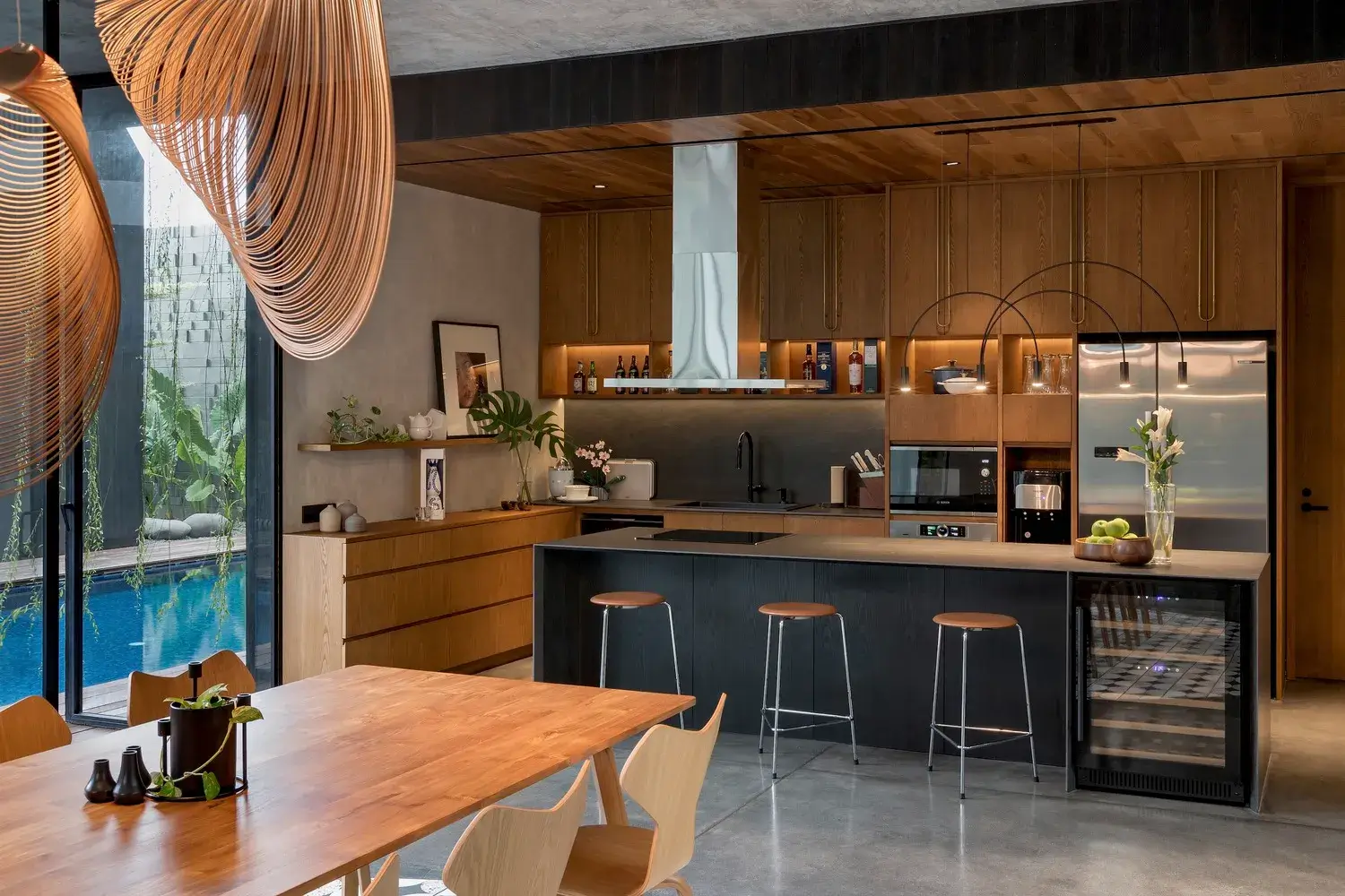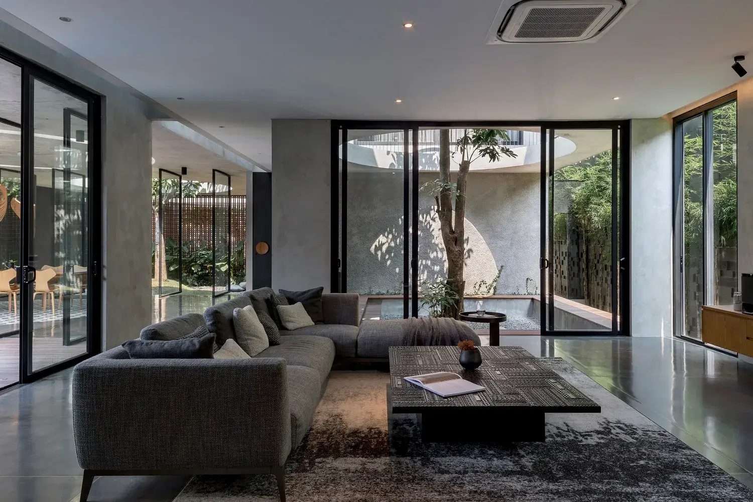 Zewnętrzną część domu w większości pokryto czarnym opalanym drewnem. Aby zrównoważyć ciemność zwęglonej elewacji, we wnętrzu zastosowano głównie drewniane meble, surowy beton na ściany i polerowany beton na podłogi. Zastosowane materiały to odpowiedź na specyfikę potrzeb użytkownika. Dom zaprojektowano dla młodego małżeństwa z trójką małych dzieci. Ponieważ dzieci są uczulone na futro lub wełnę, w domu nie używa się dywanów. W odpowiedzi na to w całym domu zastosowano ręcznie robione, niestandardowe płytki, które zapewniają wyjątkowe wrażenia dotykowe i zastępują dywany.