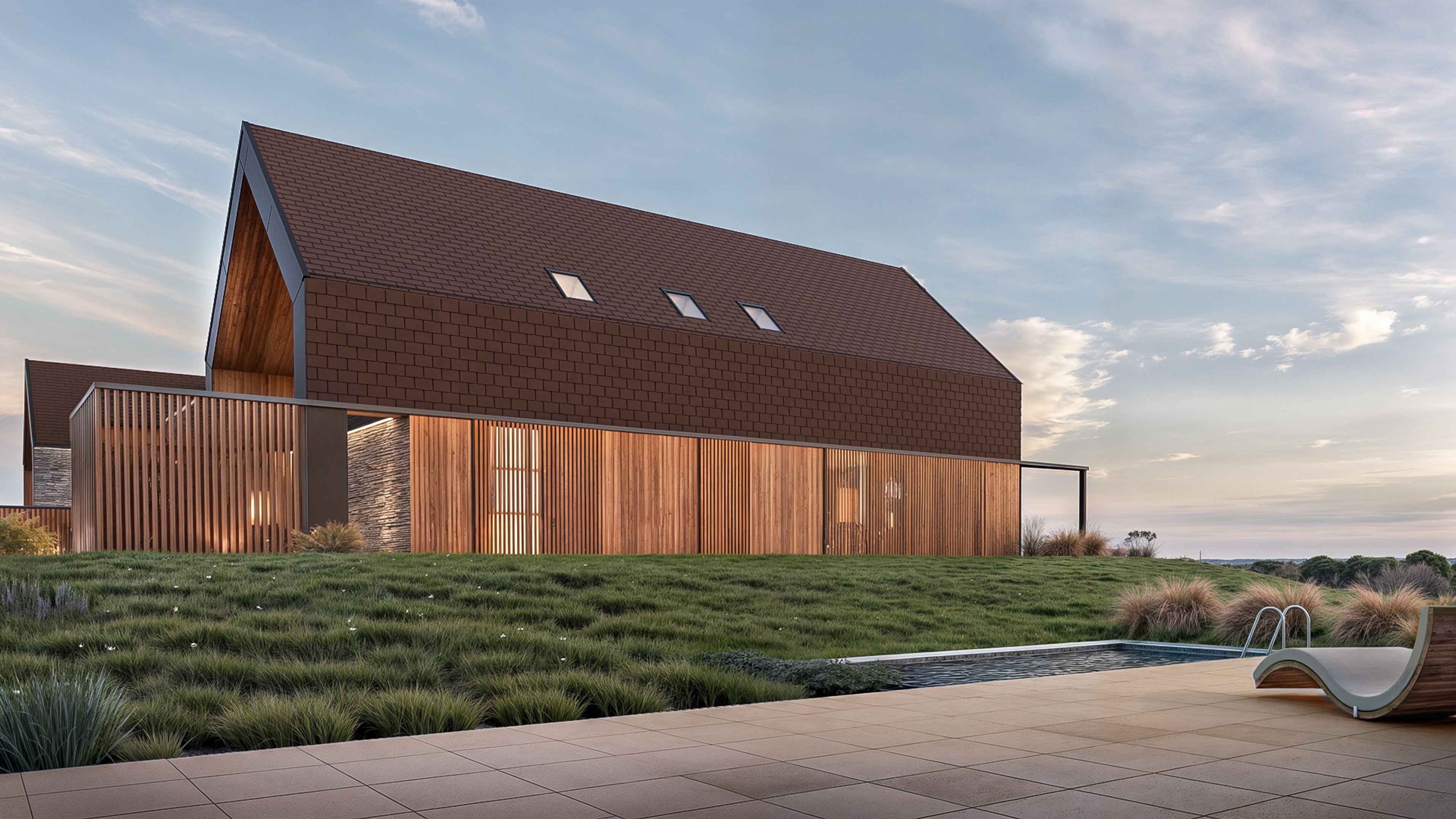 Architektura domów nawiązuje do tradycji budowania w tej części Polski, reinterpretując ją w duchu nowoczesnej stodoły. Elewacje pokryto naturalnymi materiałami — łupkiem szarogłazowym, którego faktura przywołuje skojarzenia z lokalnym kamieniem polnym. Dachy z ręcznie formowanej dachówki ceramicznej podkreślają rzemieślniczy charakter projektu, a stonowana paleta barw wtapia budynki w otaczający krajobraz.