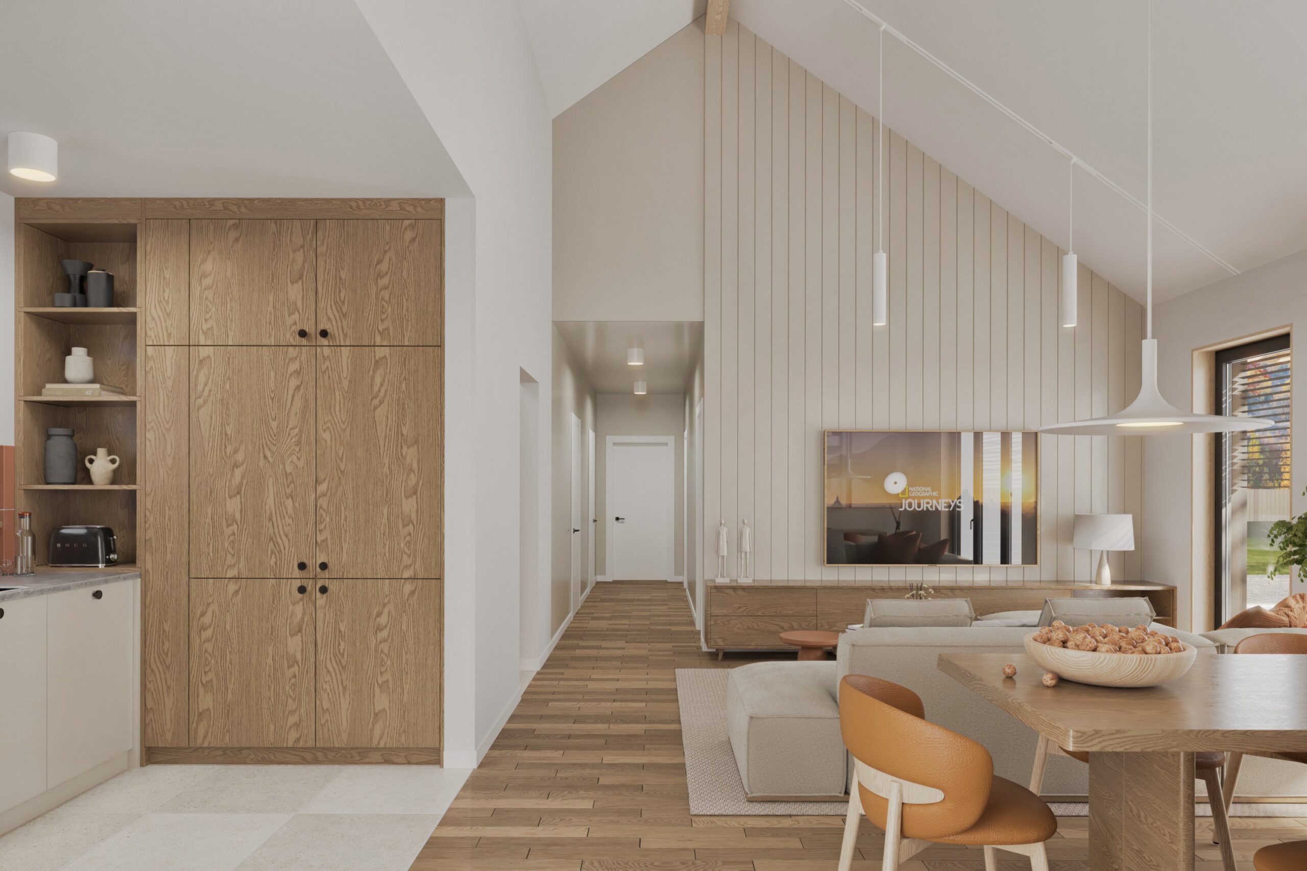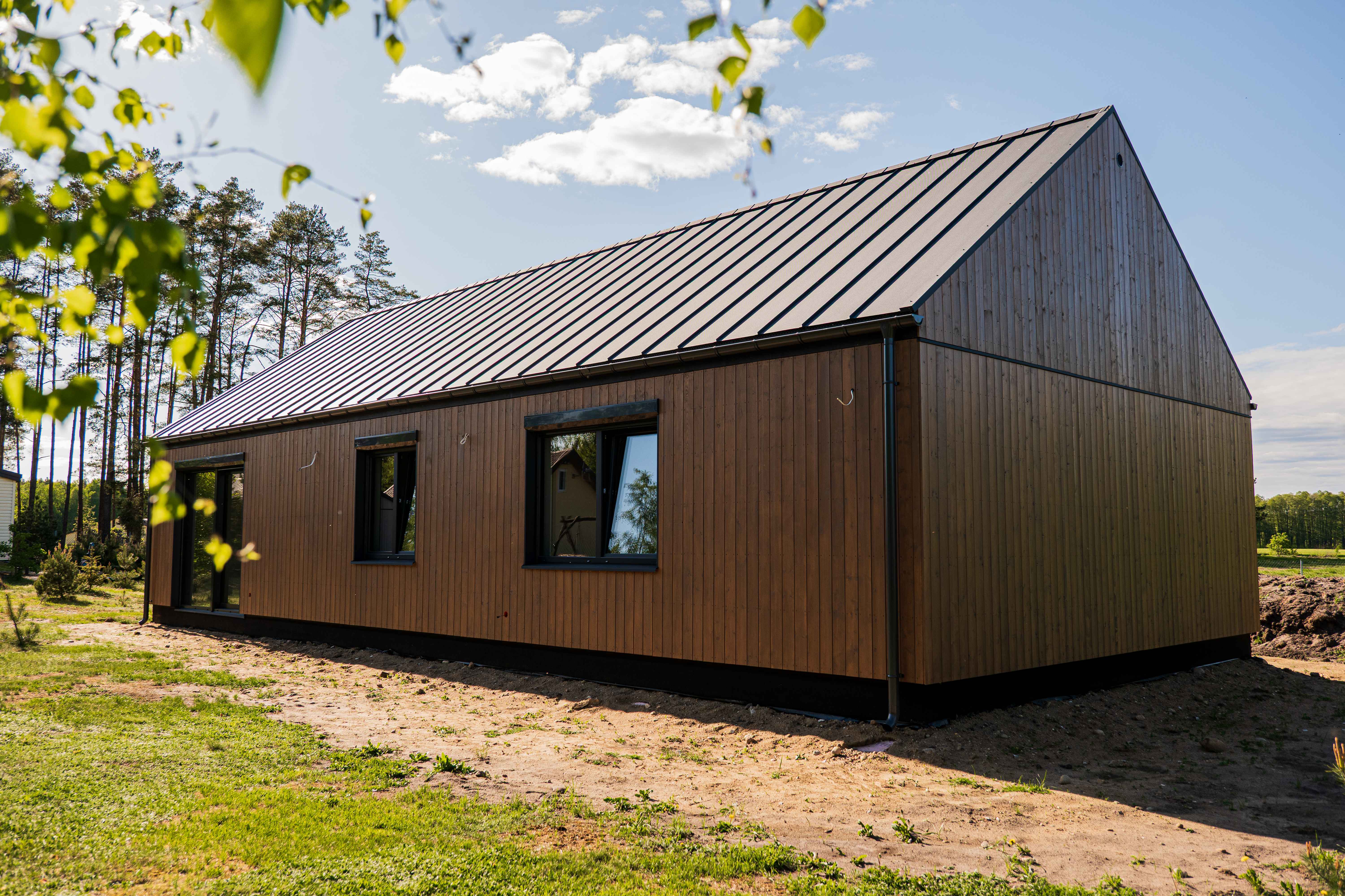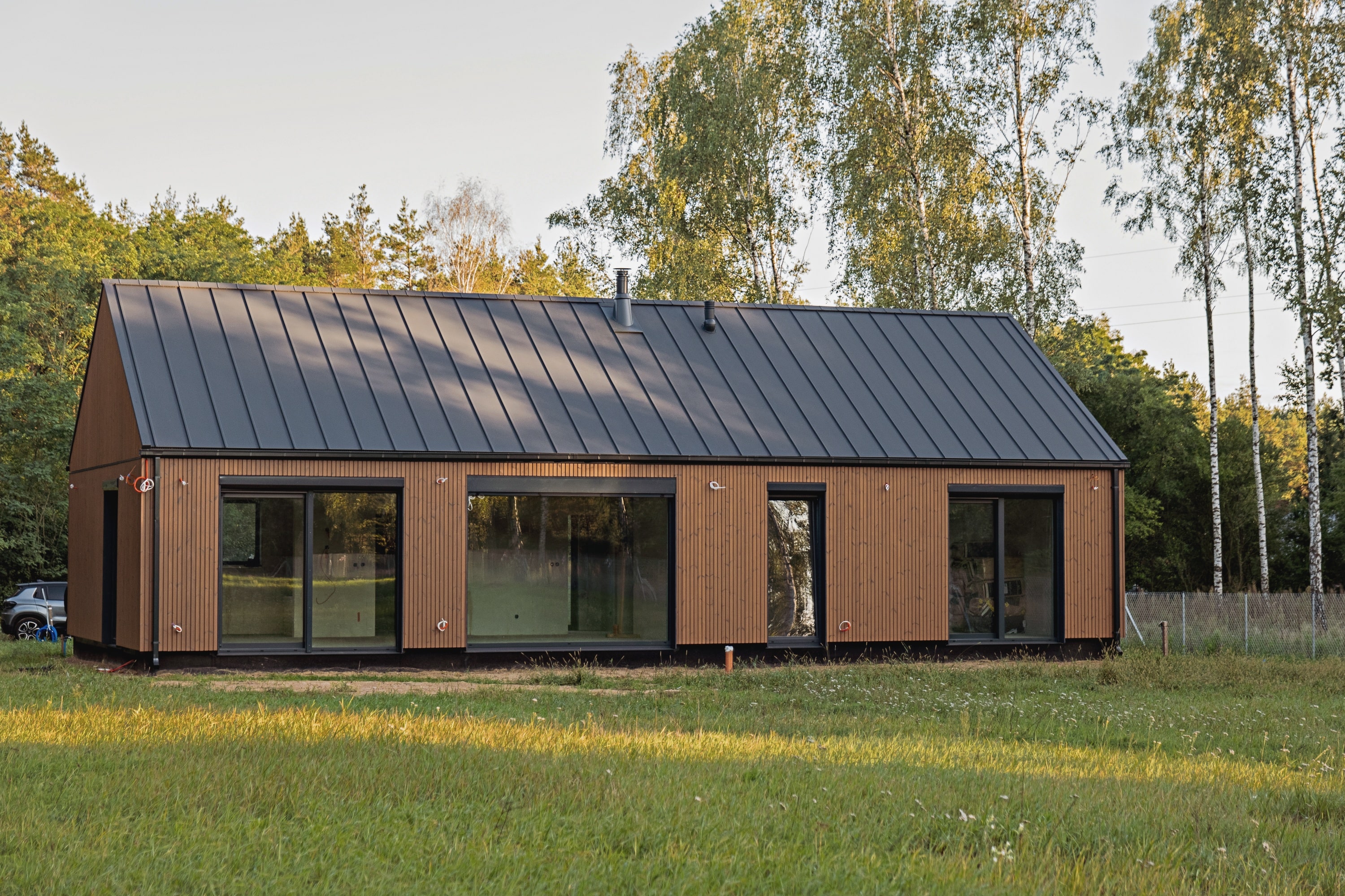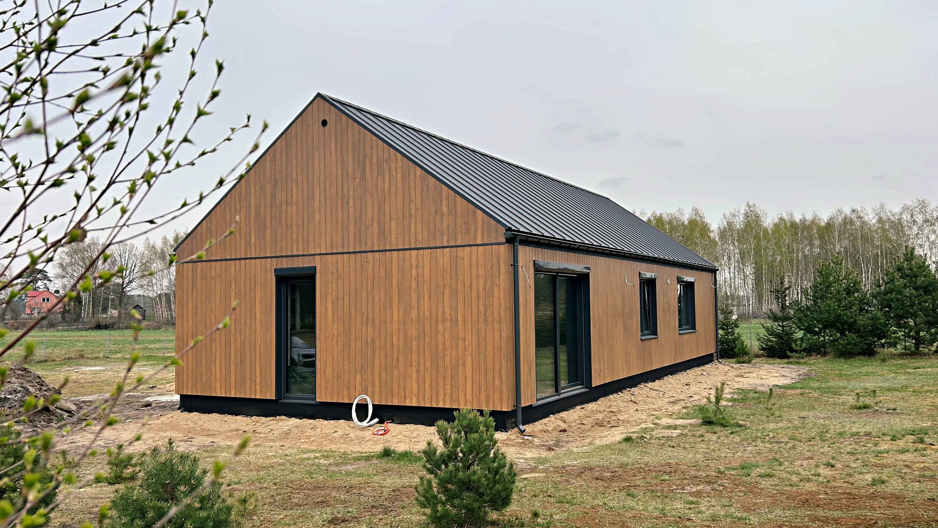 Ogromne przeszklenia nie są tu dodatkiem — są ideą. Modularen zaprojektował Grand House 103 jako dom otwarty, który rozmywa granicę między wnętrzem a ogrodem. Dzięki panoramicznym oknom wnętrze wypełnia się naturalnym światłem, a otoczenie staje się częścią codziennego życia. W efekcie mieszkańcy zyskują coś więcej niż metry kwadratowe — zyskują rytm dnia wyznaczany przez słońce, szum drzew i ciszę. Elewacja wykończona deską thermo to kolejny gest w stronę natury. Ciepły odcień drewna kontrastuje z nowoczesną bryłą, tworząc efekt ponadczasowej elegancji. Z bliska widać strukturę włókien, z daleka – harmonijną linię, która wpisuje dom w krajobraz.