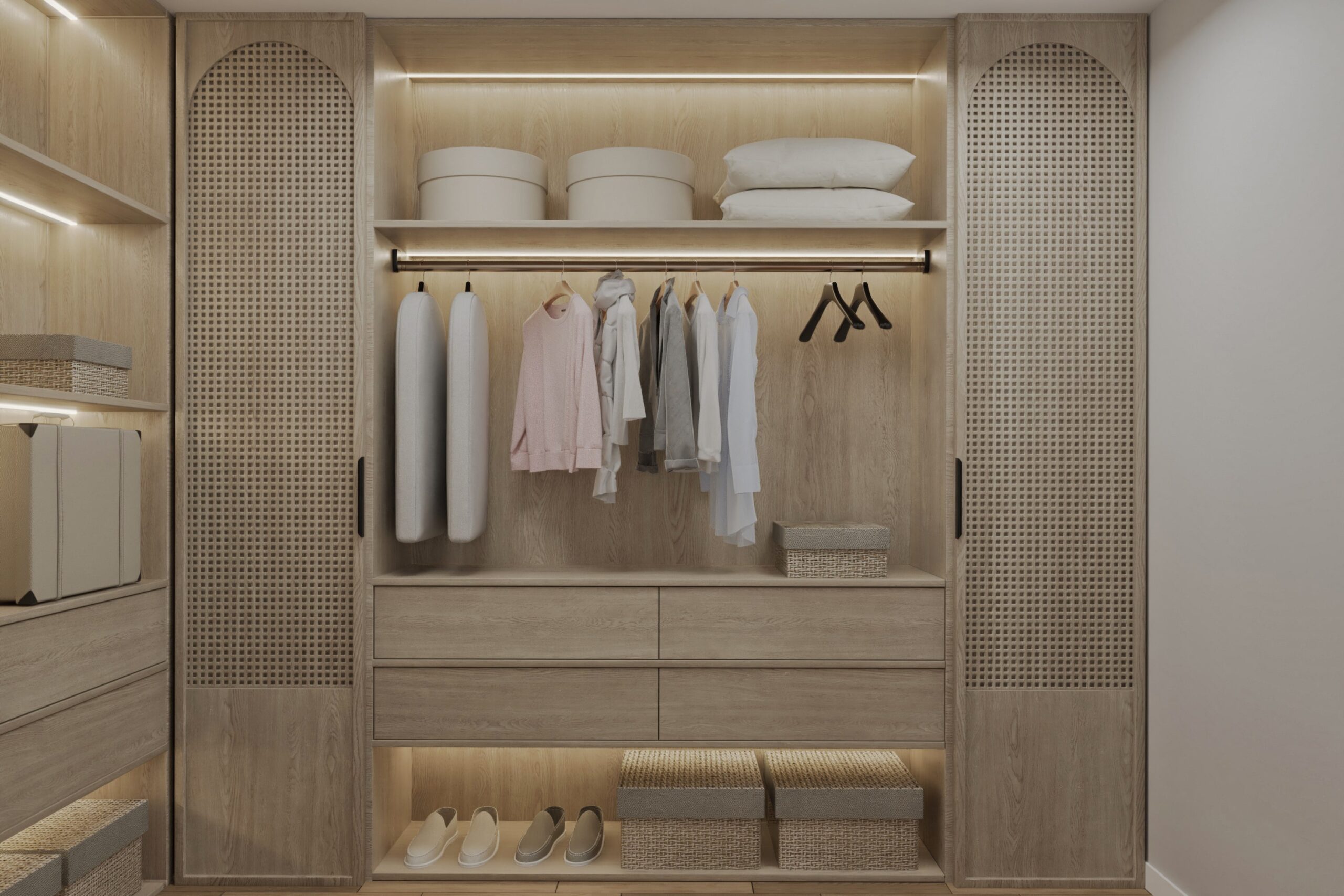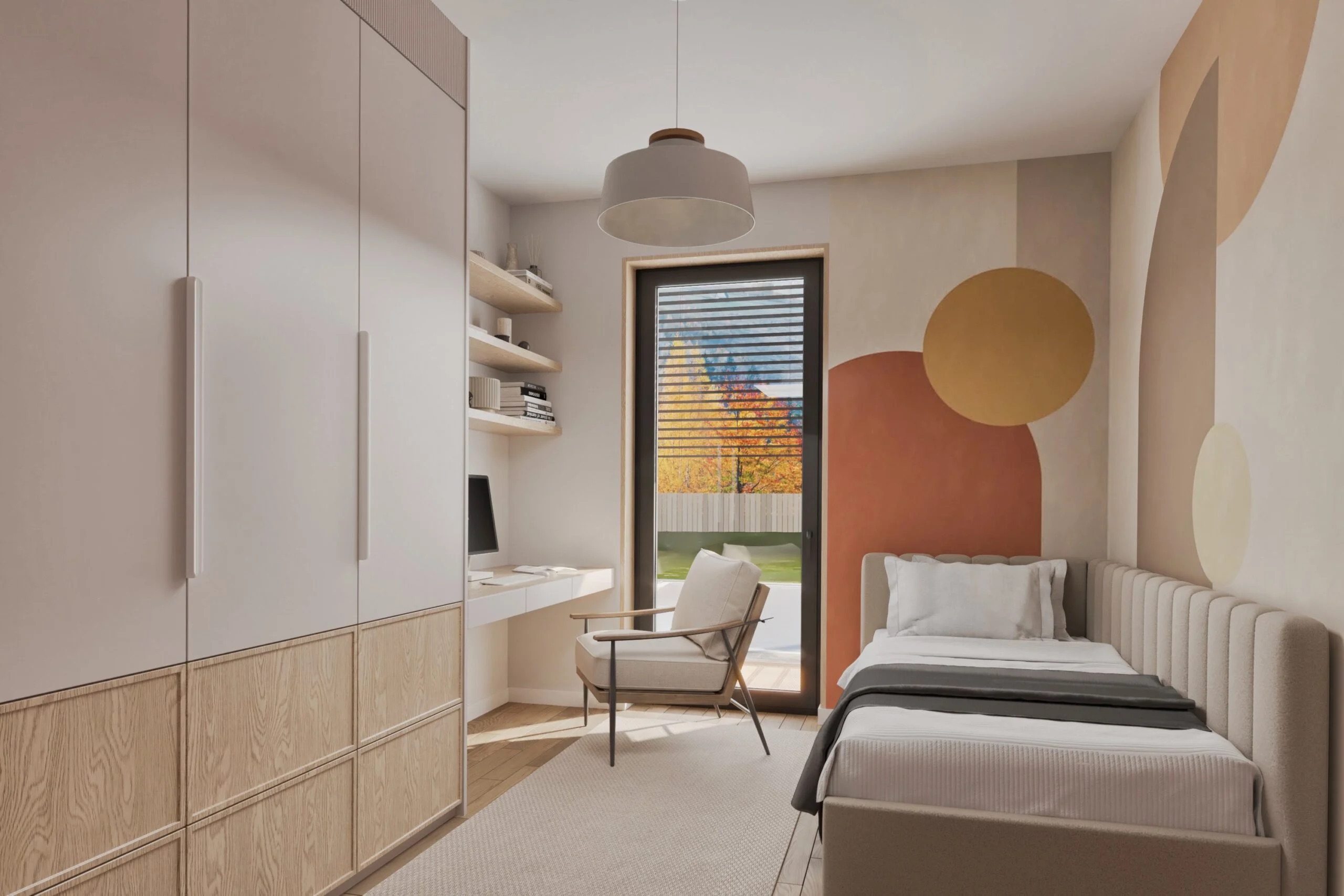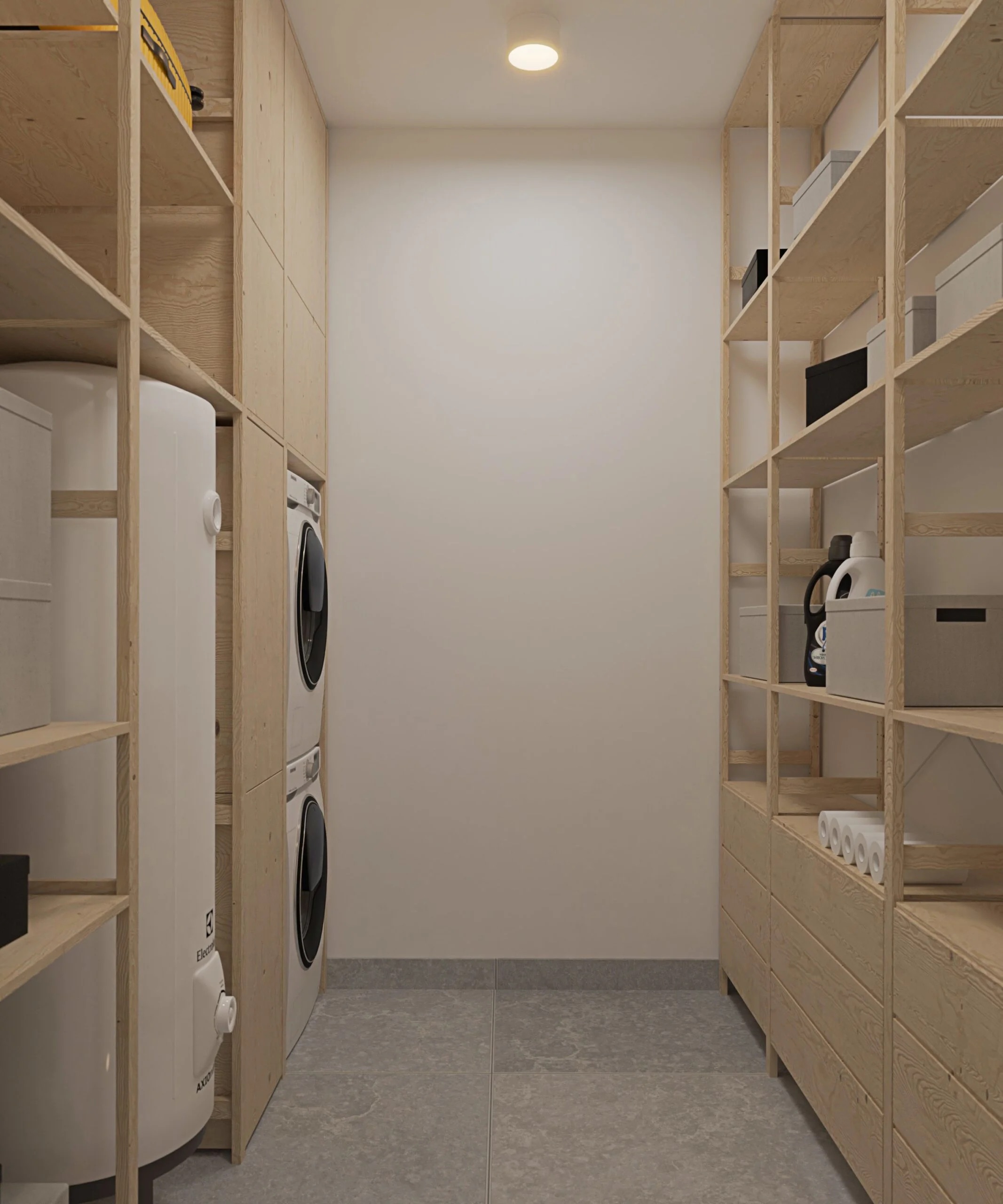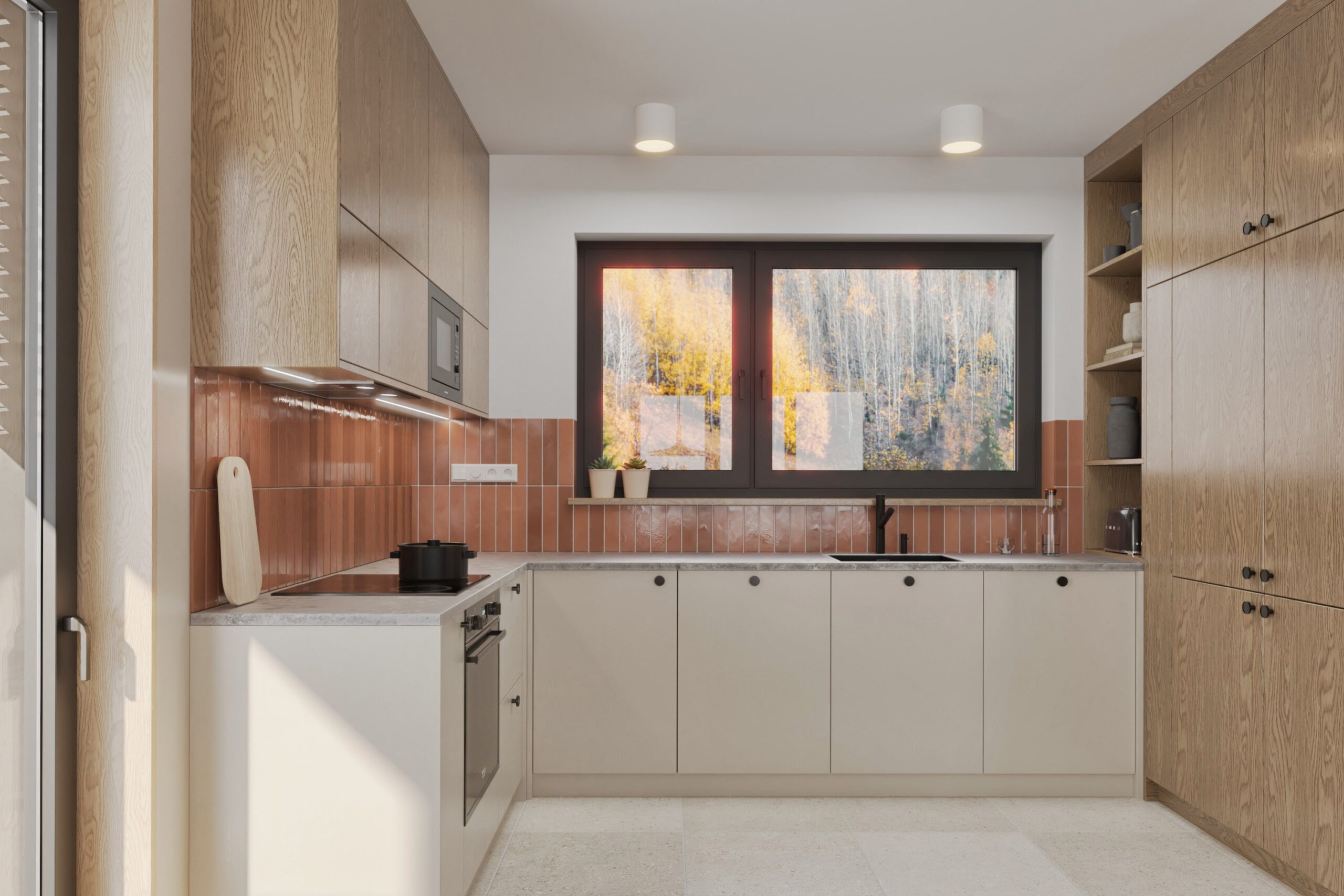 Ogromne przeszklenia nie są tu dodatkiem — są ideą. Modularen zaprojektował Grand House 103 jako dom otwarty, który rozmywa granicę między wnętrzem a ogrodem. Dzięki panoramicznym oknom wnętrze wypełnia się naturalnym światłem, a otoczenie staje się częścią codziennego życia. W efekcie mieszkańcy zyskują coś więcej niż metry kwadratowe — zyskują rytm dnia wyznaczany przez słońce, szum drzew i ciszę. Elewacja wykończona deską thermo to kolejny gest w stronę natury. Ciepły odcień drewna kontrastuje z nowoczesną bryłą, tworząc efekt ponadczasowej elegancji. Z bliska widać strukturę włókien, z daleka – harmonijną linię, która wpisuje dom w krajobraz.
