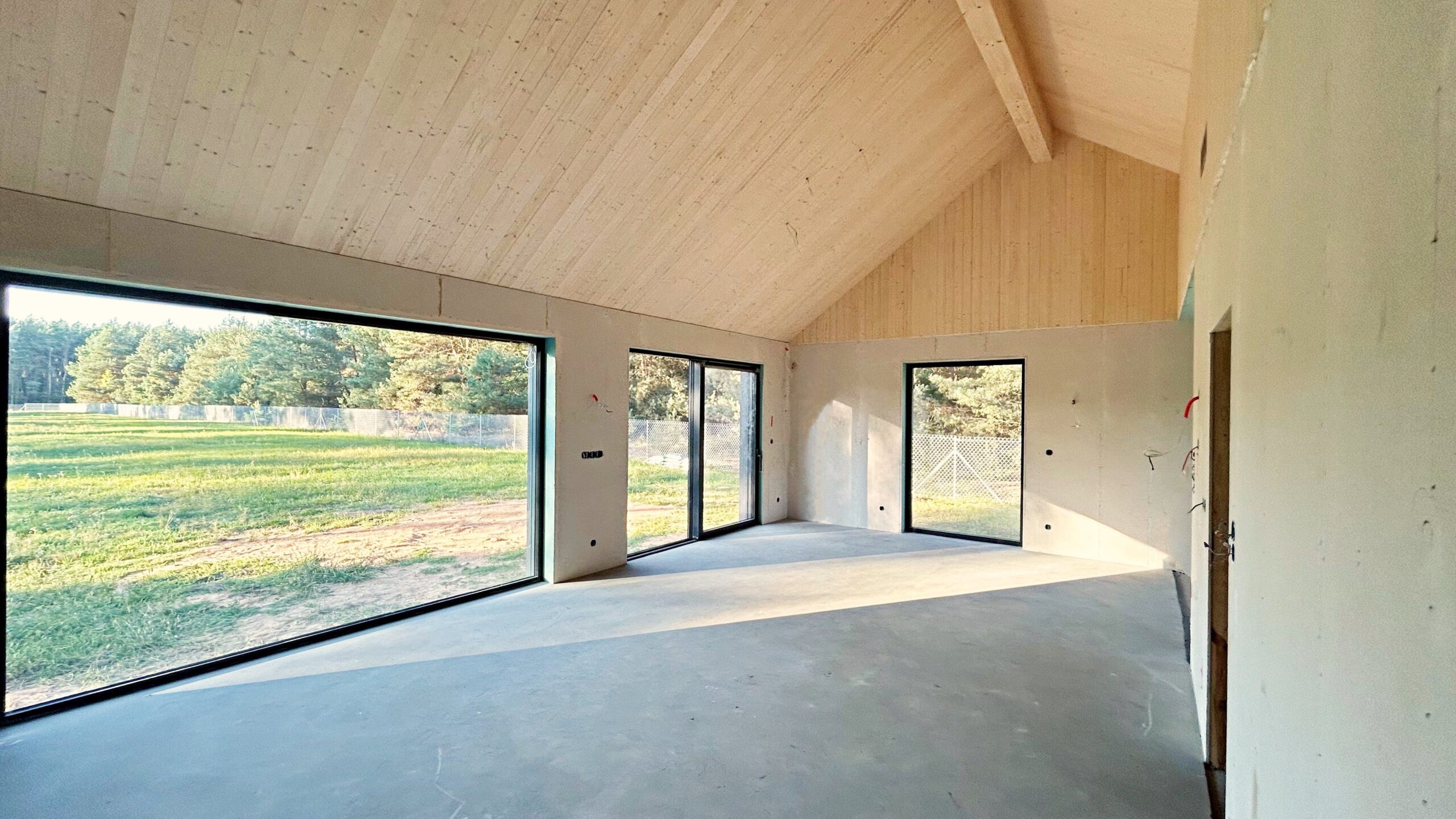 Jak przystało na realizację Modularen, Grand House 103 to nie tylko design, ale też technologia. Konstrukcja oparta jest na prefabrykacie szkieletowym z drewna C24 KVH i płyt Fermacell, co zapewnia trwałość, stabilność oraz doskonałą izolacyjność cieplną i akustyczną. Współczynnik przenikania ciepła U dla ścian wynosi 0,135 W/m²K — to parametry zbliżone do standardu pasywnego. Dom spełnia wymagania WT 2021 i może być wyposażony w pompę ciepła, rekuperację czy panele fotowoltaiczne. To dom, który nie tylko wygląda nowocześnie — on taki jest.