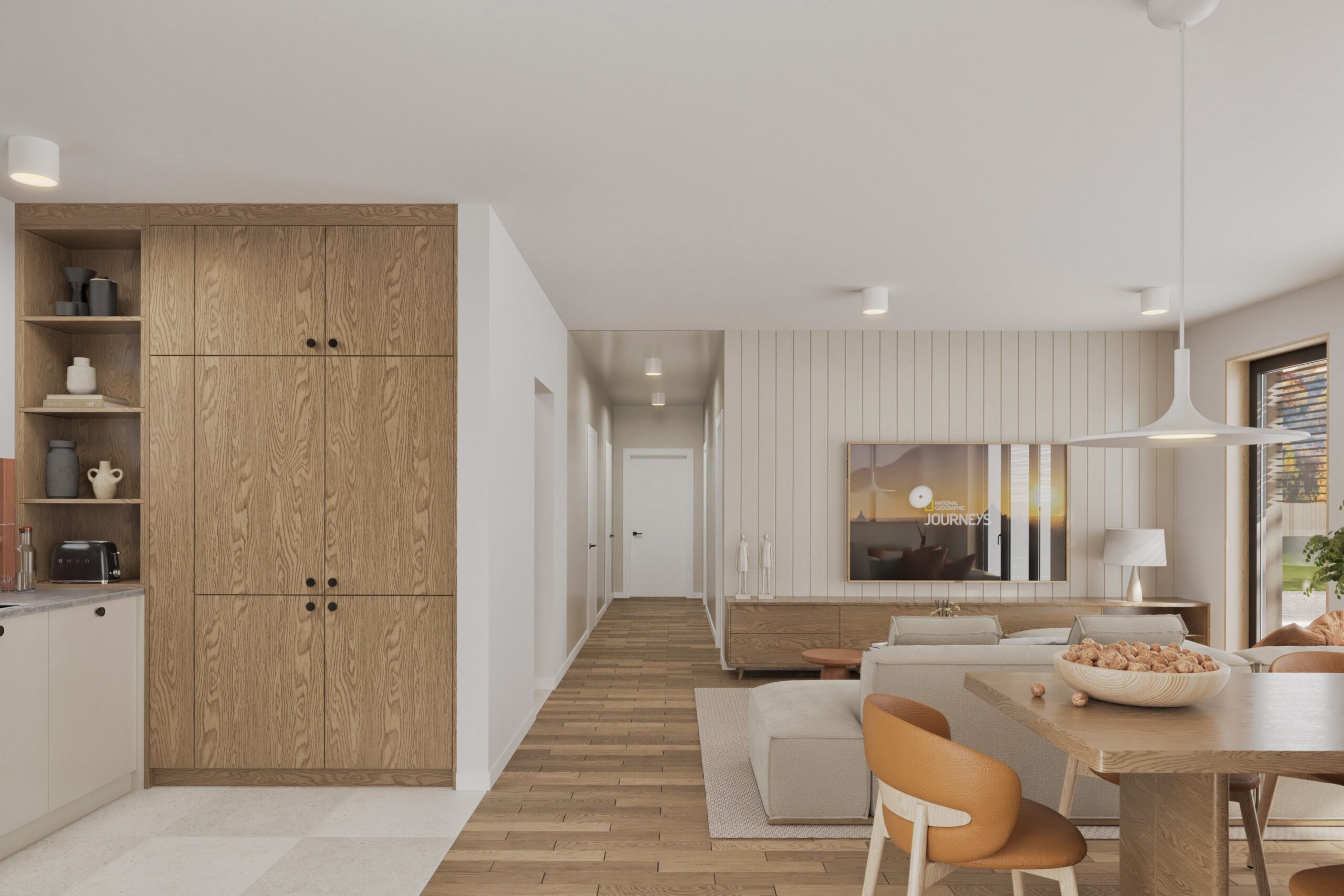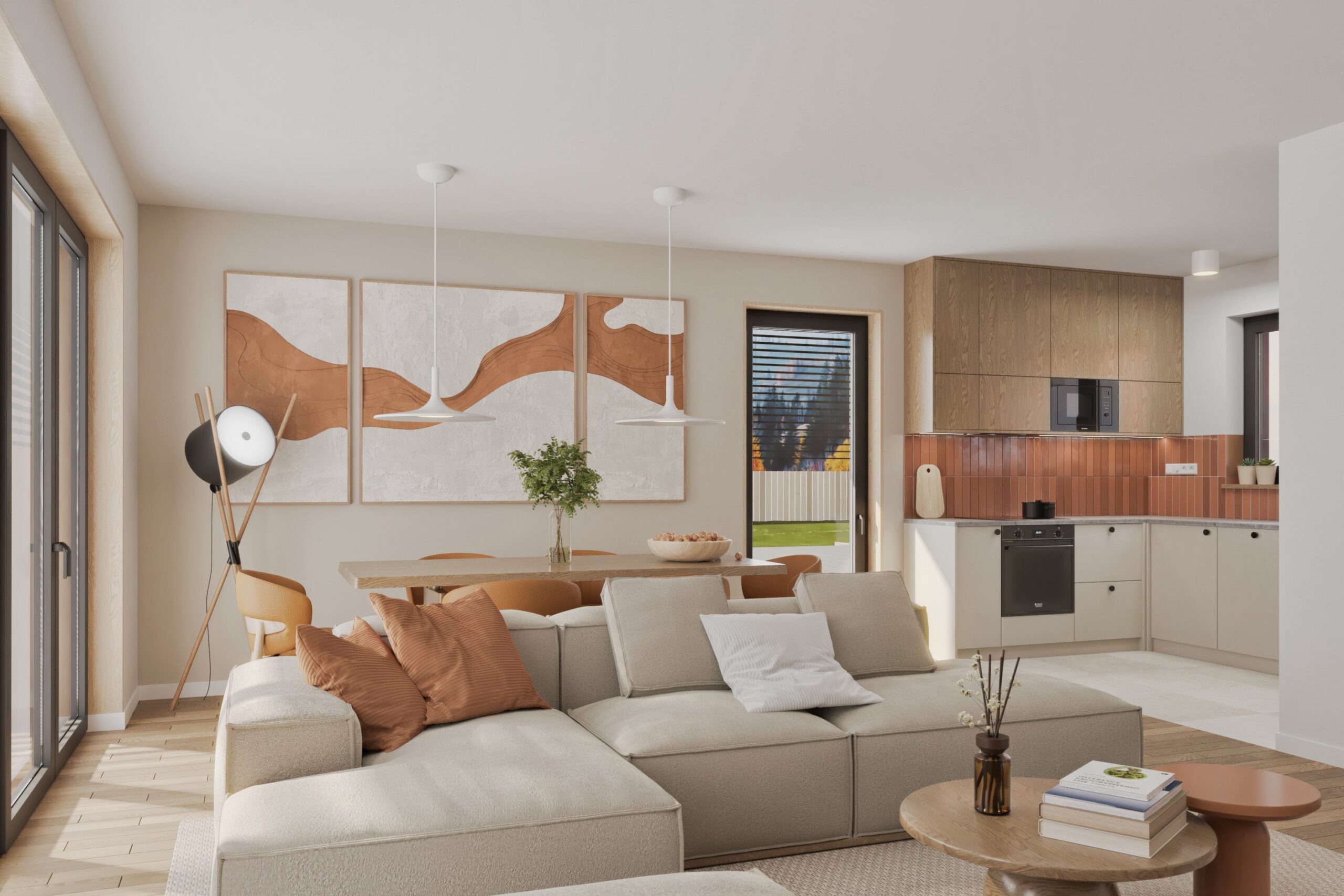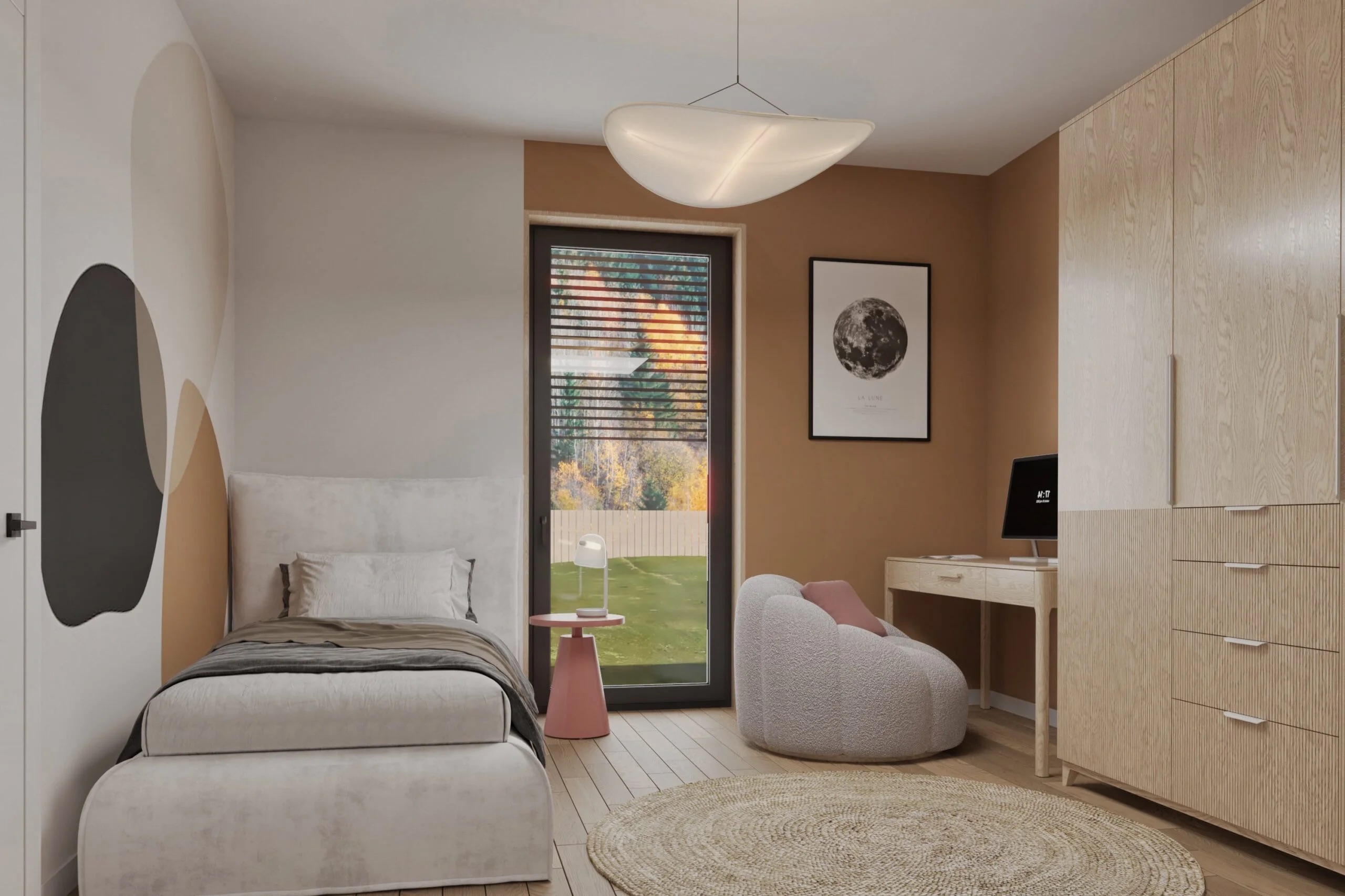 Grand House 103 to 103 m² czystej funkcjonalności i estetyki, zamknięte w prostej, klarownej bryle o powierzchni zabudowy 127 m². Projekt Modularen został opracowany z myślą o rodzinie, która ceni przestrzeń i harmonię życia codziennego. Centralnym punktem jest duży, otwarty salon z kominkiem — przestrzeń, w której światło, zapach drewna i widok na ogród tworzą atmosferę naturalnego spokoju. To serce domu, które nie tylko ogrzewa wnętrze, ale i buduje nastrój — szczególnie wieczorami, gdy przez duże przeszklenia widać migotanie ognia i refleksy światła na ścianach.