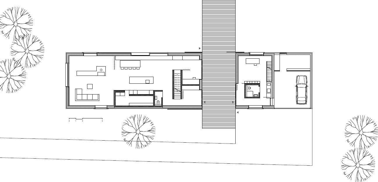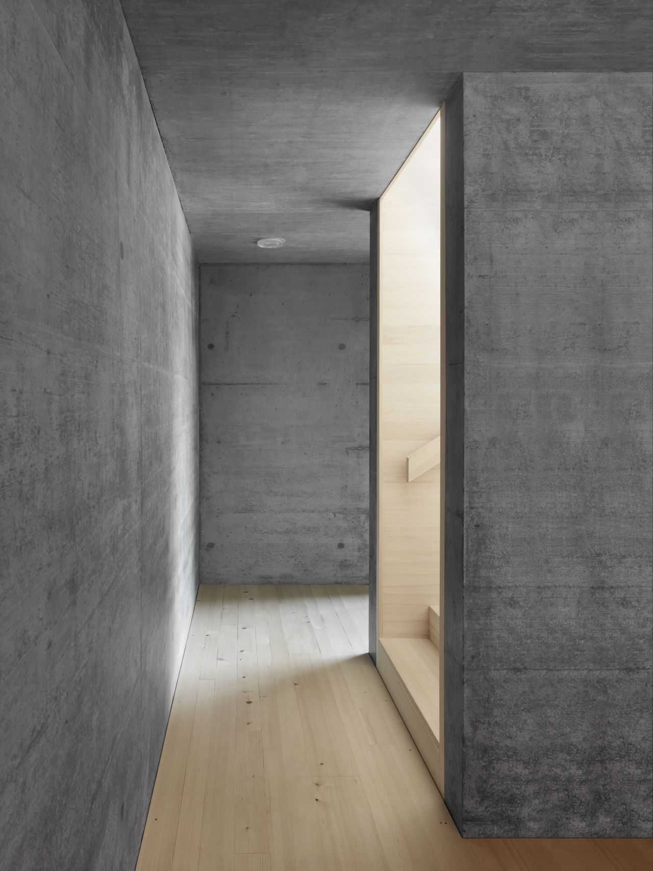 Konstrukcja budynku jest betonowa, co widać w niektórych miejscach oraz na sufitach. Odsłonięty beton przełamuje ciepło drewnianych powierzchni. Pomieszczenia dzienne oraz jadalnia zajmują największą część parteru, a piec opalany drewnem wprowadza bardziej wiejską, ciepłą atmosferę. Po drugiej stronie „tarasu” znajduje się domowe biuro, które sąsiaduje z garażem na dwa samochody. Sypialnie oraz pokój zabaw dla dzieci zorganizowano na piętrze.
