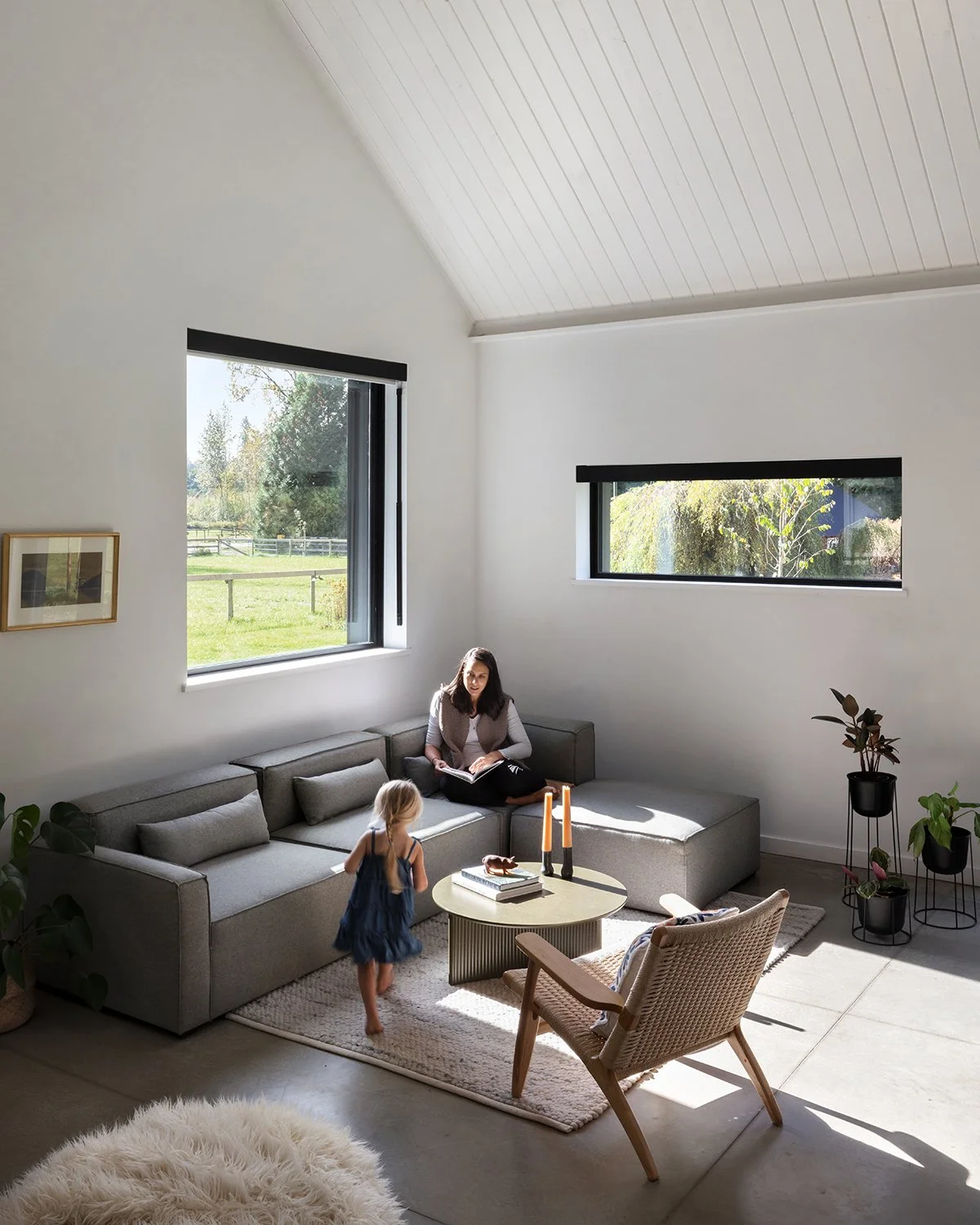 Wnętrze zostało zaprojektowane w otwartym planie z dużymi przeszkleniami i drzwiami wychodzącymi na patio oraz farmę, skąd roztaczają się widoki na zachodzące słońce. Okna rozlokowano w sposób nieregularny, tak aby tworzyły kadry otwierające się na różne fragmenty krajobrazu. Dodatkowo na poddaszu stworzono przestrzeń dla dziecka – miejsce swobodnej zabawy i twórczości, z dala od stref dziennych.