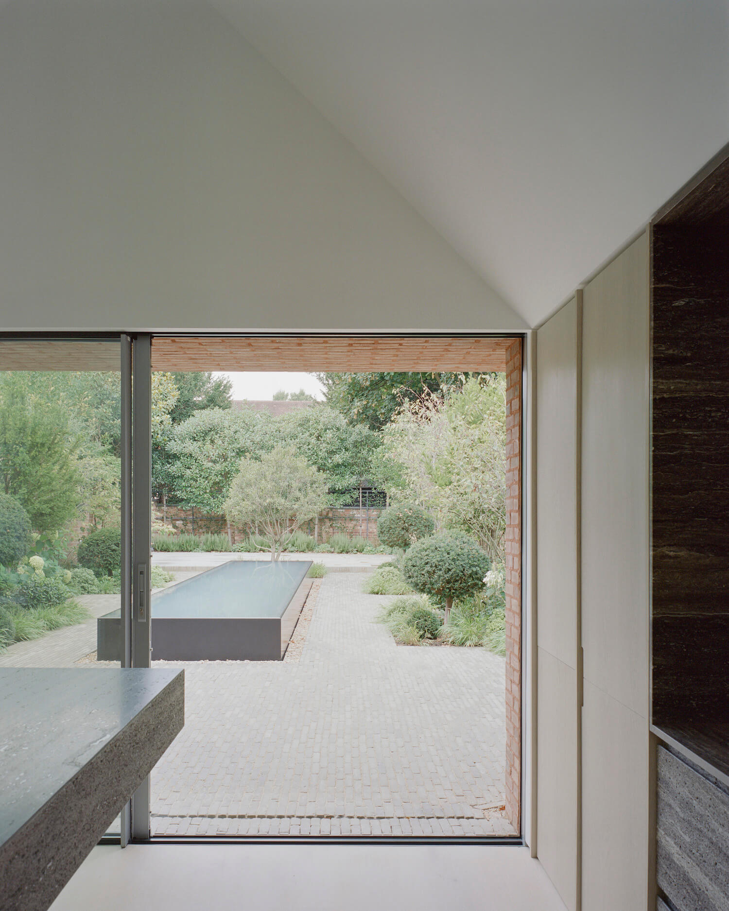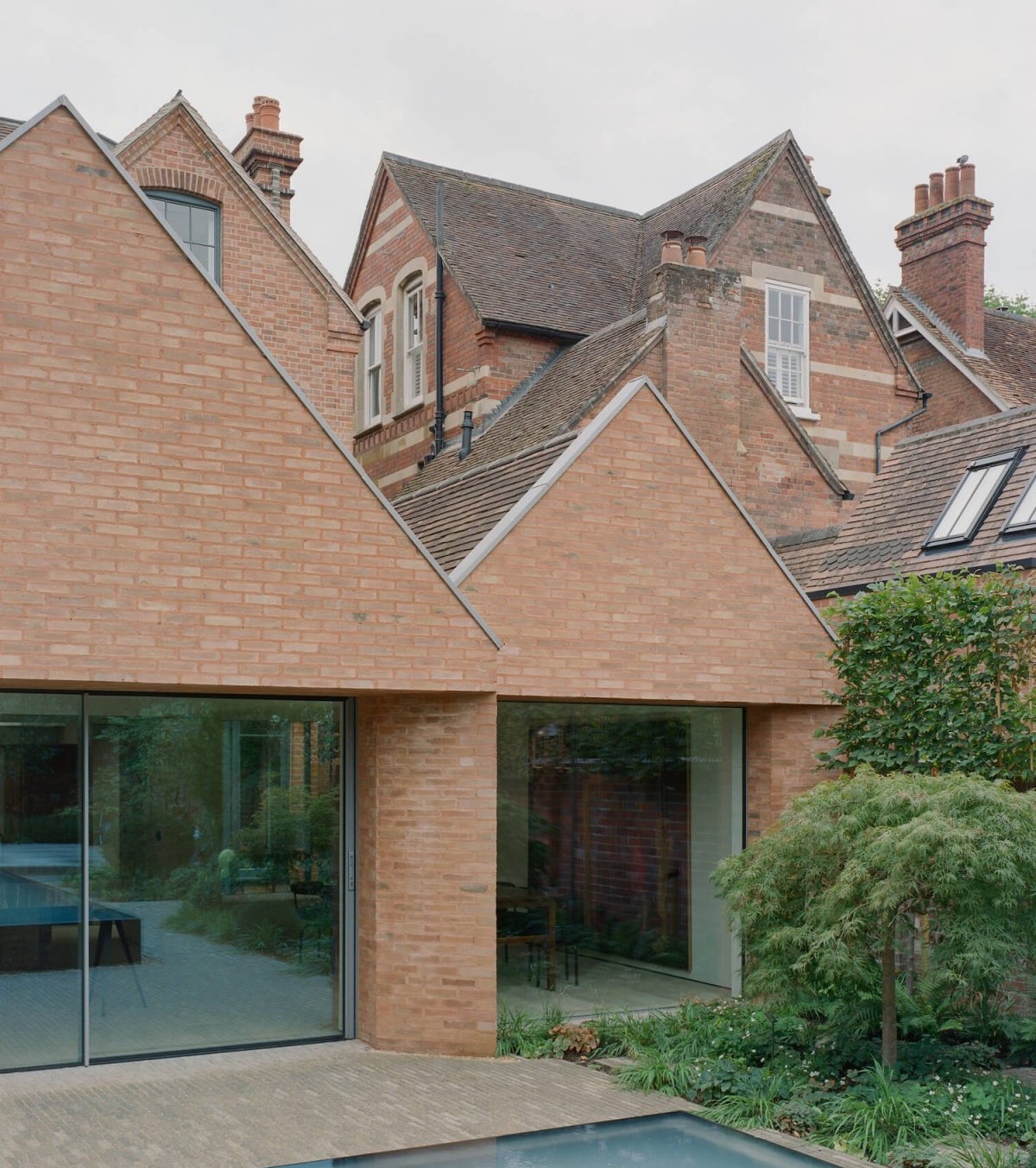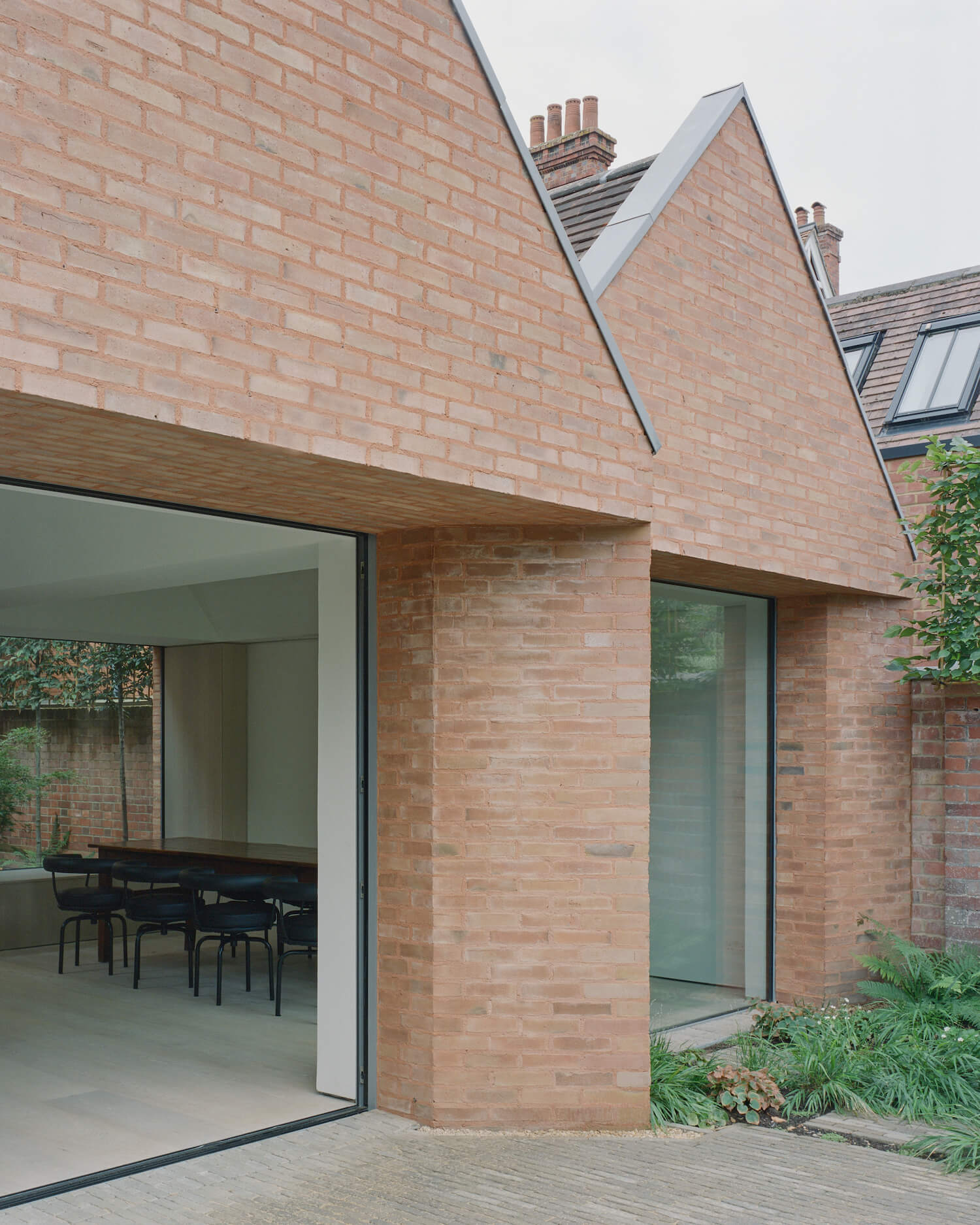 Ogród, zaprojektowany we współpracy z Seanem Walterem z Plant Specialist, wprowadza element wodny przypominający Tamizę, co stanowi ukłon w stronę pasji właścicieli do wioślarstwa. Wnętrze kontynuuje motyw cegły, który harmonijnie łączy się z dębową boazerią, usprawniając przestrzeń i eliminując wcześniejsze zatory. Sufit z odsłoniętymi belkami stropowymi dodaje charakteru i przestronności wejściu do dobudówki, a strategicznie rozmieszczone świetliki wprowadzają naturalne światło, poprawiając oświetlenie wnętrza.