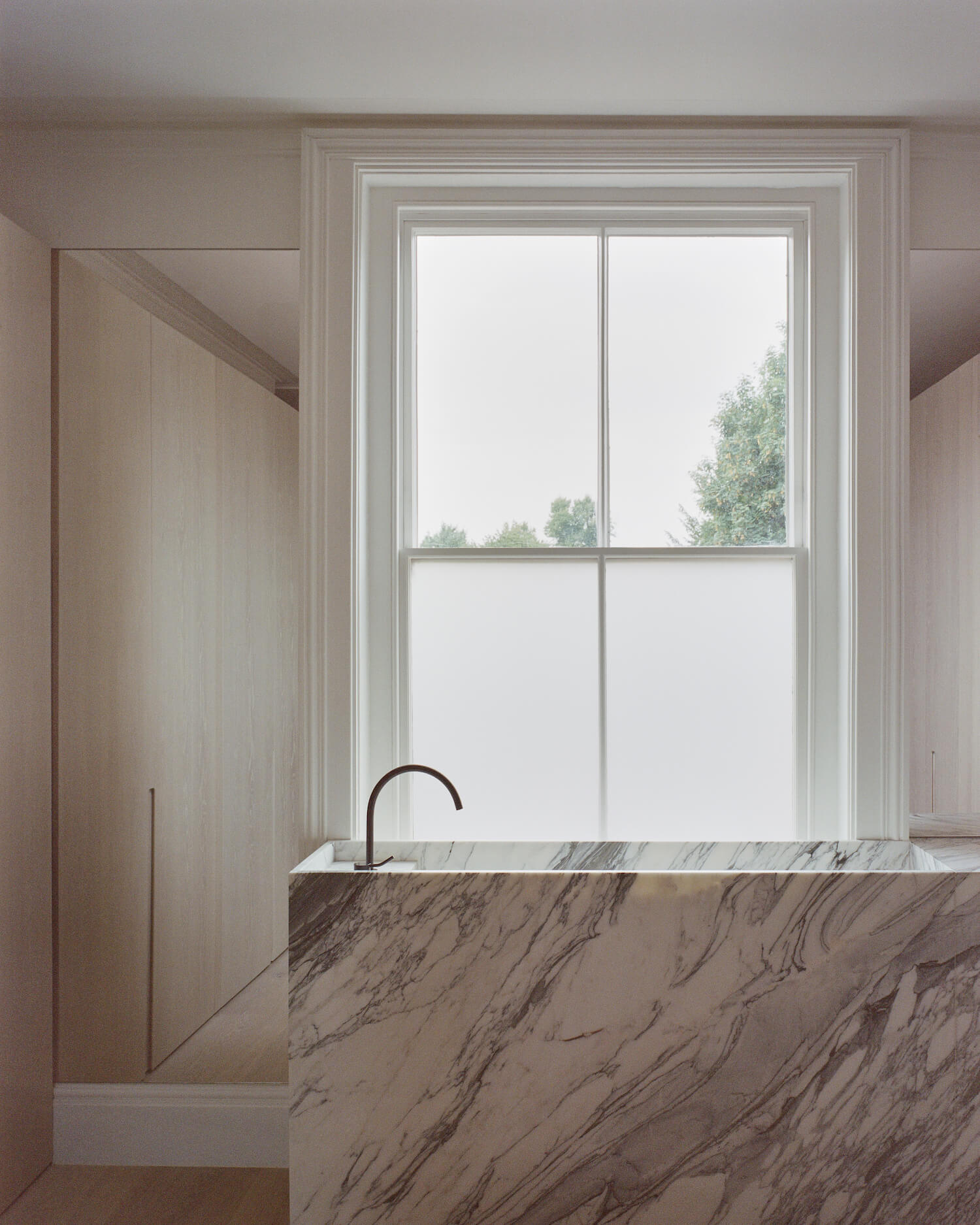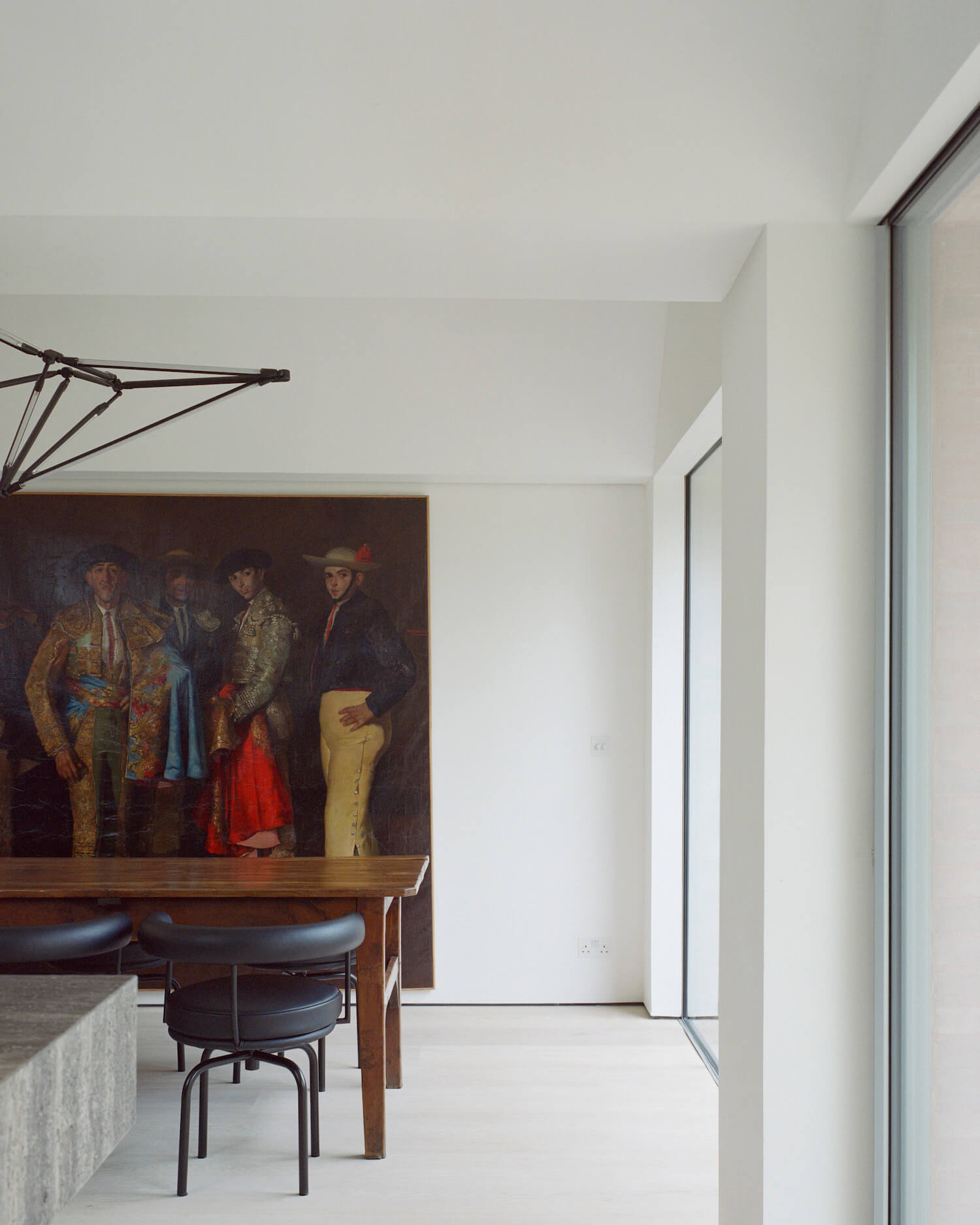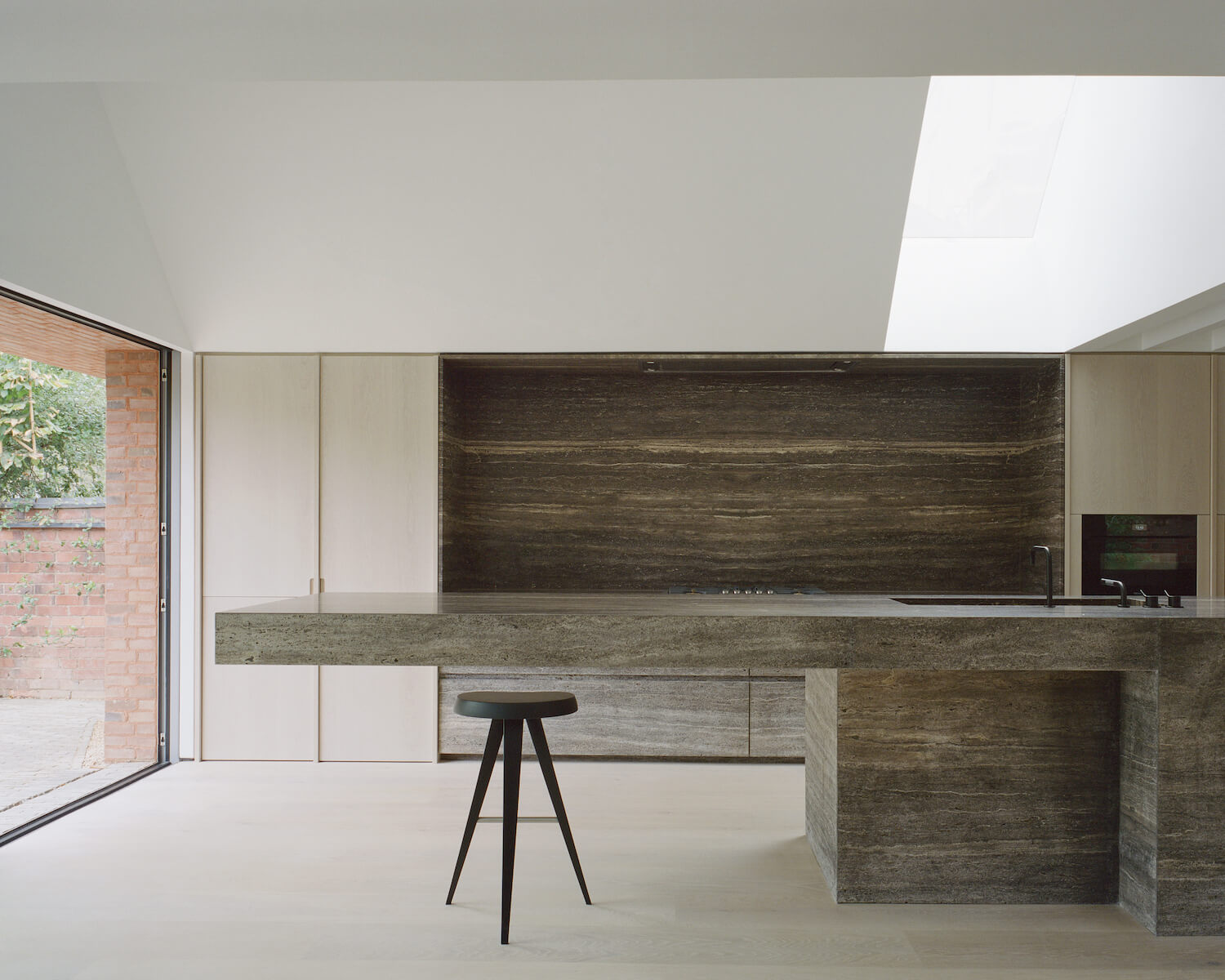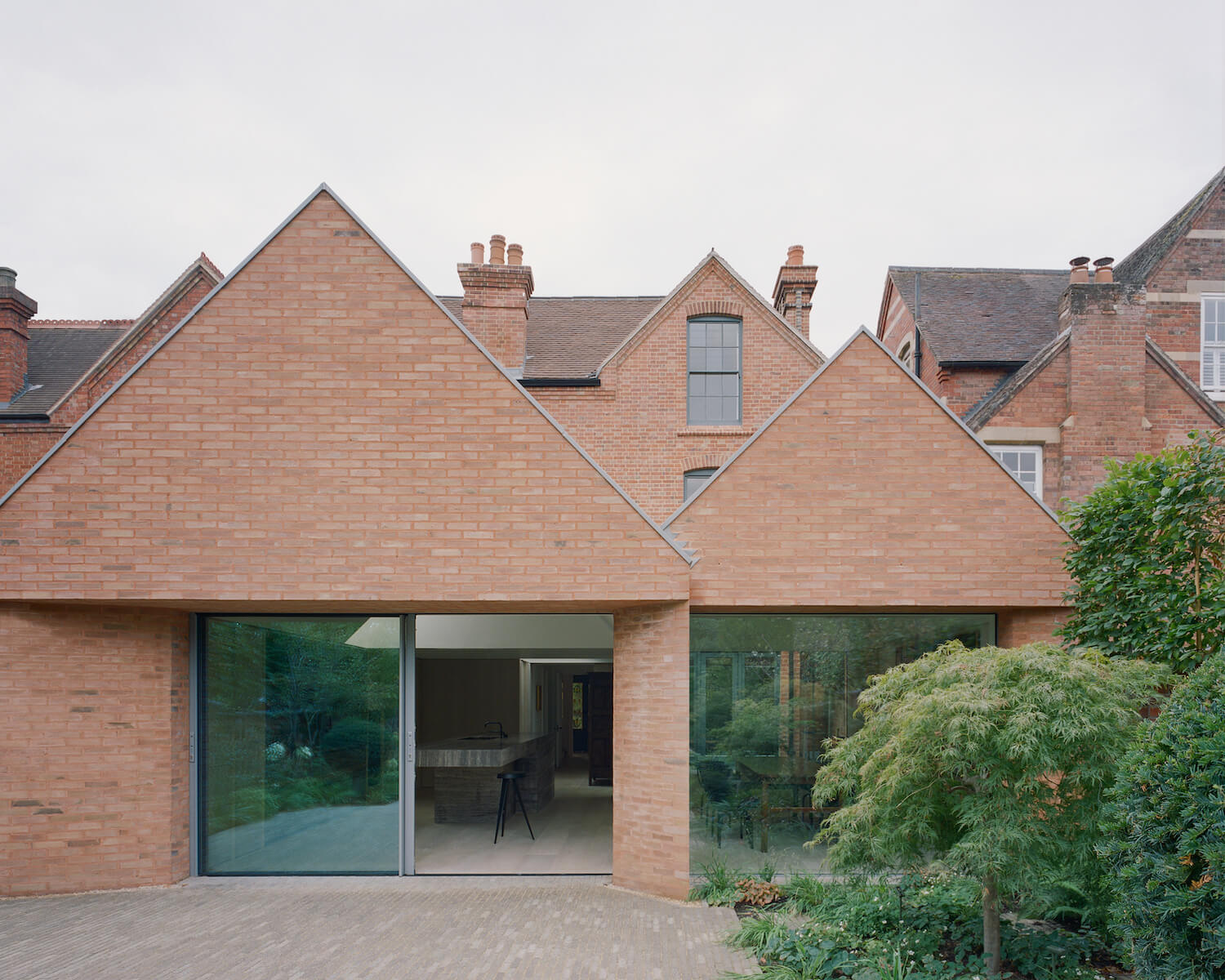 Ogród, zaprojektowany we współpracy z Seanem Walterem z Plant Specialist, wprowadza element wodny przypominający Tamizę, co stanowi ukłon w stronę pasji właścicieli do wioślarstwa. Wnętrze kontynuuje motyw cegły, który harmonijnie łączy się z dębową boazerią, usprawniając przestrzeń i eliminując wcześniejsze zatory. Sufit z odsłoniętymi belkami stropowymi dodaje charakteru i przestronności wejściu do dobudówki, a strategicznie rozmieszczone świetliki wprowadzają naturalne światło, poprawiając oświetlenie wnętrza.