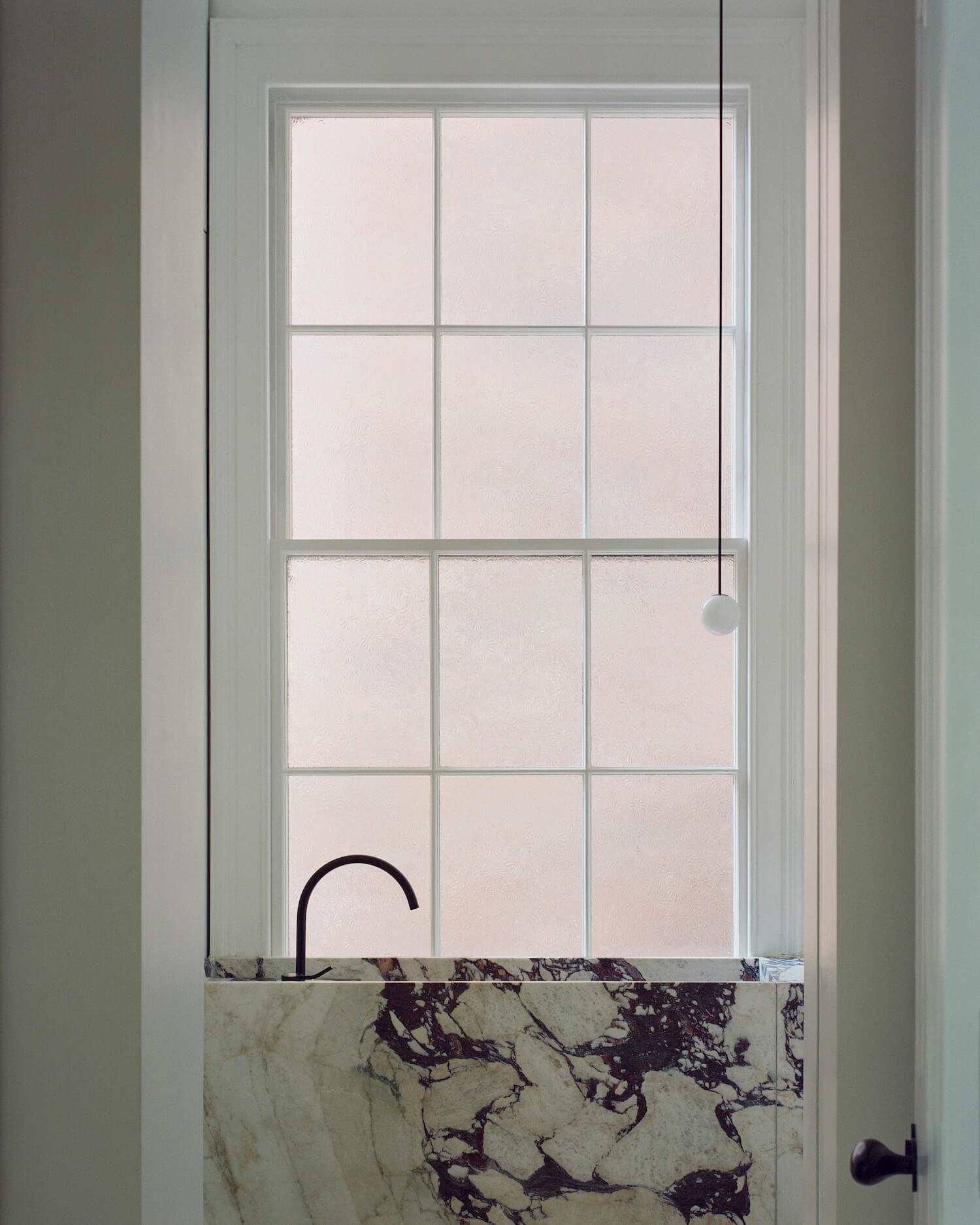 Renowacja okien od frontu willi obejmowała malowanie ram na elegancki szary kolor, który współgra z delikatnymi odcieniami cegieł. Górne poziomy domu zostały przebudowane, usuwając sufit, aby powiększyć przestrzeń i poprawić izolację, co zwiększyło efektywność energetyczną budynku. Wymiana dywanów i sklejki na dębowe deski podłogowe oraz staranna renowacja istniejących desek podkreślają dbałość o szczegóły i szlachetność zastosowanych materiałów.