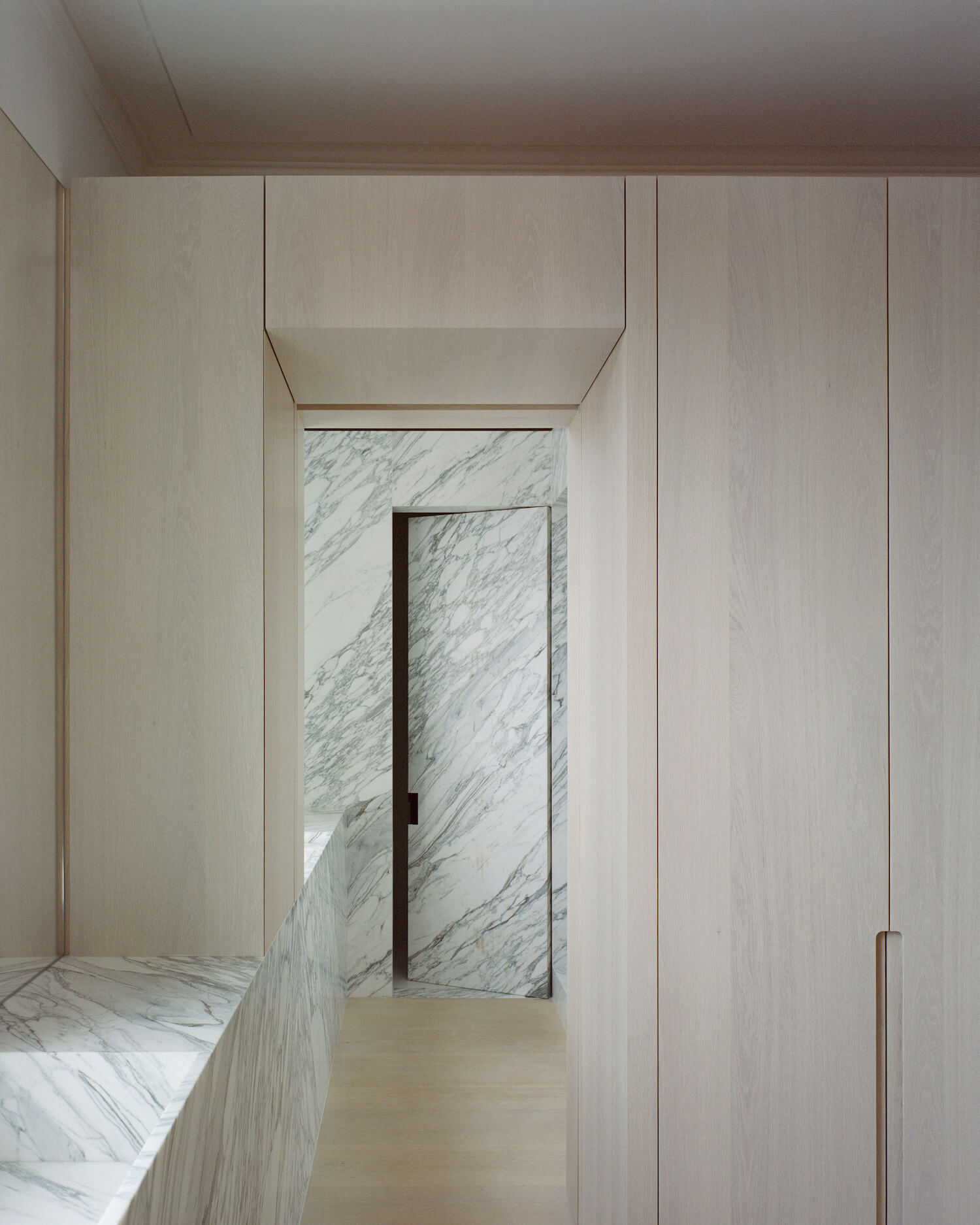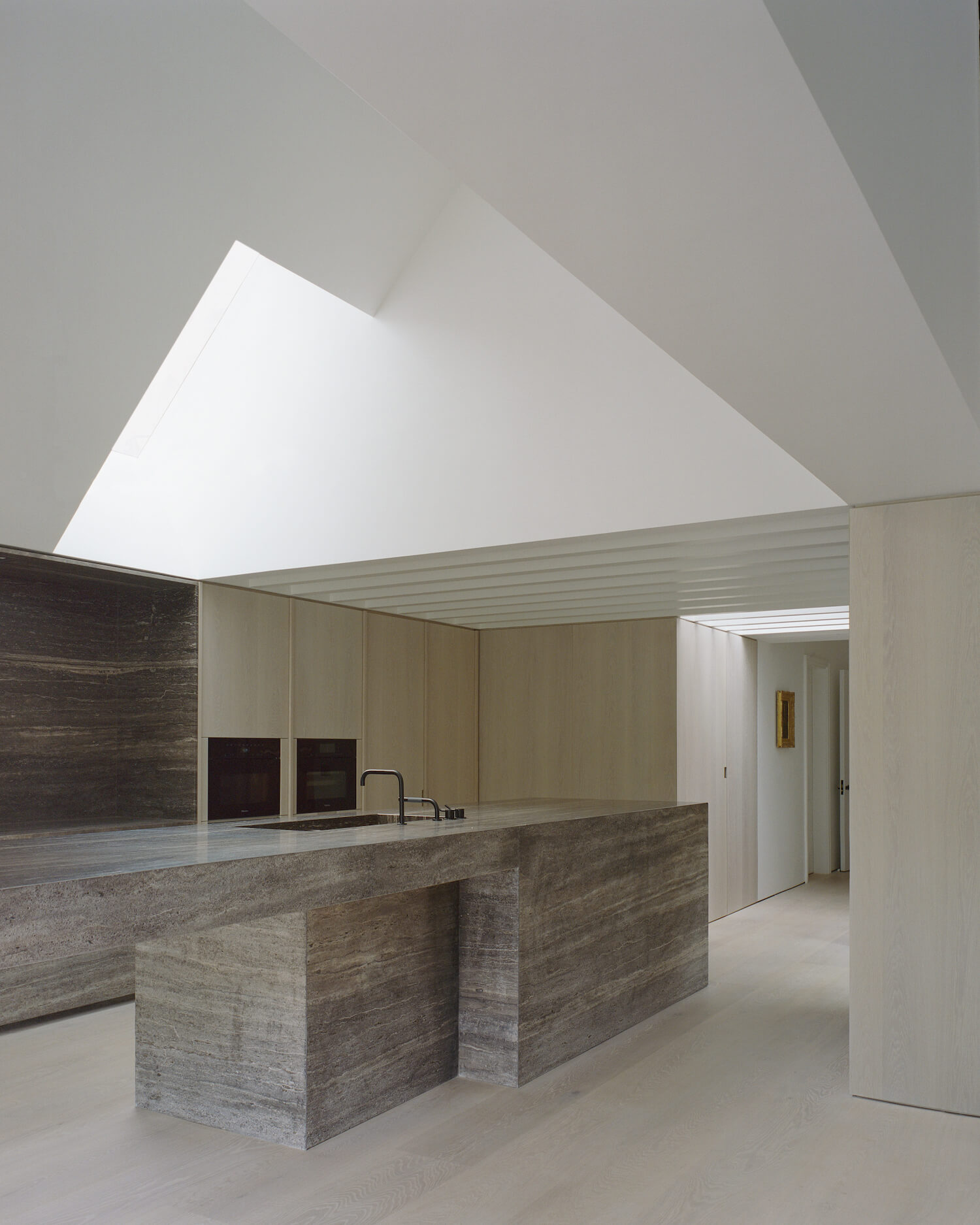 W kuchni znajduje się imponująca wyspa z włoskiego trawertynu tytanowego, z polerowaną powierzchnią i piaskowaną podstawą, która stanowi centralny punkt tego przestronnego pomieszczenia. Dębowa okładzina na ścianach i podłodze podkreśla kamienne elementy kuchni, tworząc subtelną równowagę między nowoczesnym minimalizmem a naturalnymi materiałami.